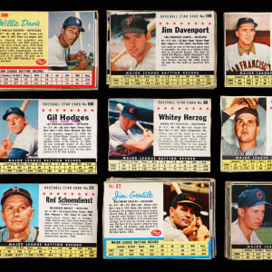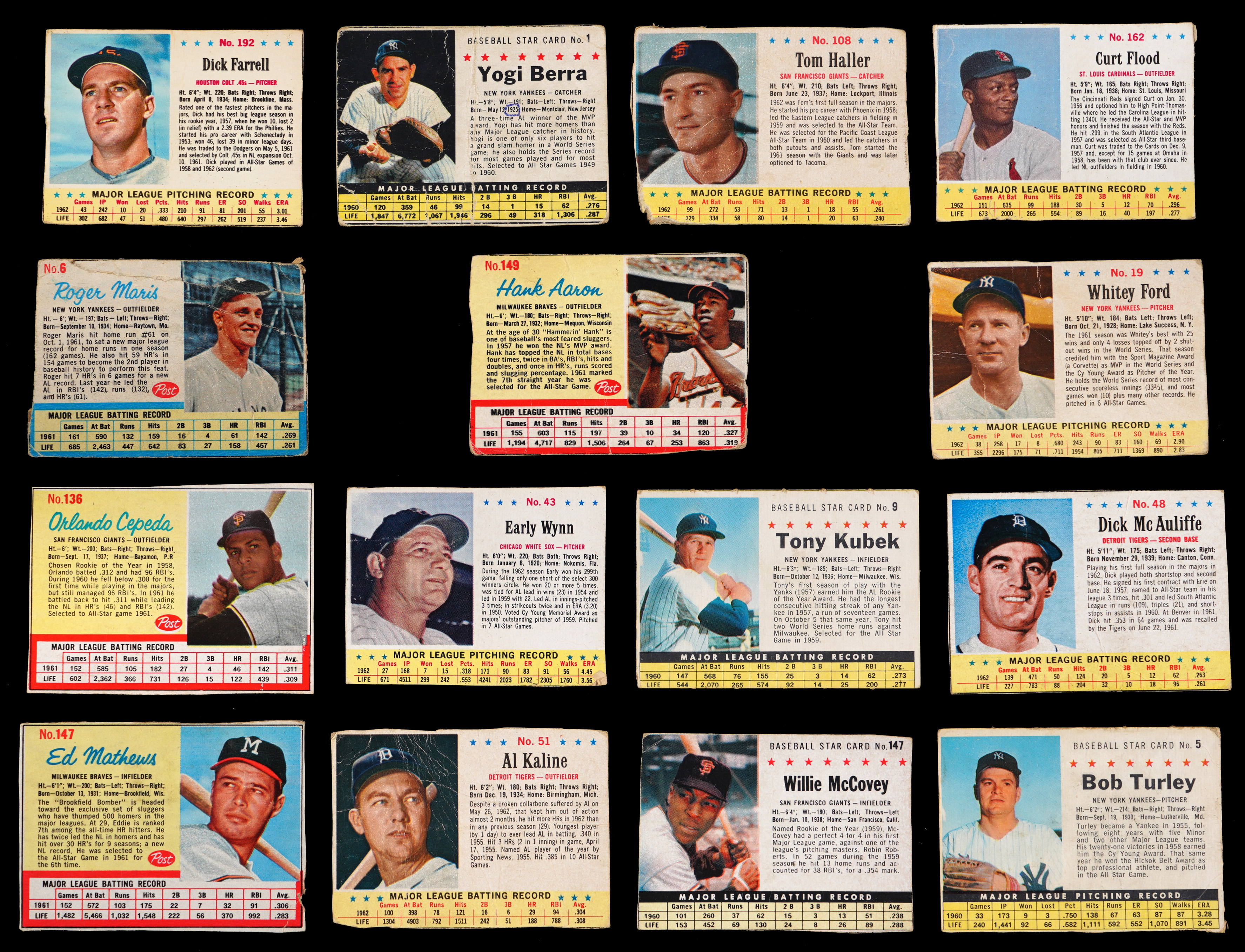 1962 Post: (32 cards, average FR) with #6 Maris (PR, reverse writing, box), #136 Cepeda (EX-MT), #147 Mathews (GD), #149 Aaron (FR), #155 Willey (PR, typed);