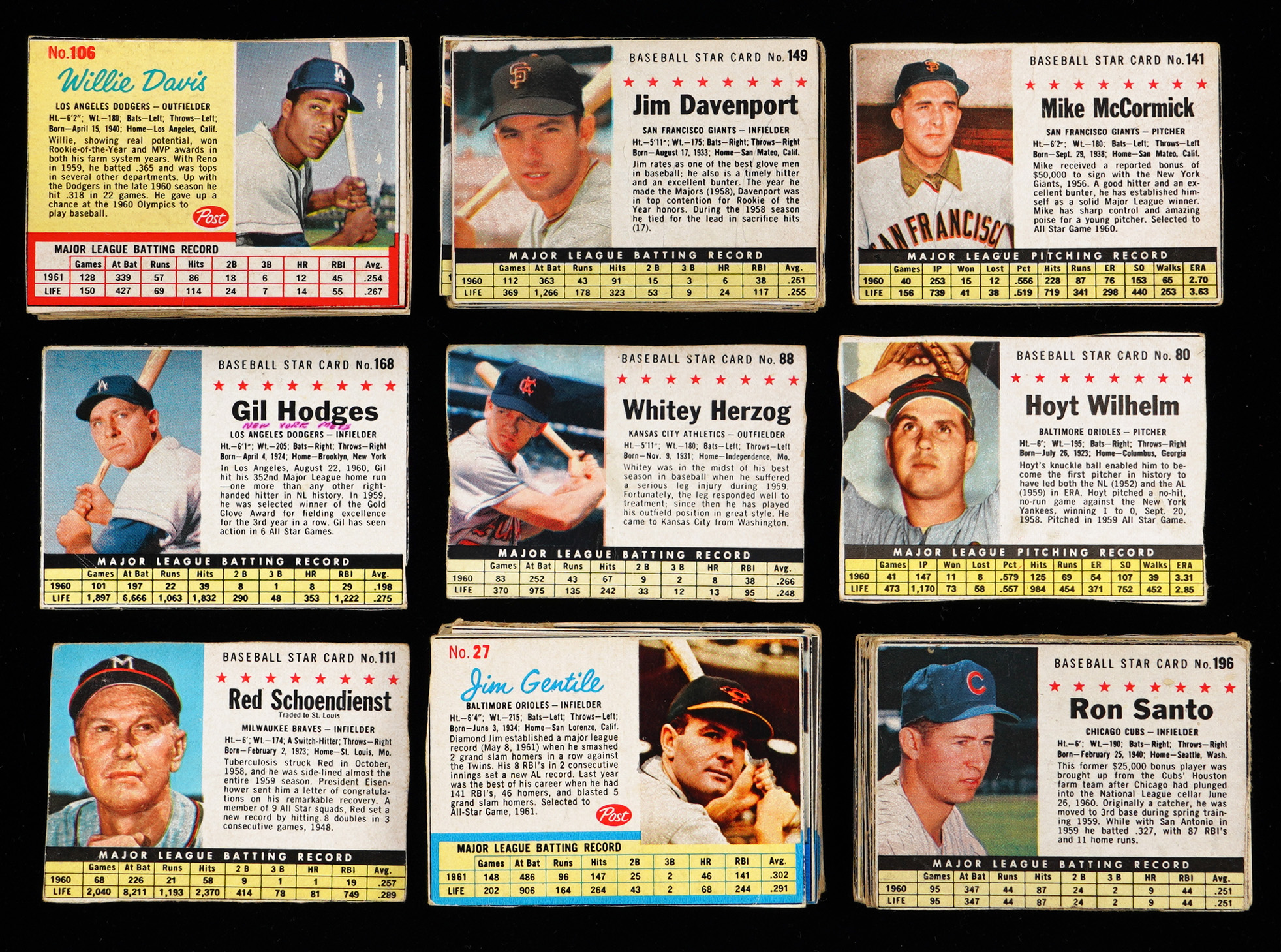 1961 Post: (46 cards, average FR) with #1 Berra (PR, writing, box), #5 Turley (GD, company), #9 Kubek (VG, company), #147 McCovey (FR, box), #154 Sanford (VG-EX, box);