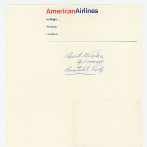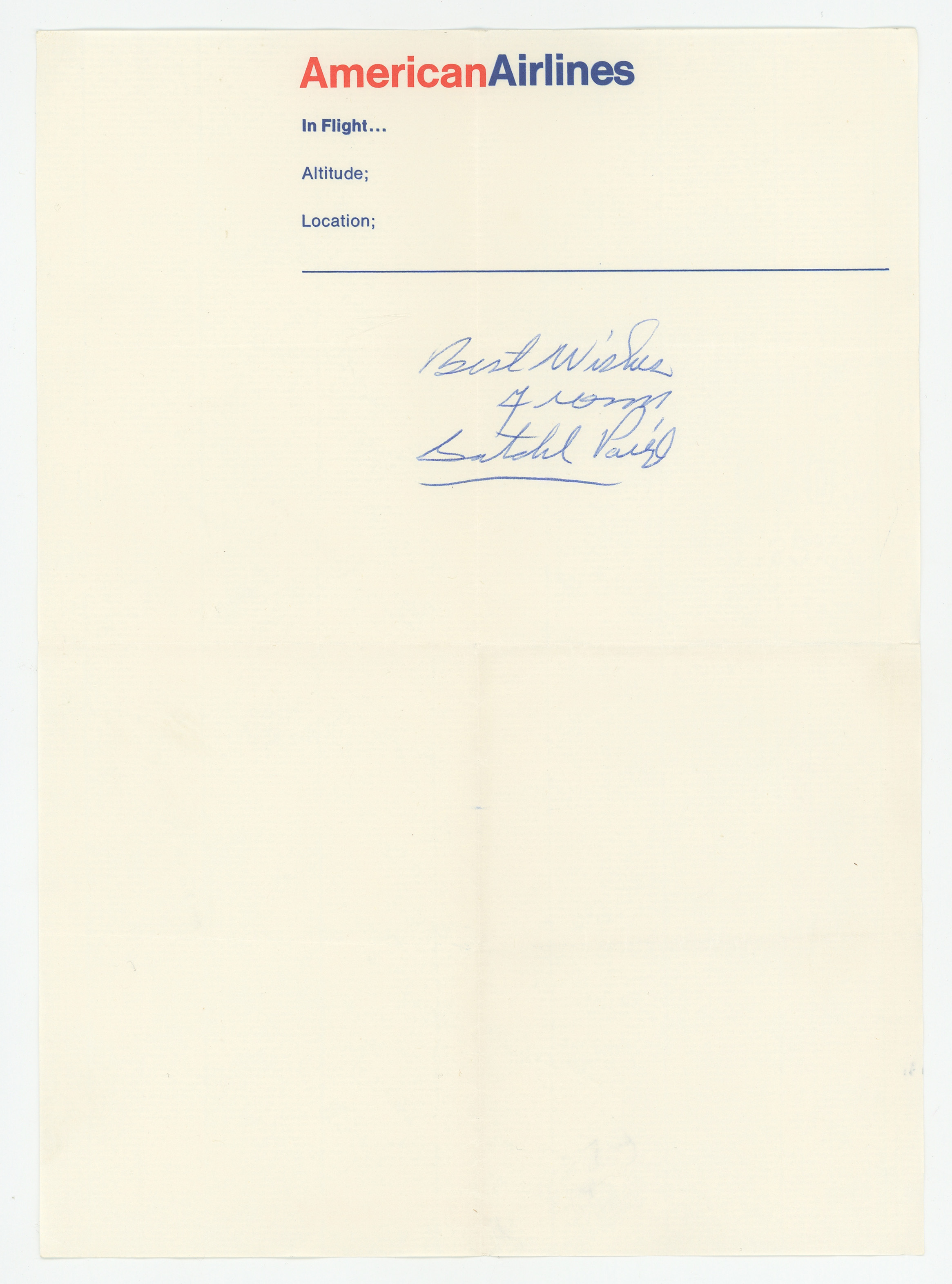 Take flight with this Satchel Paige signed American Airlines sheet. Folded thrice horizontally and once vertically, this vintage piece of stationery was intended for in-flight letter composition. A lucky passenger found a much better use for it, getting Paige to sign below the header. Paige (d.1982) complied in admirable fashion, providing a distinct signature, accompanied by the salutation "Best wishes from".