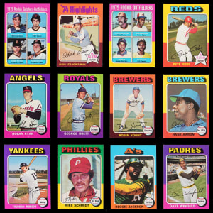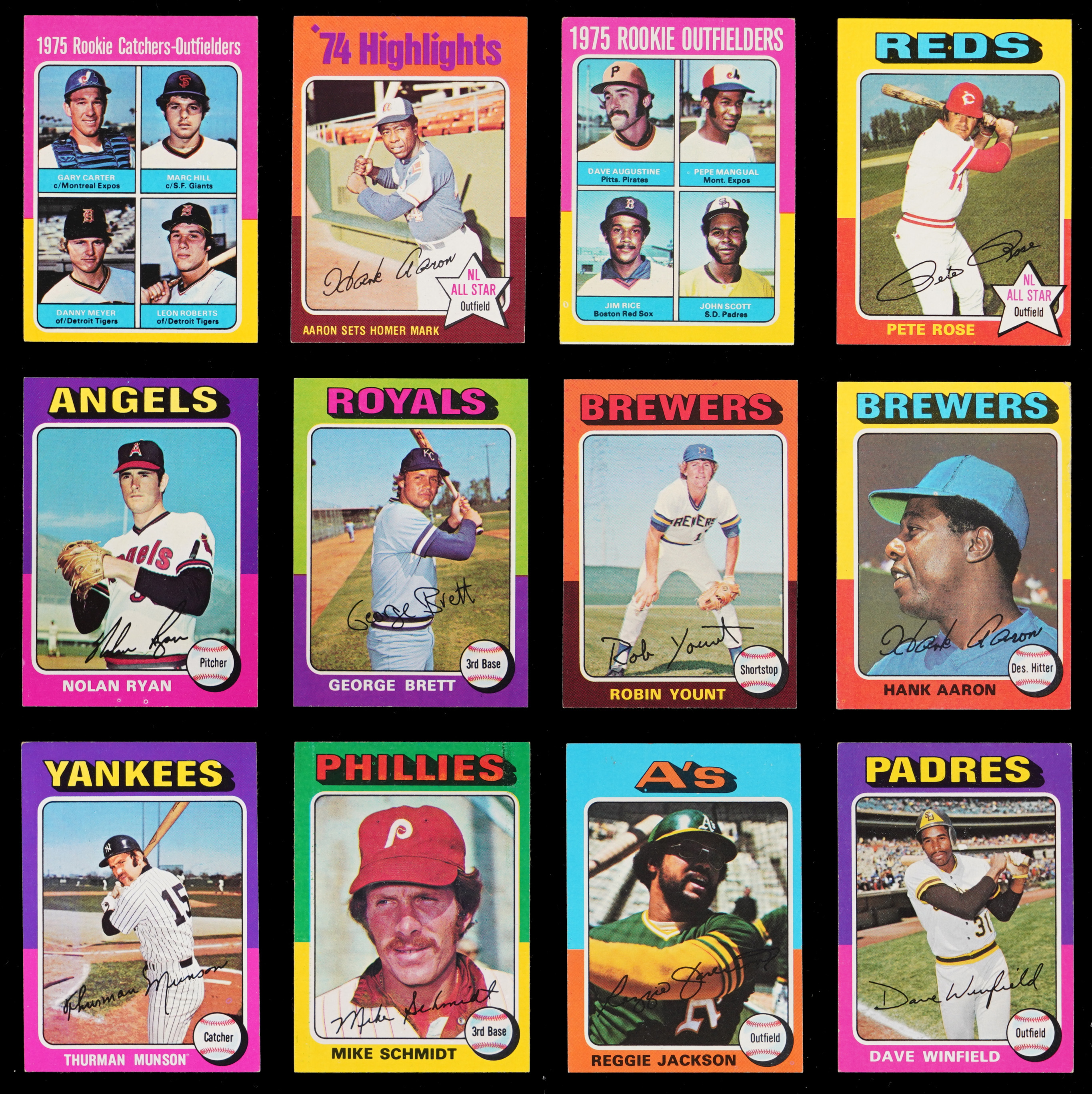 Stake your claim to the offered 1975 Topps complete set of (660) cards. This rookie-packed selection averages (EX-MT) condition with some better or lesser. Highlights include: #1 Aaron HL (EX-MT), #20 Munson (EX), #61 Winfield (EX-MT), #70 Schmidt (EX-MT), #223 Yount RC (EX-MT), #228 Brett RC (EX-MT), #300 R. Jackson (EX-MT), #320 Rose (EX), #500 R. Jackson (EX-MT), #616 Rice RC (EX), #620 Carter RC (EX-MT) and #660 Aaron (GD).