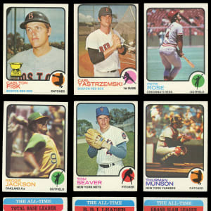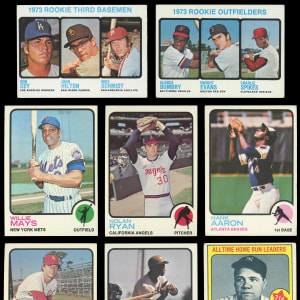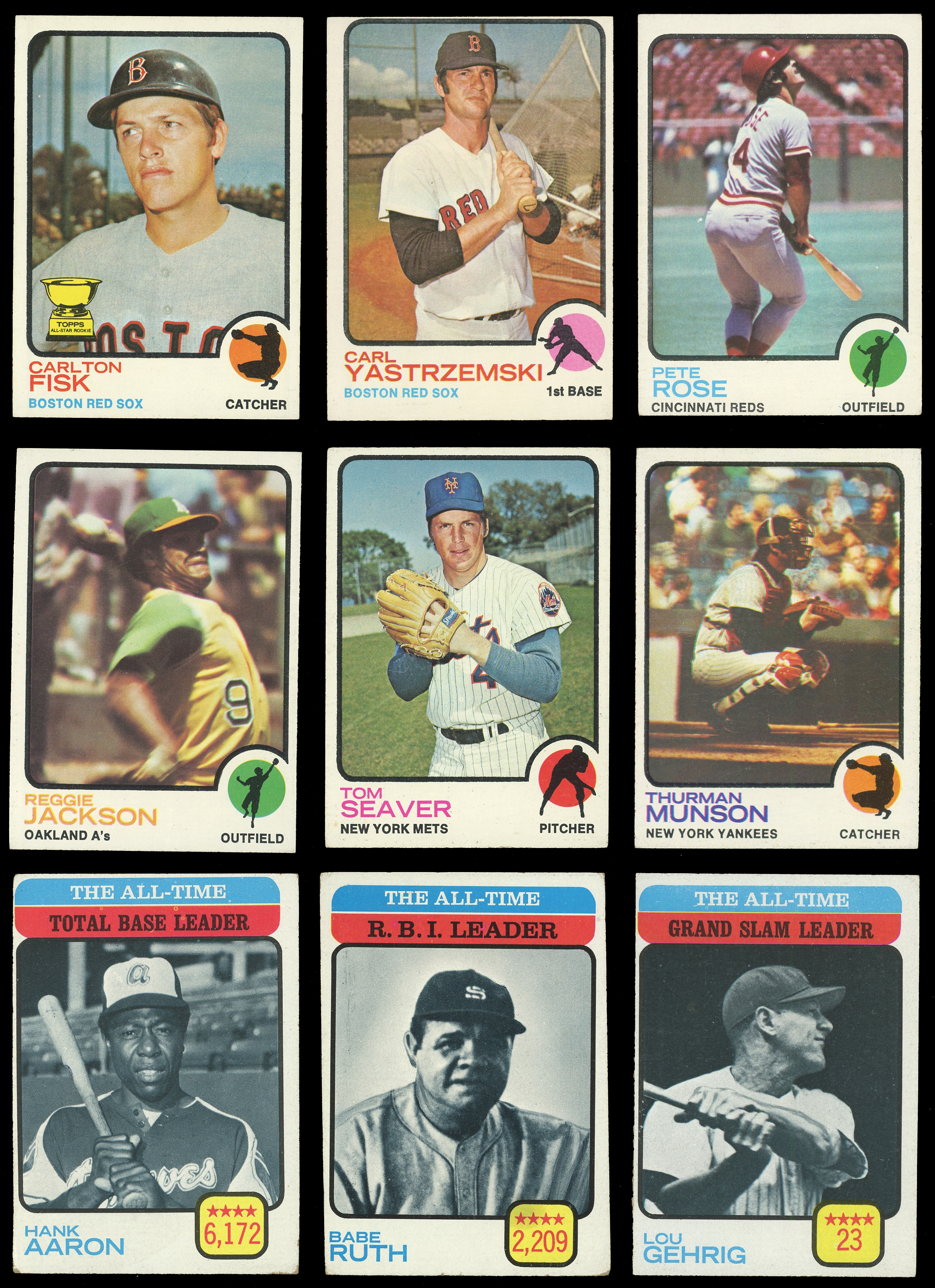 The premiere of Michael Jack Schmidt headlines the offered 1973 Topps complete set of (660) cards. This final multi-series edition generally presents in the (VG to EX) range with some better or lesser. Keys include: #1 Ruth/Aaron/Mays (GD), #50 Clemente (VG-EX), #100 Aaron (VG), #130 Rose (GD), #142 Munson (VG-EX), #174 Gossage RC (VG), #193 Fisk (EX), #220 Ryan (EX), #245 Yastrzemski (VG), #255 R. Jackson (EX), #305 Mays (EX), #350 Seaver (VG), #380 Bench (GD), #472 Gehrig LDR (VG), #473 Aaron LDR (FR), #474 Ruth LDR (FR), #588 CL (VG-EX), #613 Boone RC (VG), #614 Bumbry/Evans RC (GD) and #615 Schmidt RC (VG).