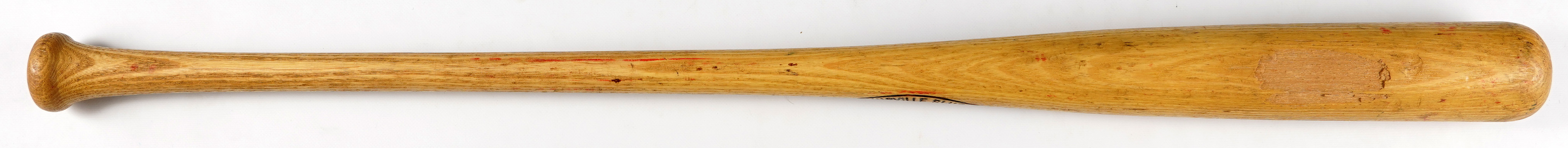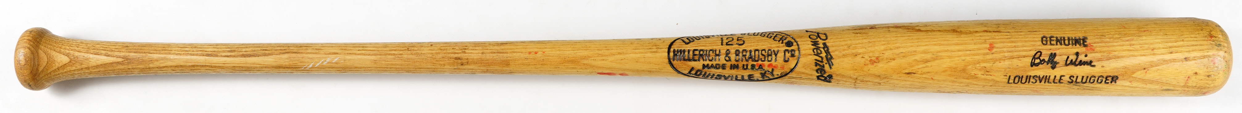 A key figure in the Philadelphia Phillies first ever World Series championship season is recalled, with this Bobby Wine pro model coach's bat. Dating from the early 1980s, this Louisville Slugger signature model bat shows extensive signs of use/wear. There's a 3" x 1-1/2" surface chip out of the barrel back, along with a variety of contact marks, bat rack streaks, and grain swelling up and down the barrel. There's also a light coating of tape adhesive residue on the handle. Wine's jersey number "7" is written on the knob over the impressed model number "K100", and a facsimile of his signature is burned into the barrel.