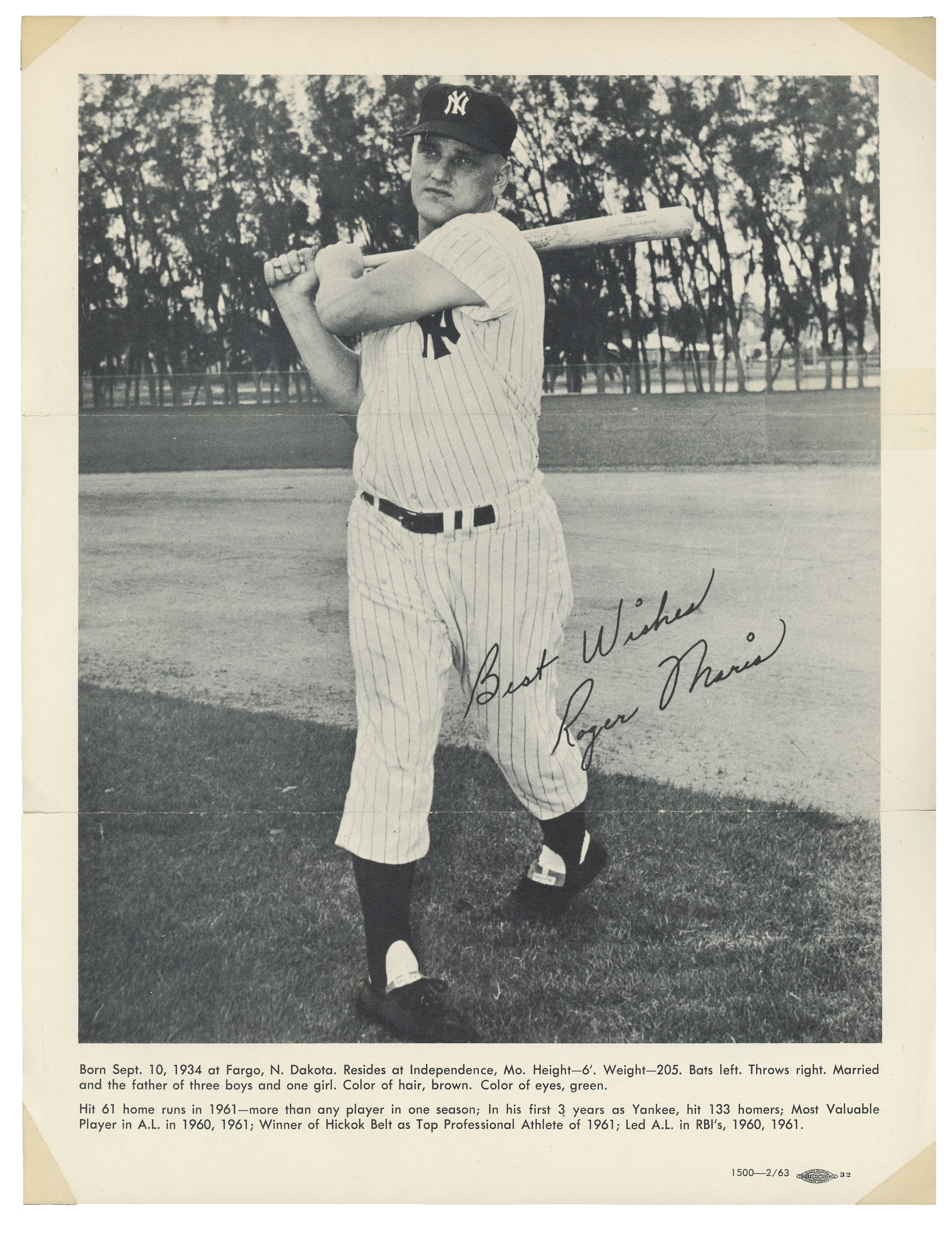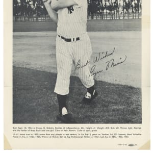 Scarce 1963 New York Yankees Tri-Fold #2 Roger Maris. This black-and-white action pose is printed on thin paper stock and measures 8-1/2 x 11" with three factory compacting folds. Beneath the slugger's full-body image are two paragraphs, the first with biographical information and the second notating career accomplishments. On the bottom right of the tri-fold is a union stamp along with text reading "1500-2/63" with the final digits confirming the date of production. Interestingly, through considerable research, we have been unable to locate the offered pose. While mounting tape is found on each corner along with a strip of clear tape on the upper right compacting fold including scattered creasing throughout, the overall presentation of this rarity is undeniable. The blank reverse displays light staining but is otherwise problem-free. A truly elusive artifact of the New York Yankees record breaker!