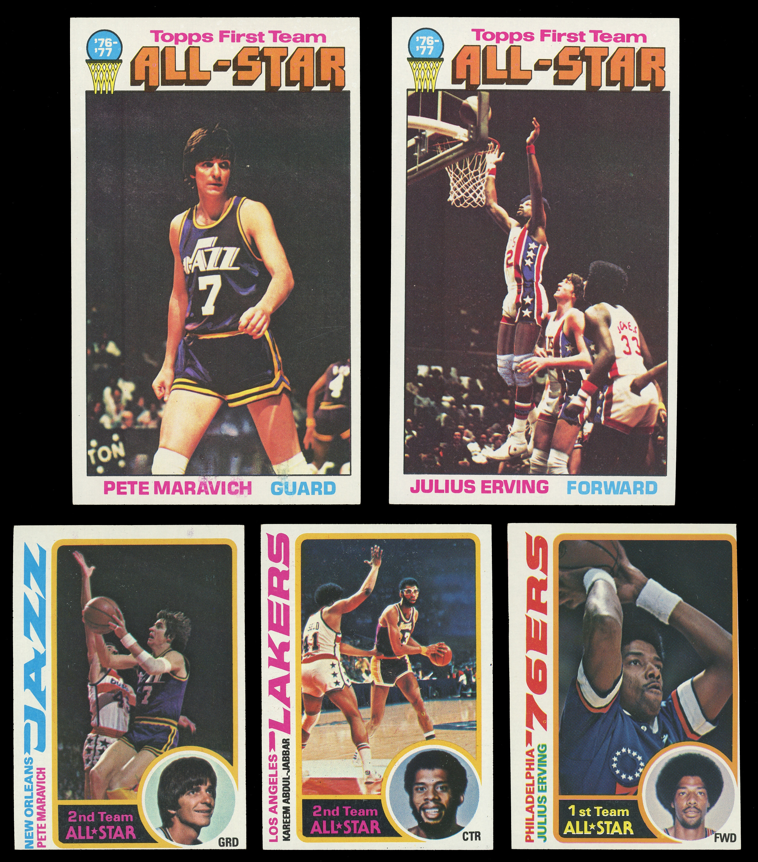 1976-1977 Topps near: (123/144, average EX-MT to NM) with #1 Erving (VG), #48 CL (marked), #57 Walton (VG-EX), #60 Maravich (EX), #68 Gervin (EX), #100 Abdul-Jabbar (EX-MT), #101 M. Malone (EX), #110 D. Thompson RC (EX), #126 Abdul-Jabbar AS (EX-MT), #127 Erving AS (NM), #130 Maravich AS (NM);