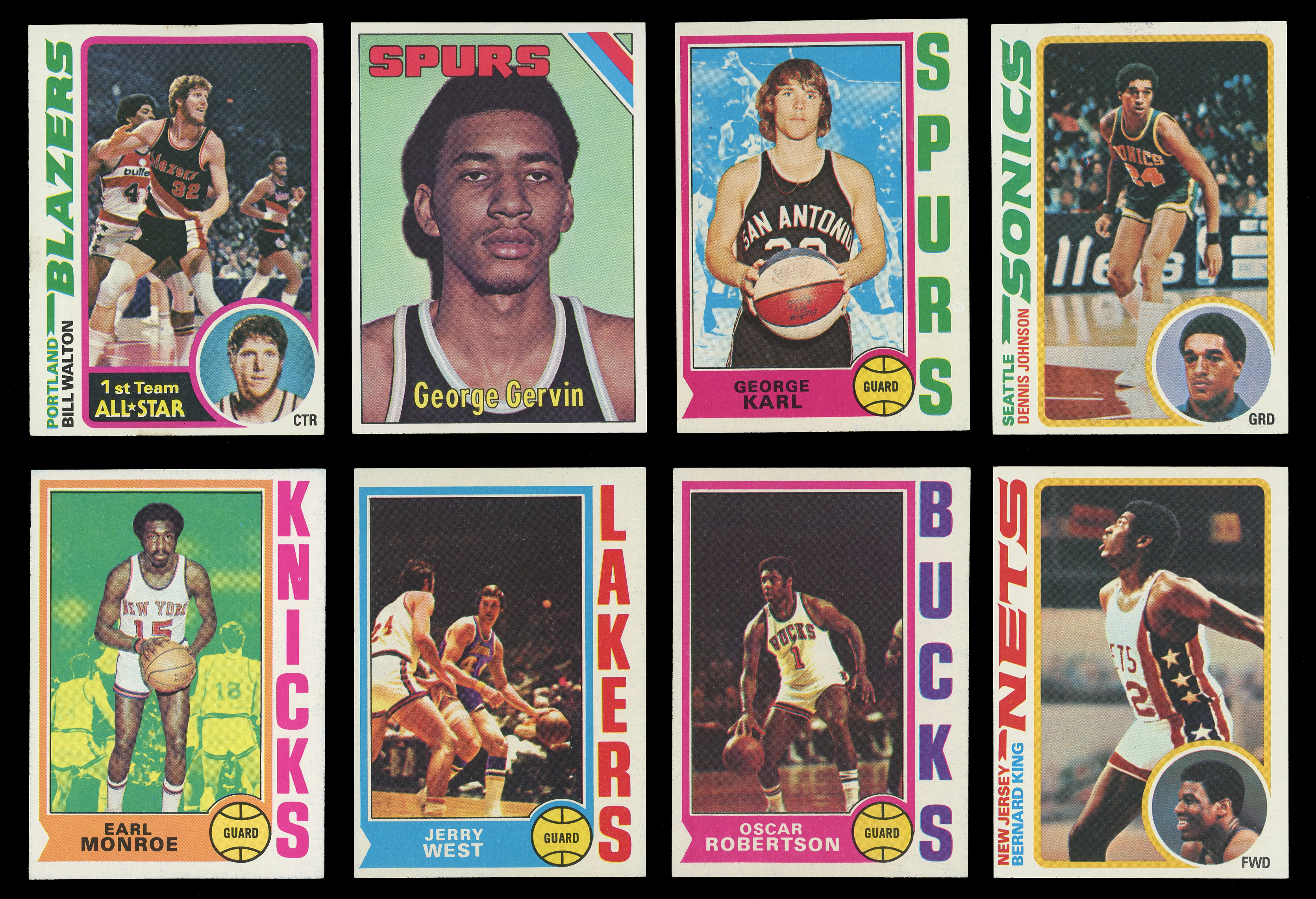 1974-1975 Topps partial: (207/264, average EX to EX-MT) with #25 Monroe (EX-MT), #39 Walton RC (EX), #55 Robertson (EX-MT), #176 West (EX), #196 Gervin RC (EX), #200 Erving (EX), #257 Karl RC (EX);