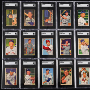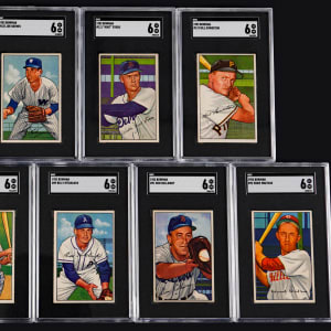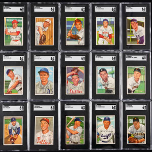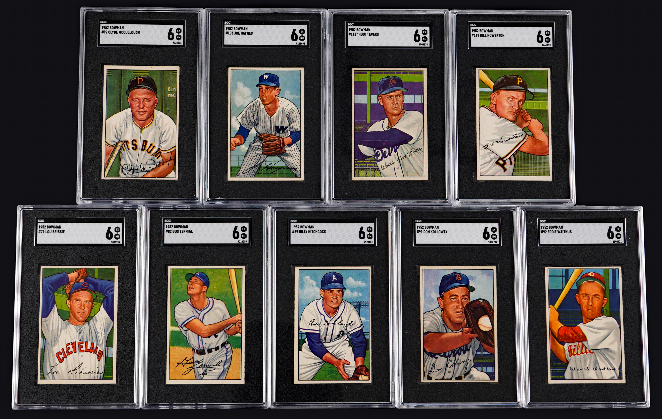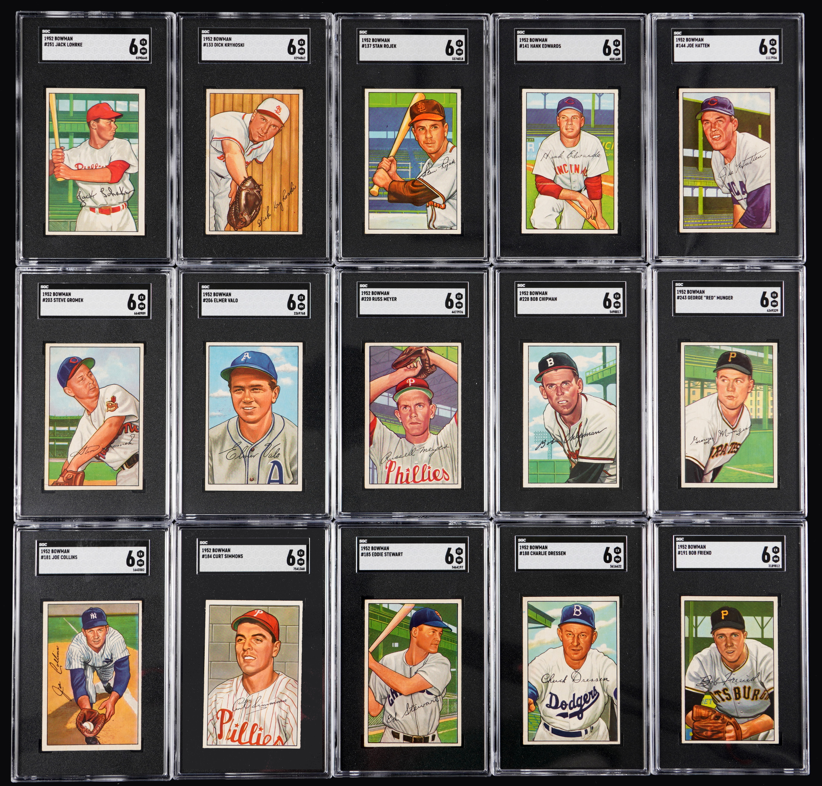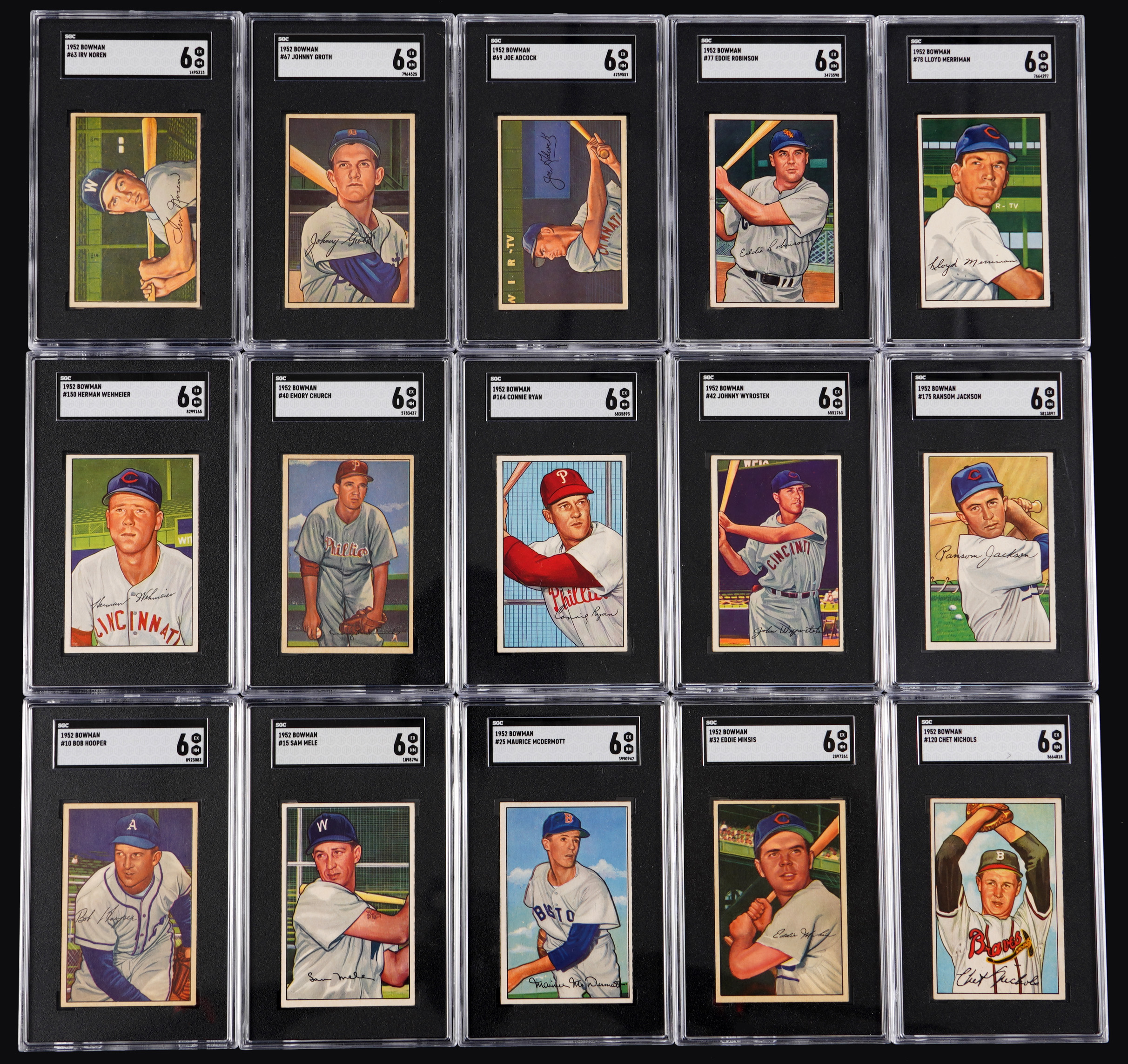 Each graded EX/NM 6 by SGC. Prime selection of (39) 1952 Bowman singles with (4) tougher high numbers. Includes: #10 Hooper, #15 Mele, #25 McDermott, #32 Miksis, #40 Church, #42 Wyrostek, #63 Noren, #67 Groth, #69 Adcock, #77 E. Robinson, #78 Merriman, #79 Brissie, #82 Zernial, #89 Hitchcock, #91 Kolloway, #92 Waitkus, #99 McCullough, #103 Haynes, #111 Evers, #119 Howerton, #120 Nichols, #133 Kryhoski, #137 Rojek, #141 Edwards, #144 Hatten, #150 Wehmeier, #164 Ryan, #175 Ra. Jackson, #181 J. Collins, #184 Simmons, #185 Stewart, #188 Dressen, #191 Friend, #203 Gromek, #206 Valo, #220 Meyer, #228 Chipman, #243 Munger and #251 Lohrke.