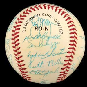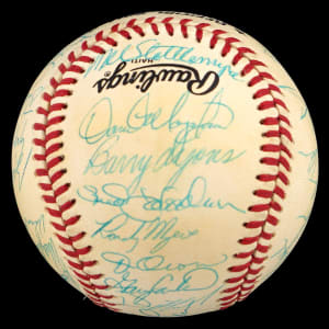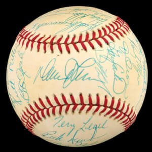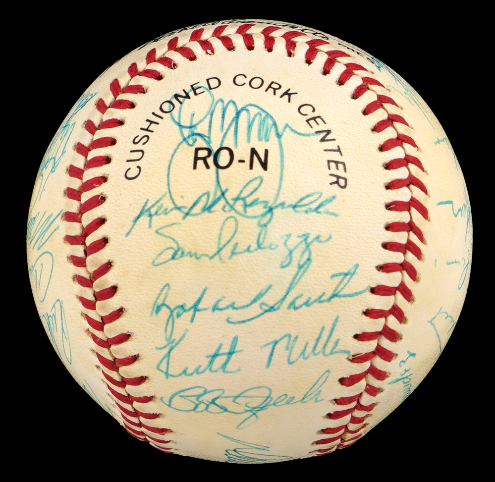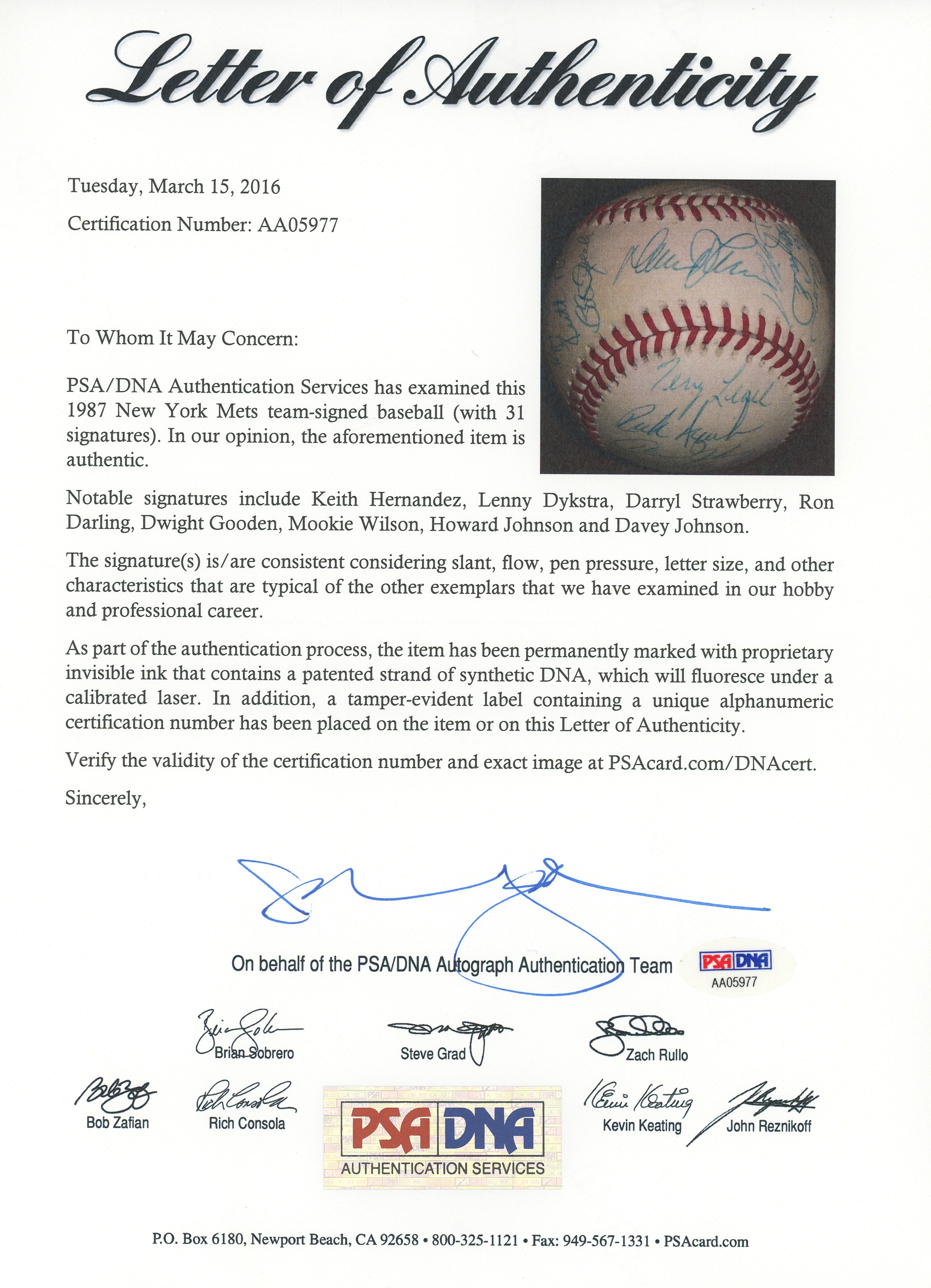 Notable signatures include Keith Hernandez, Len Dykstra, Darryl Strawberry, Ron Darling, Dwight Gooden, Mookie Wilson, Howard Johnson and Davey Johnson.