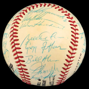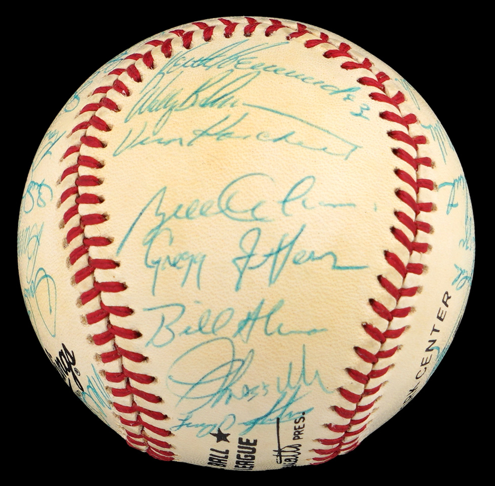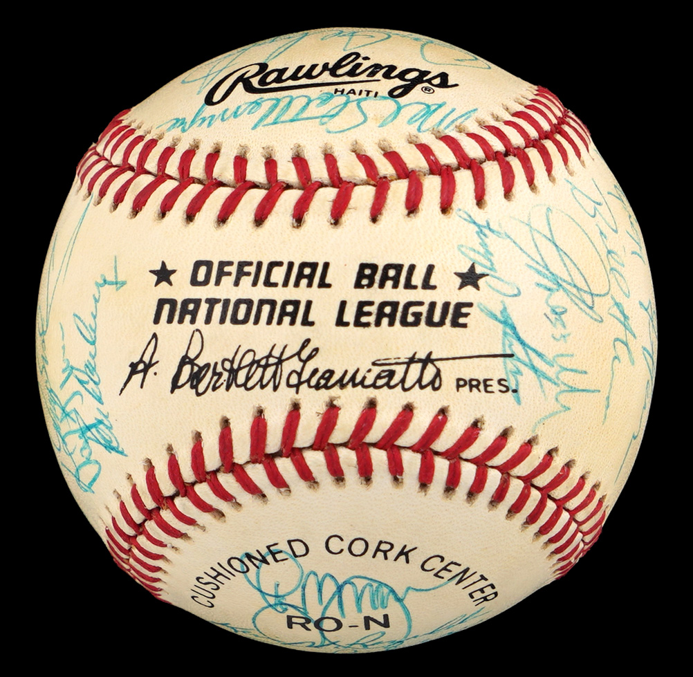The 1987 Mets finished second to St. Louis in the National League. This creamy to white ONL/Giamatti ball is signed by (31) members of that team averaging (“8-9”).