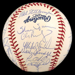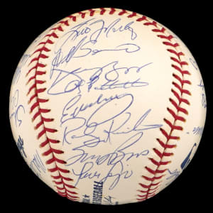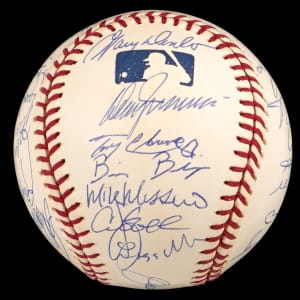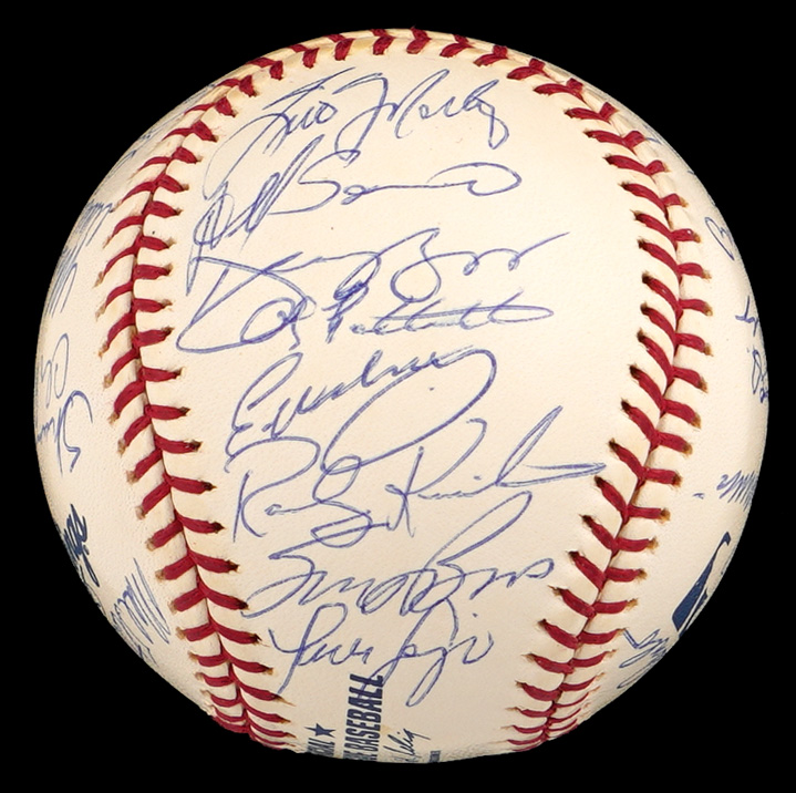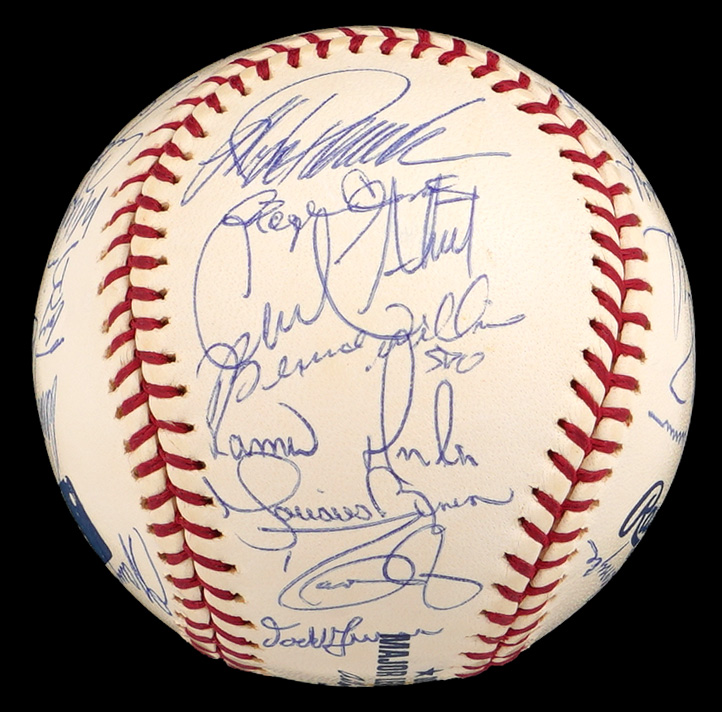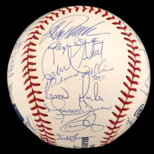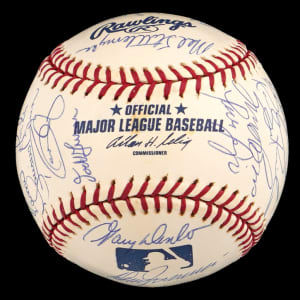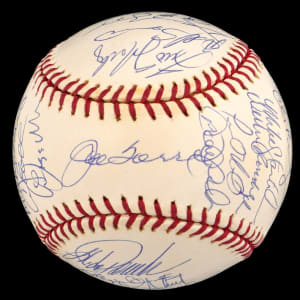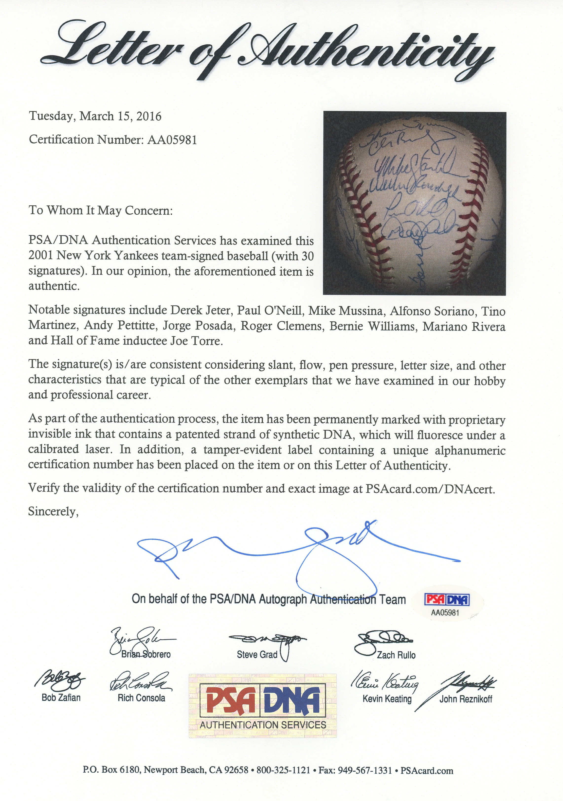 The 2001 American League Champion New York Yankees lost to the Arizona Diamondbacks in a thrilling 7-game series. This white OML/Selig ball is signed by (30) members of that team that took it to the final game with smart ("9-10") signatures. Notable signees include Derek Jeter, Paul O'Neill, Mike Mussina, Alfonso Soriano, Tino Martinez, Andy Pettite, Jorge Posada, Roger Clemens, Bernie Williams, Mariano Rivera and Joe Torre.