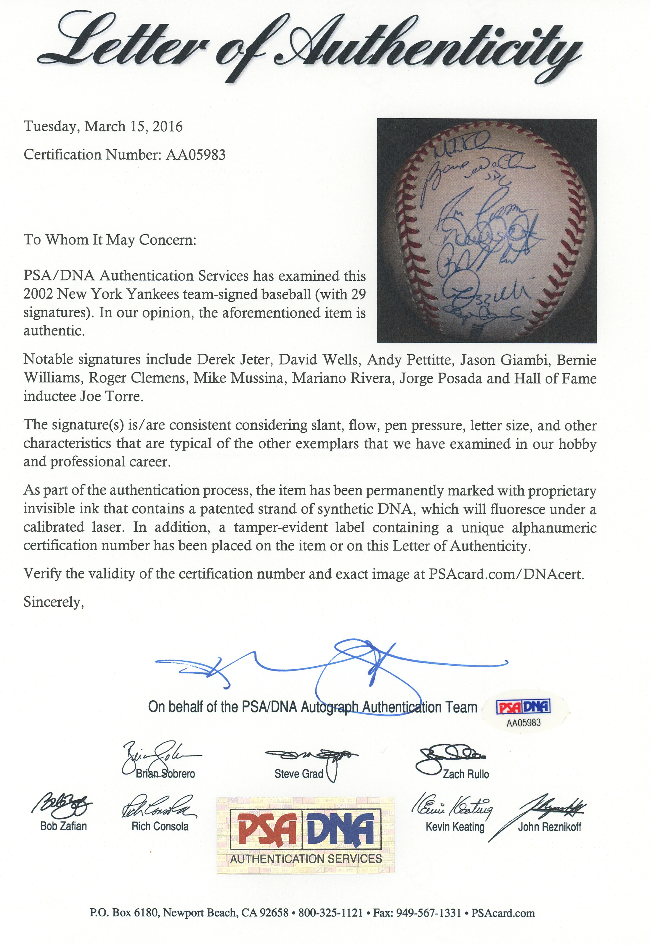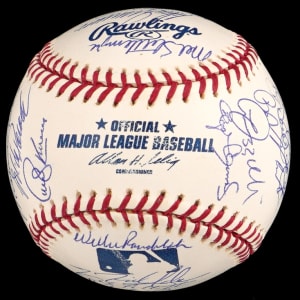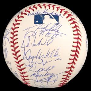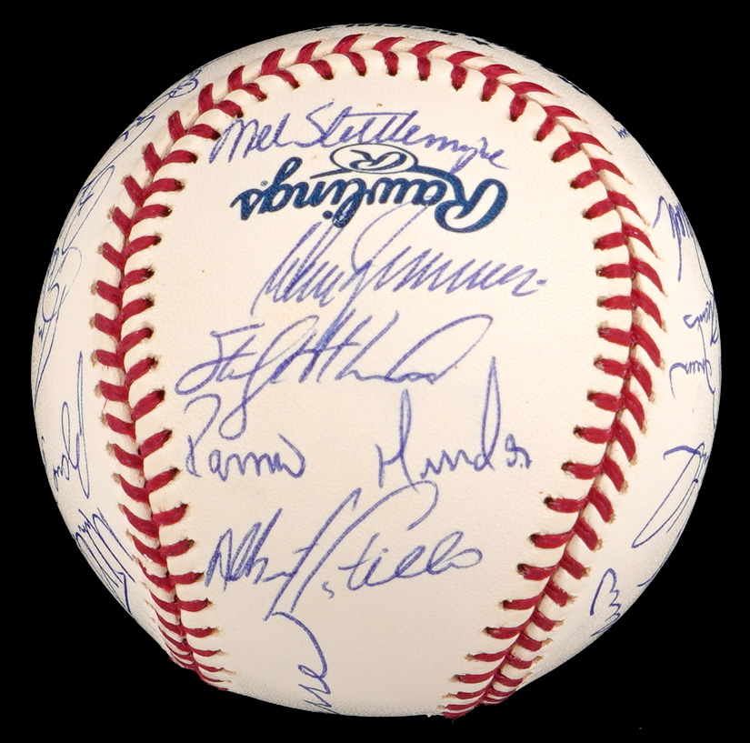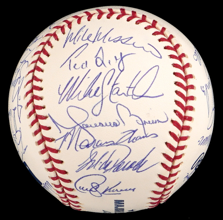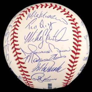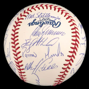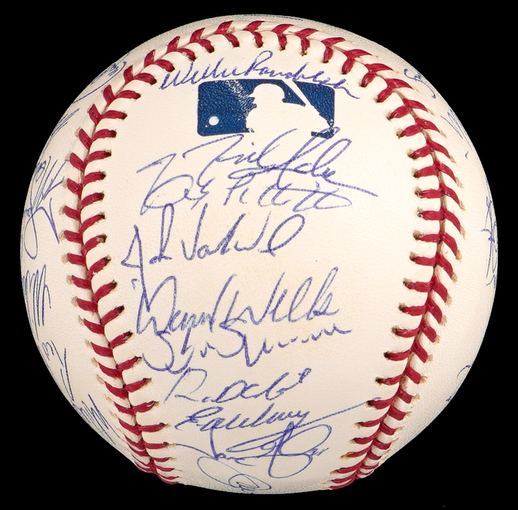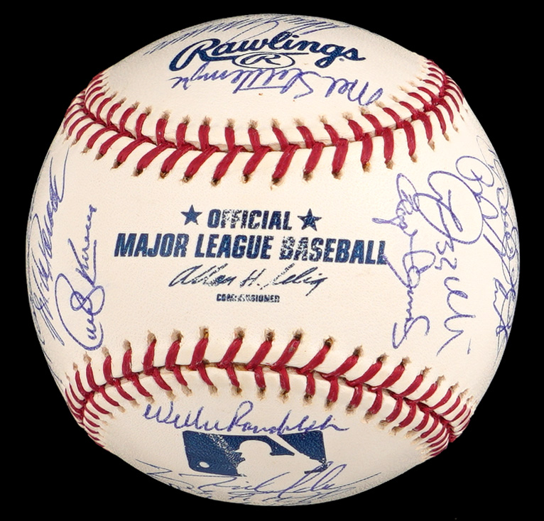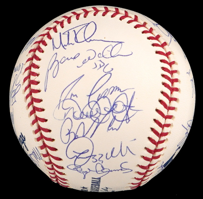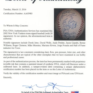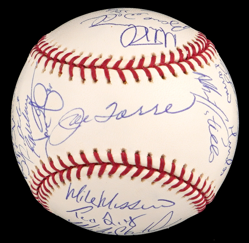 The 2002 season was the 100th season for the New York Yankees. The team won the division, but they were defeated by the Angels in four games in the Championship round. This 2002 team-signed white OML/Selig ball has (29) signatures averaging (“9-10”). Notable signatures include Derek Jeter, David Wells, Andy Pettite, Jason Giambi, Bernie Williams, Roger Clemens, Mike Mussina, Mariano Rivera, Jorge Posada and Joe Torre.
