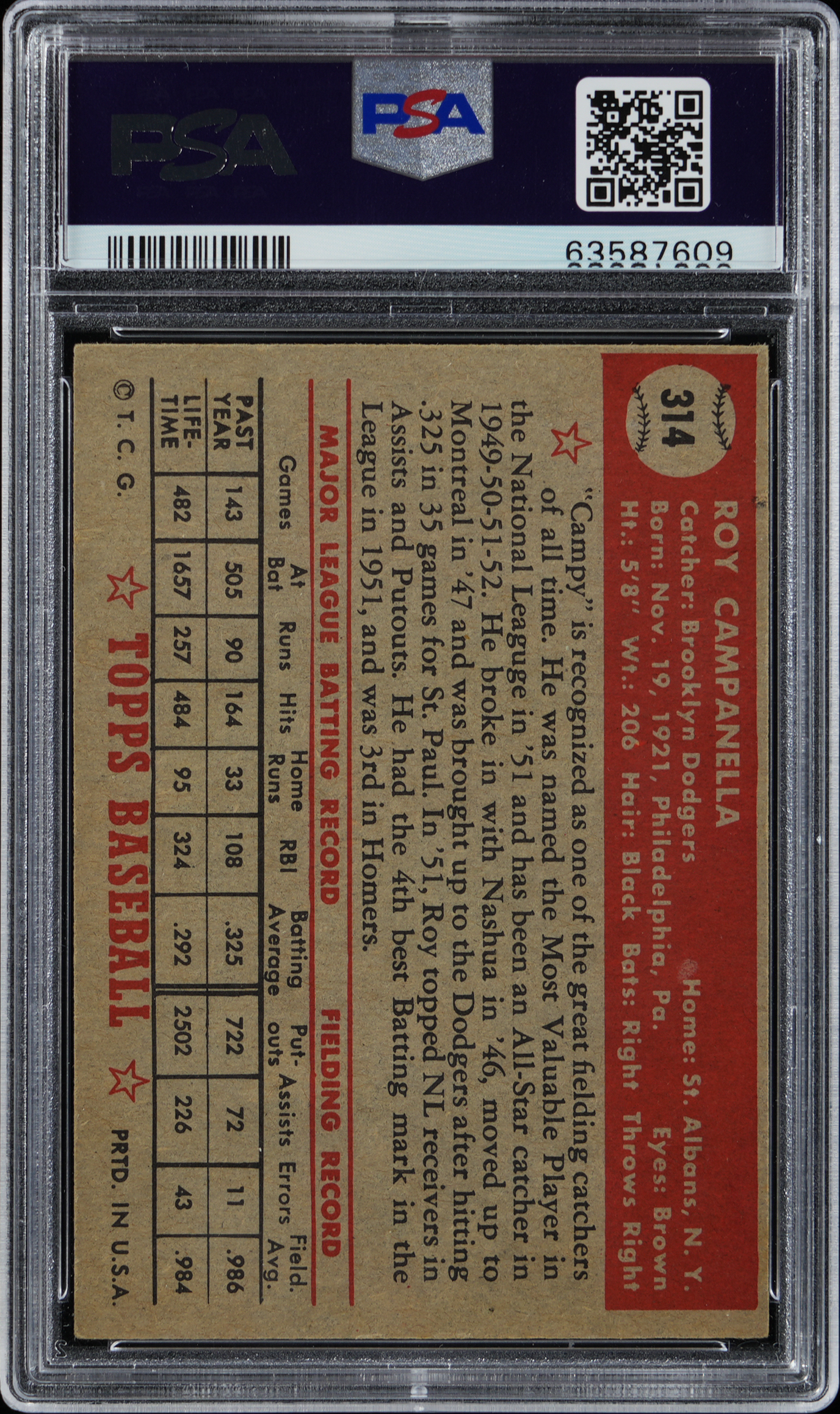 Graded EX 5 by PSA. A profile in courage, the inspirational Roy Campanella commands the offered 1952 #314 high number. This eye-catching specimen of the Brooklyn Dodgers Hall of Famer exhibits strong visual features by showcasing four slightly touched corners, crisp edges and vibrant player/uniform accents. Additionally, the reverse which touts "Campy's" many accomplishments is stain-free.