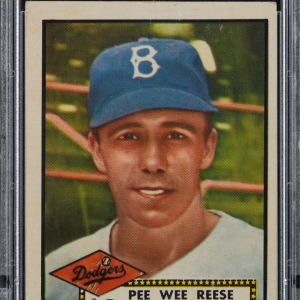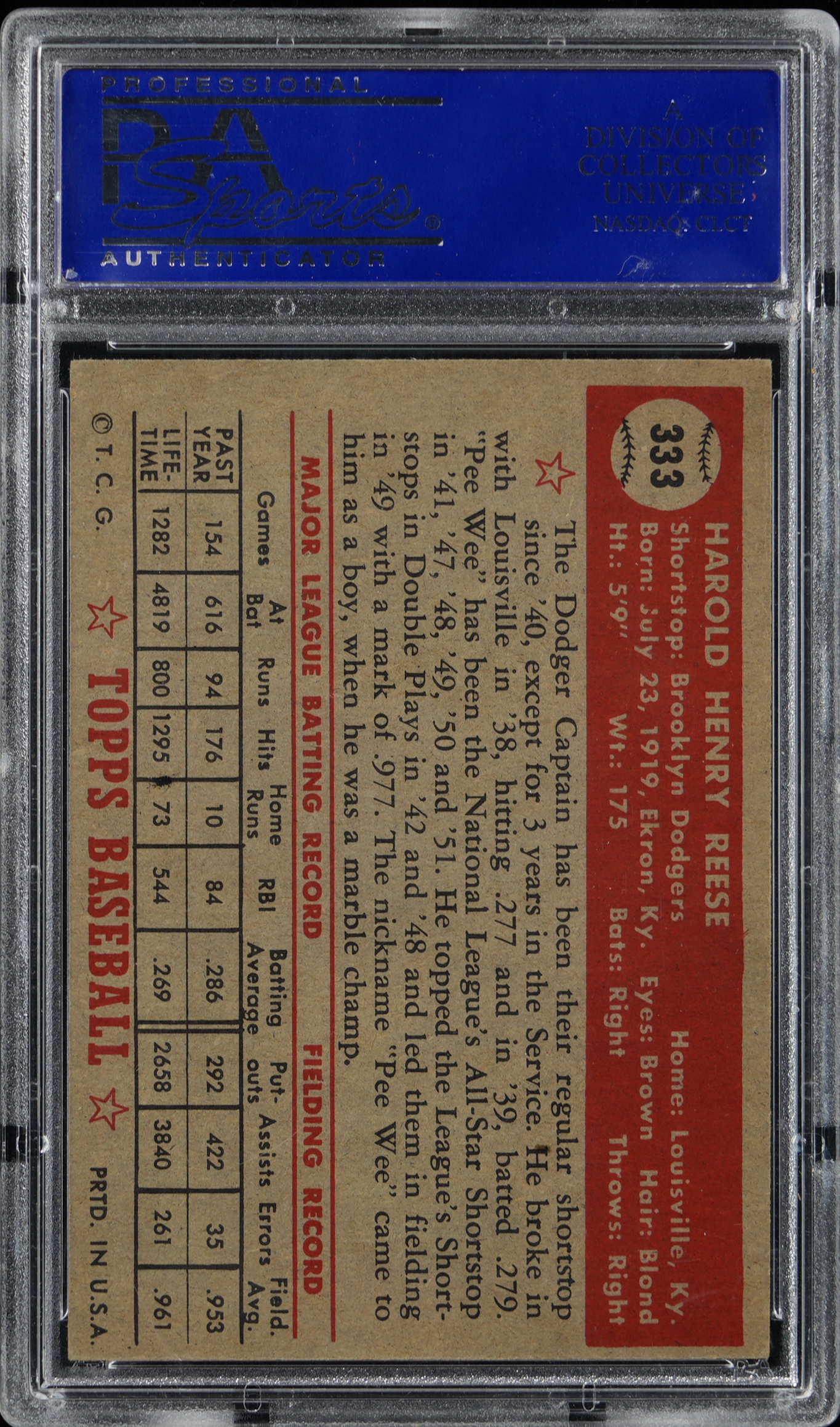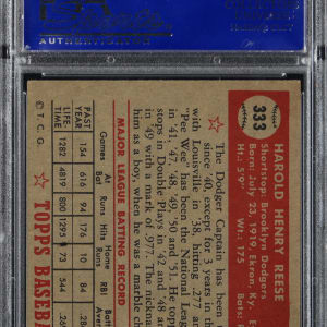 Graded EX-MT 6 by PSA. While small in stature, Harold (Pee Wee) Reese casts a mighty profile on his 1952 Topps #333 high number. This Brooklyn Hall of Fame shortstop is crease-free with crisp corners, creamy white edges and splendid player/uniform surface colors. The biographical reverse is wax stain-free.