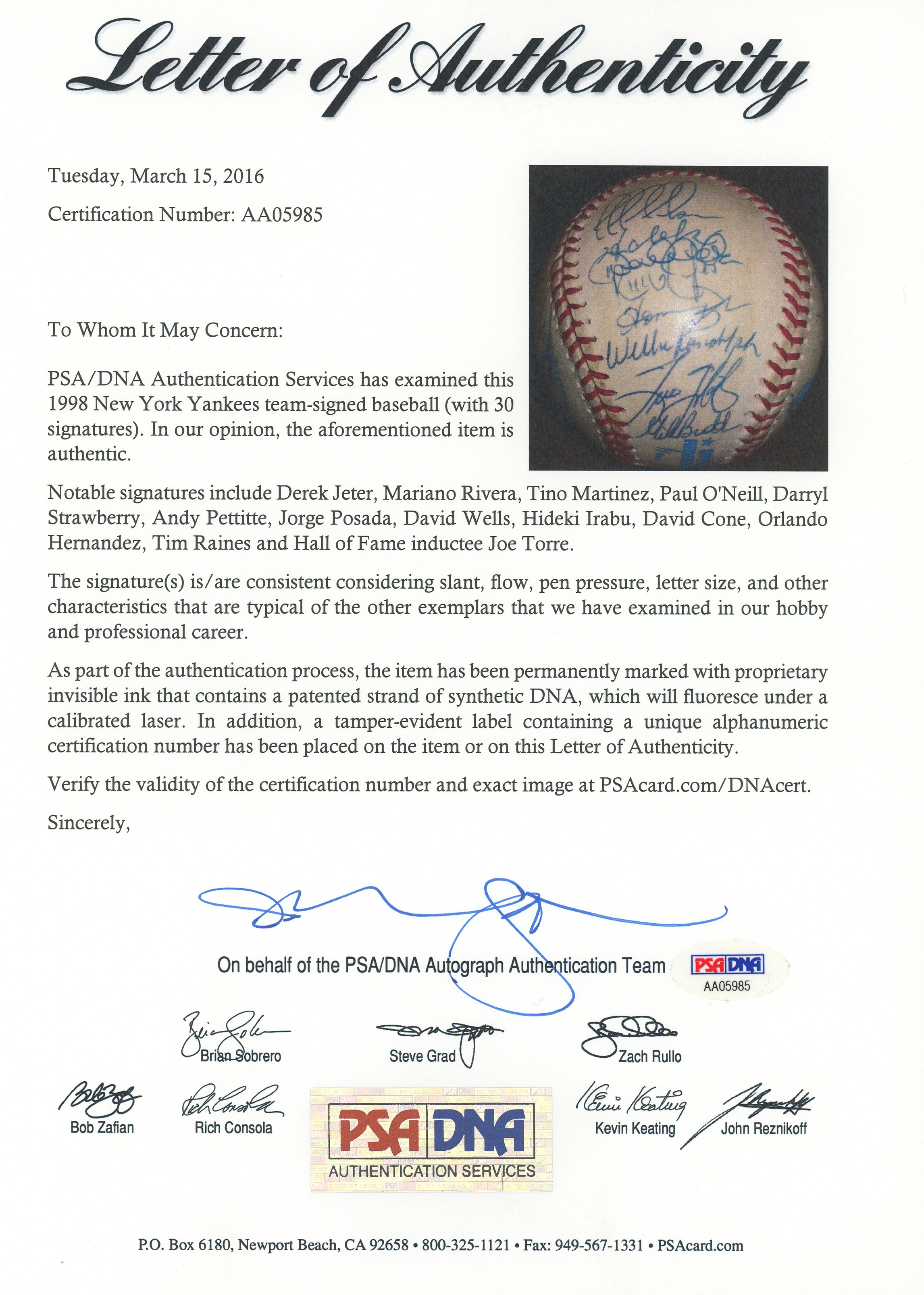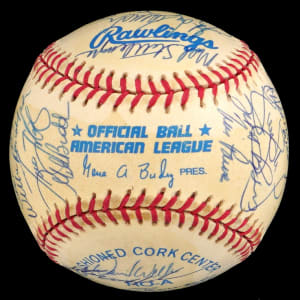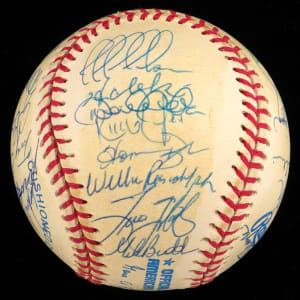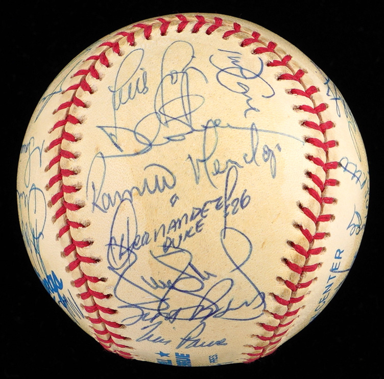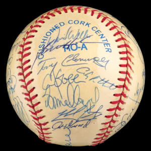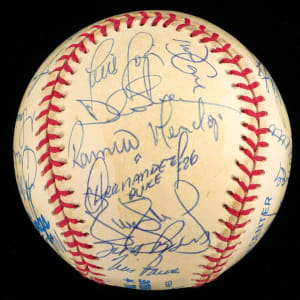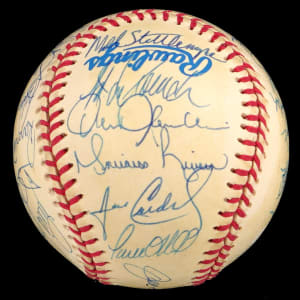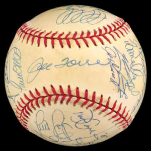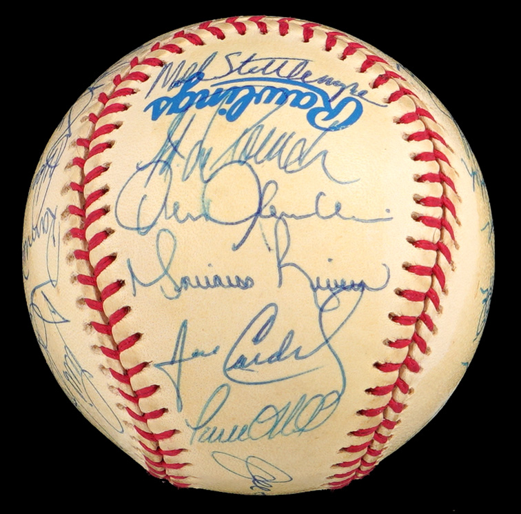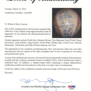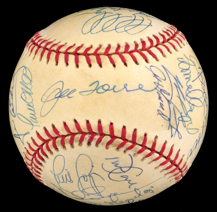 The 1998 Yankees, at the peak of their modern potency, began a three-year reign by winning the World Series Championship, and (30) members of that great team have signed this creamy, very lightly toned, OAL/Budig ball with signatures averaging (“8-9”). Notable signatures include Derek Jeter, Mariano Rivera, Tino Martinez, Paul O'Neill, Darryl Strawberry, Andy Pettite, Jorge Posada, David Wells, Hideki Irabu, David Cone, Orlando Hernandez, Tim Raines and Joe Torre.