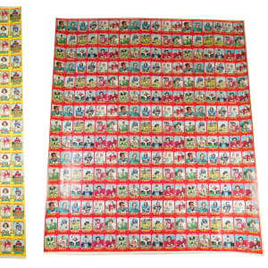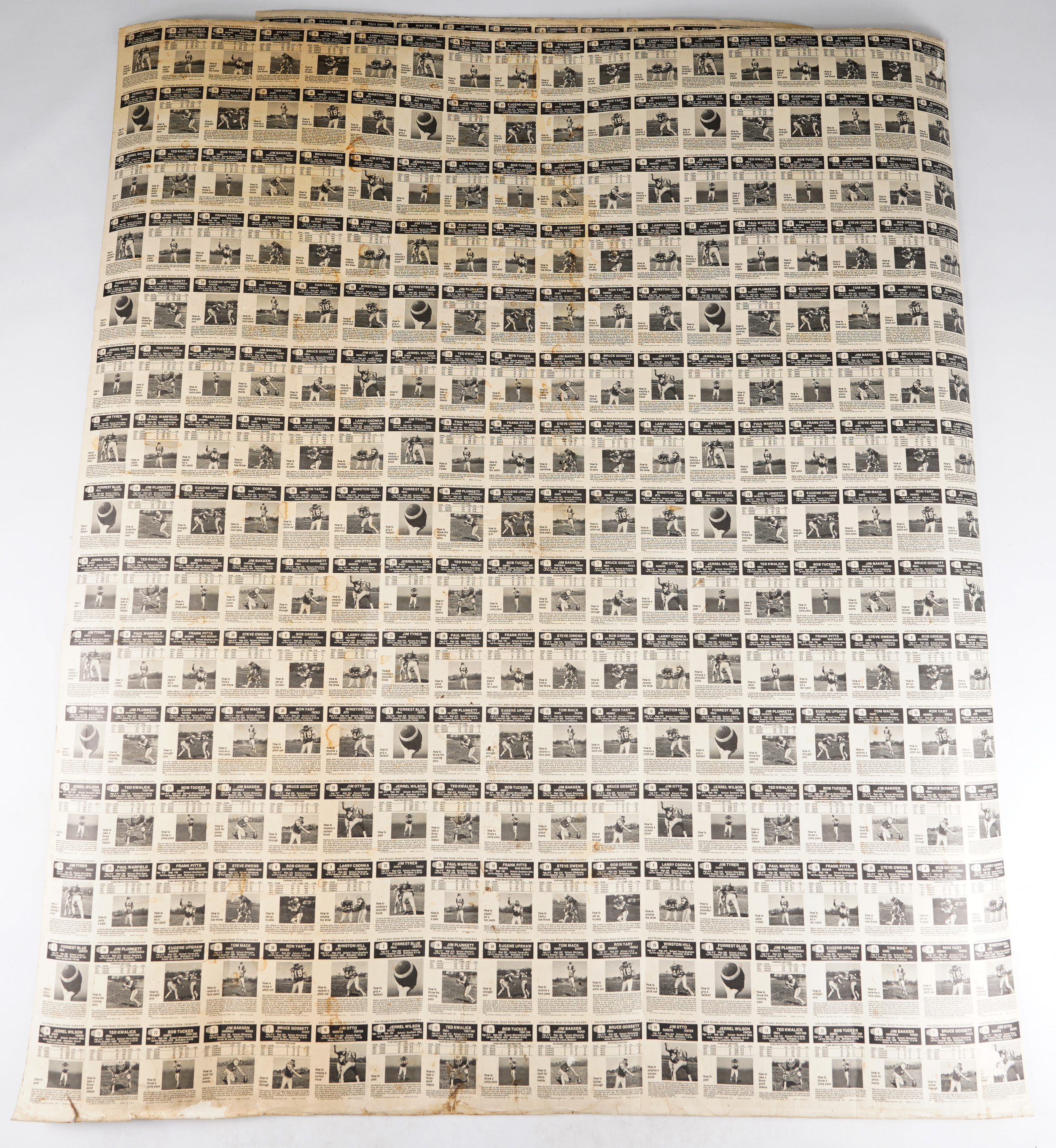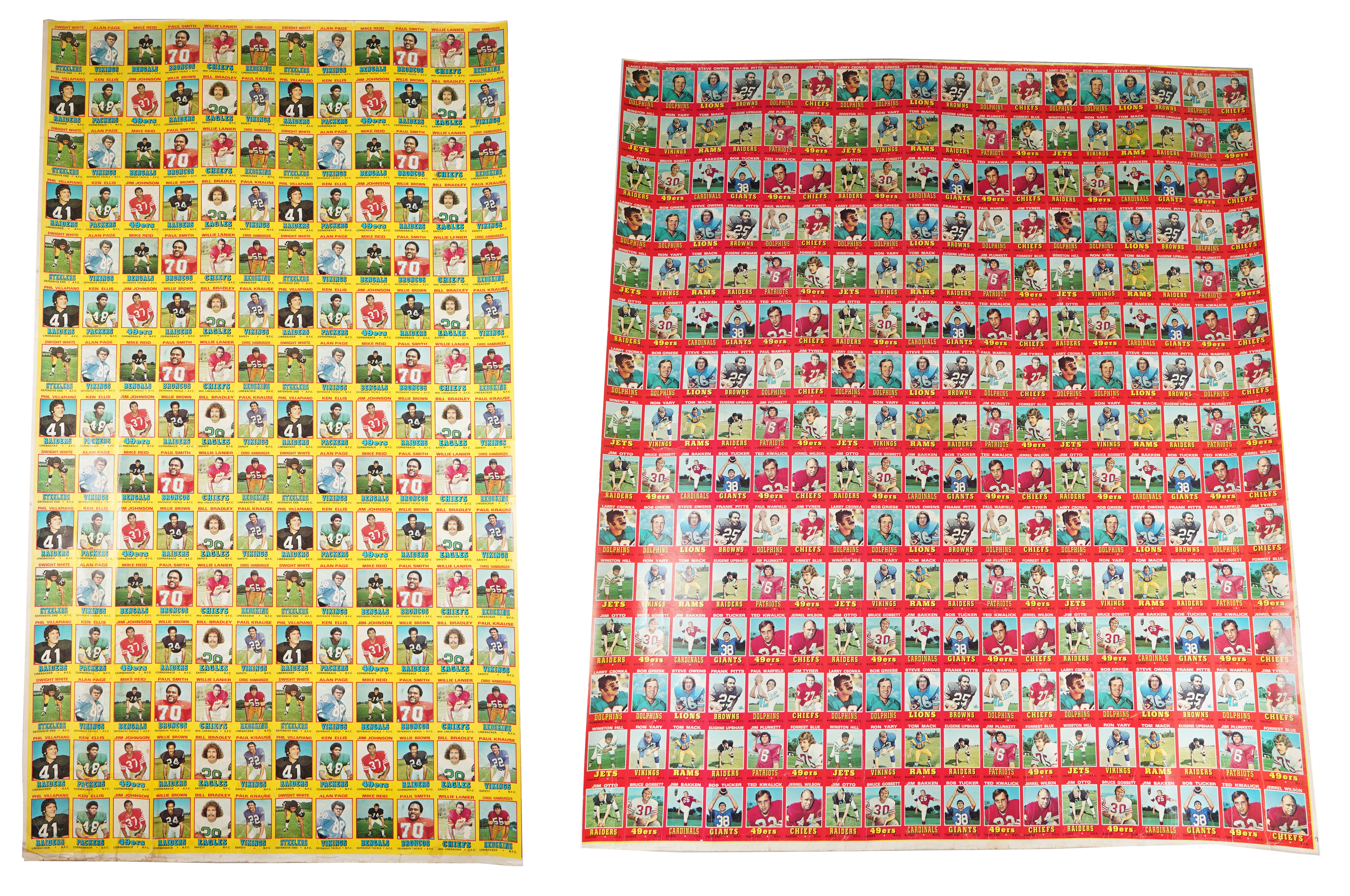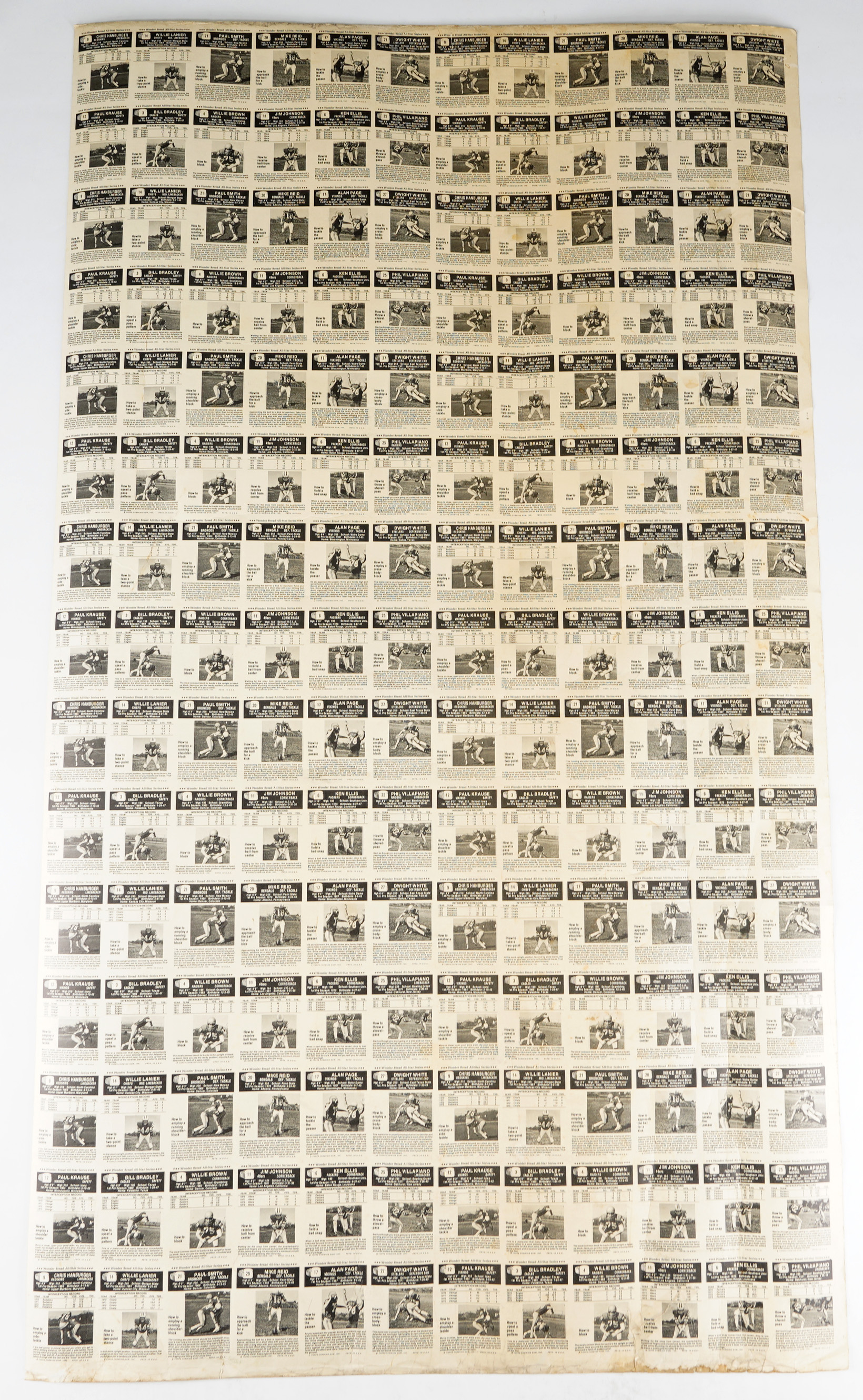 195 Hall of Famers! A herculean pair of 1974 Wonder Bread Football uncut sheets. These jumbo-sized printing press survivors total (450) cards with (15) 30-card sets arranged over the color-coded artifacts. Despite varying degrees of acute wear including significant creasing throughout, perimeter contusions, reverse paper loss/staining, storage exposure and other condition factors, very few sheets of such size have survived the past half century! Highlights include: Red Uncut Sheet: (270 total cards) with (15) #5 Csonka, (15) #8 Griese, (15) #15 Mack, (15) #16 Otto, (15) #24 Upshaw, (15) #26 Warfield, (15) #30 Yary; Yellow Uncut Sheet: (180 total cards) with (15) #4 W. Brown, (15) #9 Hanburger, (15) #11 J. Johnson, (15) #12 Krause, (15) #14 Lanier and (15) #17 Page. The size/weight of this item requires that there will be an additional shipping charge for this lot.