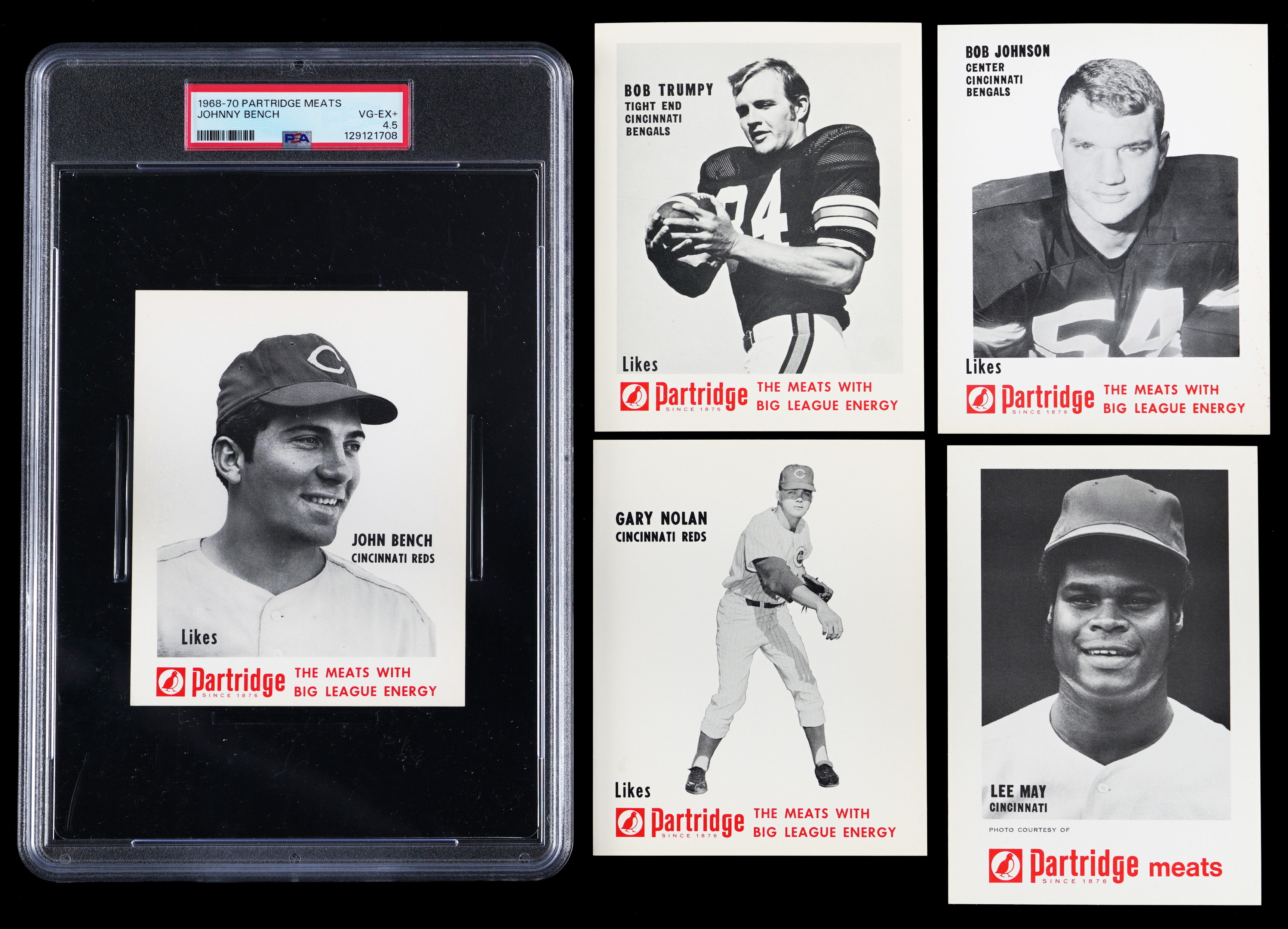 Professional franchises from "The Queen City" unite with the offered 1968-1971 Cincinnati Reds/Bengals Partridge Meats collection of five cards. Includes: 1968-1970 Partridge Meats Bengals: (2 cards) with B. Johnson (NM), Trumpy (NM-MT); 1968-1970 Partridge Meats Reds: (2 cards) with Bench RC (PSA VG-EX+ 4.5), Nolan (NM-MT) and 1972 Partridge Meats Reds: L. May (NM-MT).