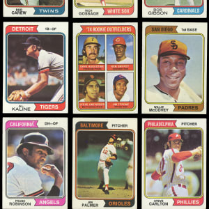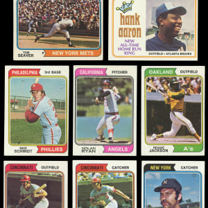 Presented is a 1974 Topps near set of (658/660) cards plus the 44-card Traded and 24-card Team Checklist sets (all unmarked). These '74s generally present in the (VG-EX to EX) range with some better or lesser. Highlights include: #1 Aaron (EX), #10 Bench (VG-EX), #20 Ryan (GD), #80 Seaver (VG), #130 R. Jackson (VG-EX), #215 Kaline (EX-MT), #250 McCovey (EX-MT), #283 Schmidt (VG-EX), #300 Rose (EX), #340 Munson (EX) and #598 Griffey Sr. RC (VG-EX). Missing only #252 Parker RC and #456 Winfield RC for completion.