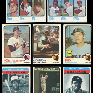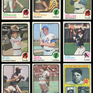 Snag the offered 1973 Topps near set of (659/660) cards. This final multi-series flagship edition generally presents mid-grade averaging in the (VG to VG-EX) range with some better or lesser. Highlights include: #1 Ruth/Aaron/Mays (GD), #50 Clemente (EX), #100 Aaron (VG-EX), #130 Rose (GD), #142 Munson (VG), #174 Gossage RC (VG), #193 Fisk (GD), #220 Ryan (GD), #245 Yastrzemski (VG), #255 R. Jackson (VG), #305 Mays (VG), #350 Seaver (VG-EX), #380 Bench (VG-EX), #471 Cobb LDR (VG), #472 Gehrig LDR (GD), #473 Aaron LDR (VG), #474 Ruth LDR (GD), #475 Cobb LDR (GD), #588 CL (VG), #613 Boone RC (EX) and #614 Bumbry/Evans RC (EX). Missing only #615 Schmidt RC for completion.