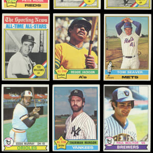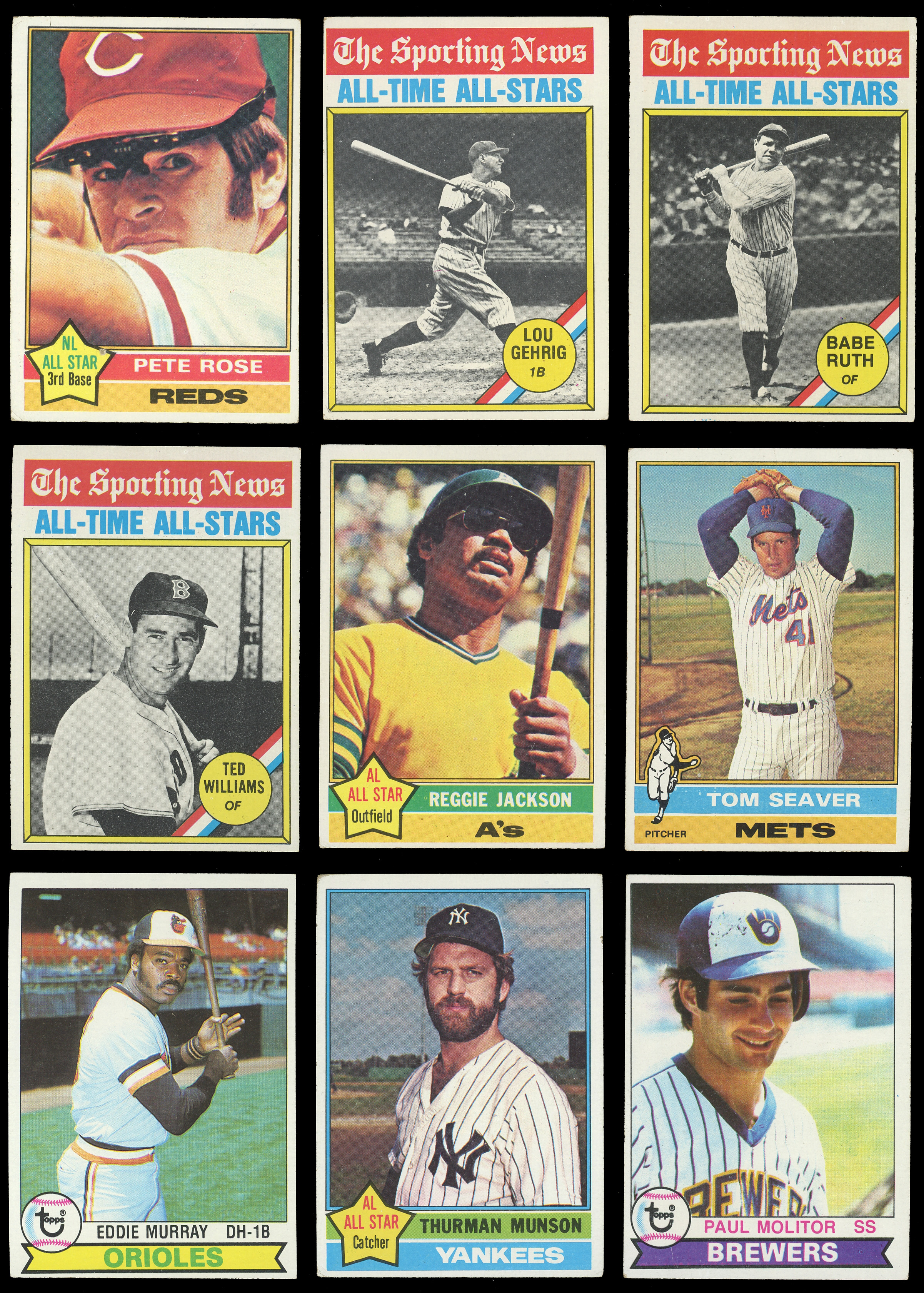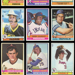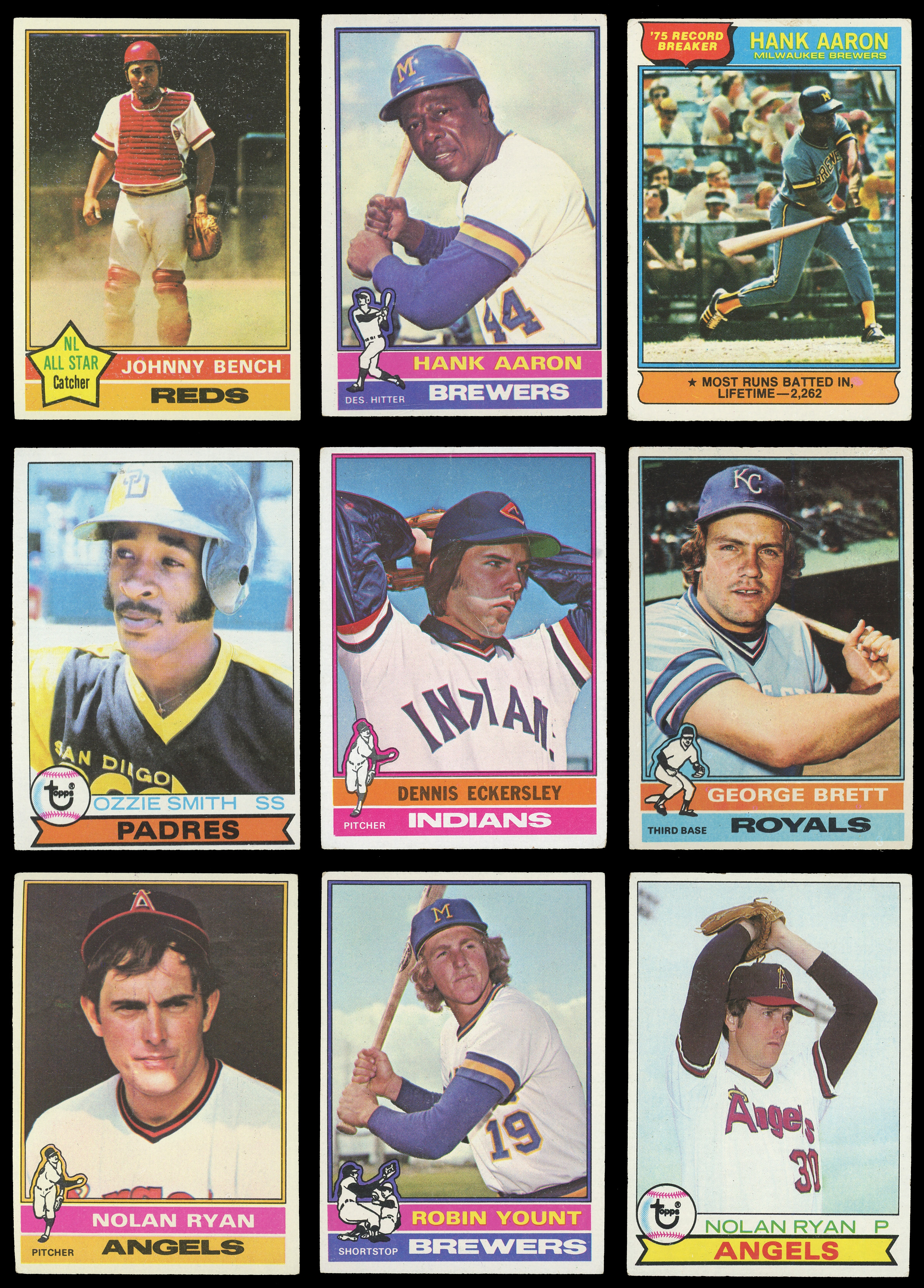 Double up with the offered pair of 1976 and 1979 Topps complete sets. Highlights include: 1976 Topps set: (660/660, average VG-EX to EX, with 44/44 Traded, plus clean wrapper) with #1 Aaron RB (GD), #19 Brett (VG-EX), #98 Eckersley RC (GD), #240 Rose (GD), #300 Bench (EX-MT), #316 Yount (VG-EX), #330 Ryan (GD), #341 Gehrig ATG (VG), #345 Ruth ATG (EX), #347 T. Williams ATG (EX), #500 R. Jackson (GD), #550 Aaron (VG-EX), #600 Seaver (VG), #650 Munson (GD); 1979 Topps set: (726/726, average VG-EX to EX) with #24 Molitor (VG-EX), #115 Ryan (VG-EX), #116 O. Smith RC (VG-EX) and #640 Murray (EX).