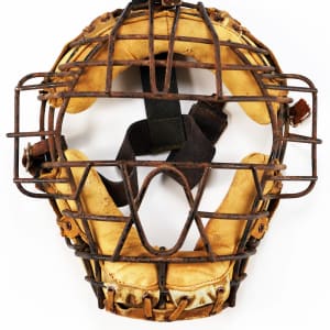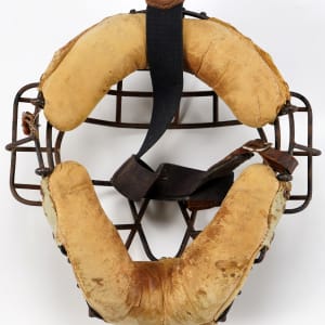 Baseball catcher's mask dating to circa 1920s to 1930s era. All of the original leather pads remain intact and firmly attached to the metal framework despite moderate to heavy wear in places. The only flaw of any note is moderate to heavy tarnishing/rusting to the wire frame. The canvas head strap remains intact and attached to the sides. There are no manufacturer's stampings visible. The protective mask, which was invented in 1876 by Harvard captain Fred Thayer, along with the baseball glove, are probably the two pieces of baseball equipment that have changed the most since their inception. As one can see here, this mask is primitive when compared with the protective masks of today. In Very Good condition overall. The size/weight of this item requires that there will be an additional shipping charge for this lot.