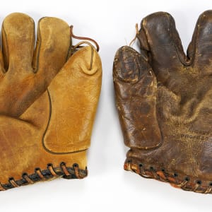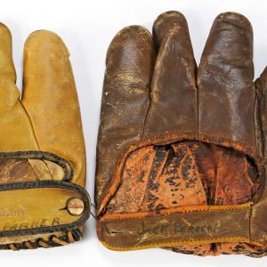 Pair of circa 1930s player-endorsed store-model gloves from Hall of Famers Leon "Goose" Goslin and Rogers Hornsby. The size/weight of this item requires that there will be an additional shipping charge for this lot. Player-endorsed sporting goods became quite popular dating to the dawn of professional equipment in the 19th century, and the tradition continued in full force throughout the 1930s when both Goslin and Hornsby starred for their respective teams in what would go on to be Hall of Fame careers. The right-handed Goslin glove exhibits a number of stampings in the palm, including "Fielder's Glove Professional Model" and "Tempered in Oil" as well as "Goose Goslin" and "Jack Berger" in the heel, but a manufacturer's stamping is not visible. The leather is heavily worn and the interior padding exhibits flaking and breaking due to heavy wear. The hand strap has detached from one side and is held in place by a safety pin and the lacing between the thumb and the index finger has been replaced by string. The left-handed Hornsby glove is a Wilson model 972, and displays a number of stampings in the palm, including "Rajah Hornsby," most of which are heavily faded. The outside of the glove displays light wear while the pocket displays moderate to heavy wear. The name of a former owner is written in marker on the hand strap. A collectible pair of player-endorsed gloves from the 1930s. Total: 2 gloves. The size/weight of this item requires that there will be an additional shipping charge for this lot.