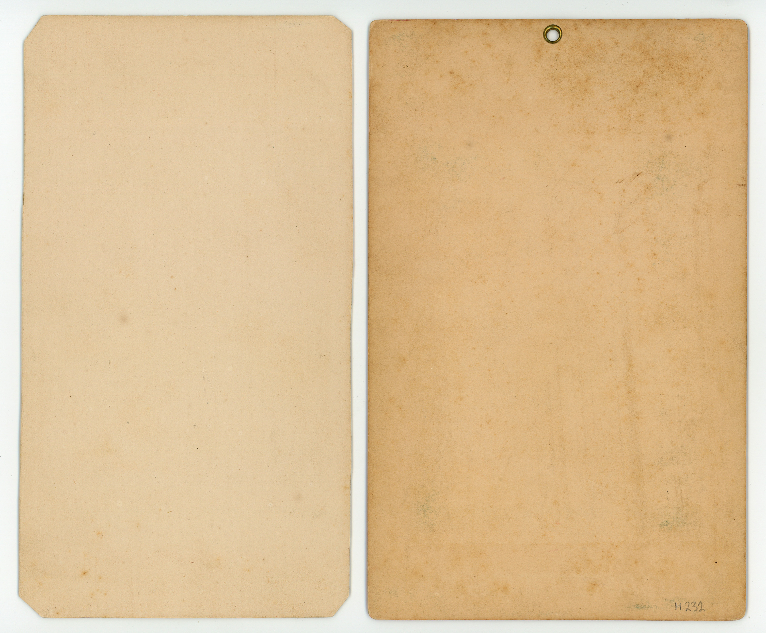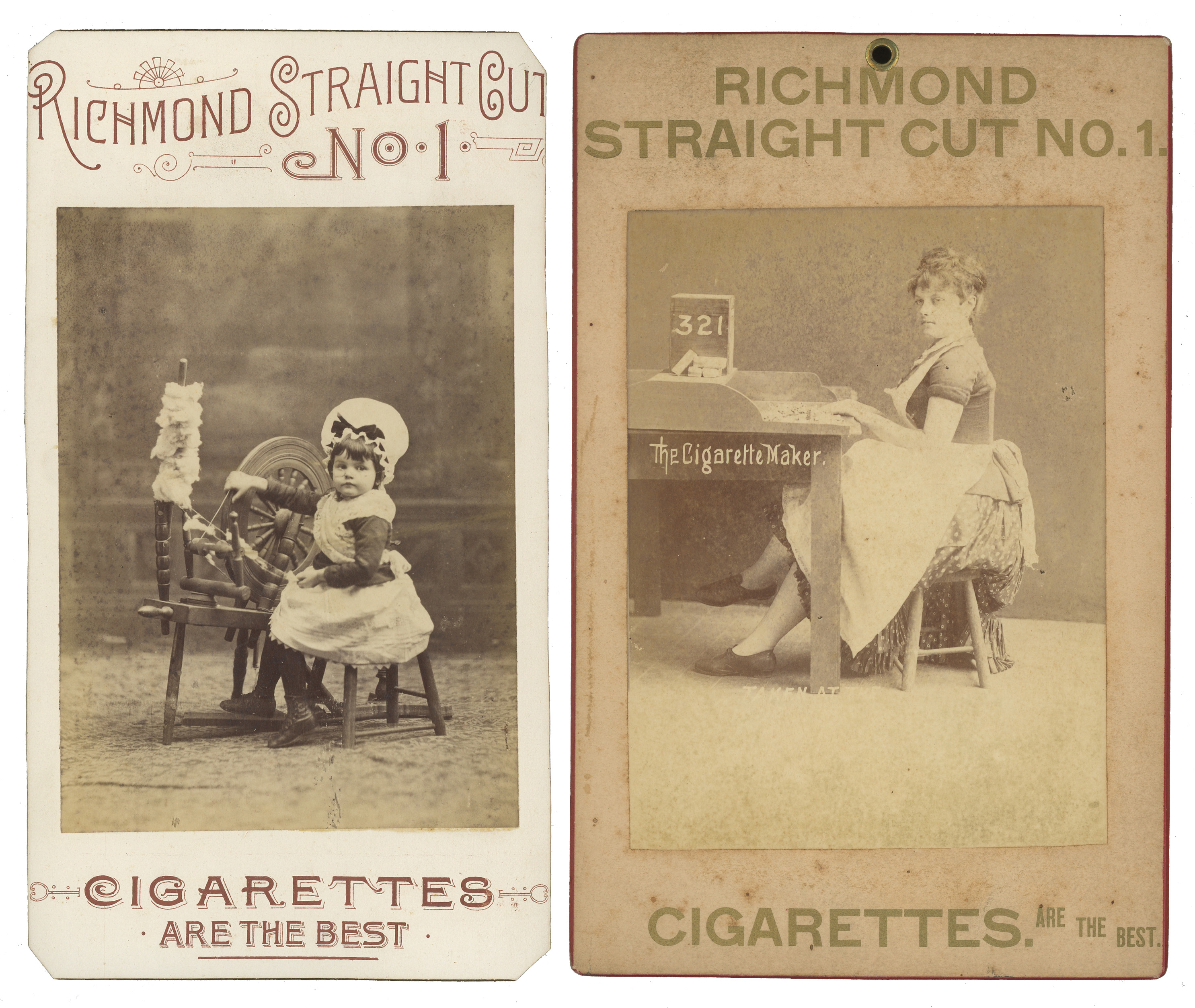Extremely rare nineteenth-century large cabinet card featuring a woman seated at a work table hand-rolling cigarettes, issued as a premium by the Allen & Ginter tobacco company. The cabinet is slightly larger than a traditional cabinet card, measuring approximately 4-7/8 x 7-7/8 inches, and features the advertisement for "Richmond Straight Cut, NO. 1./Cigarettes. Are The Best" printed on the top and bottom borders. The identification "The Cigarette Maker" is printed within the photo next to the woman posing. There is an eyelet hole at the top (most likely contained a string to hang for display). The cabinet card grades Good overall due to light scattered foxing and a pencil notation on the blank reverse. Also accompanying this cabinet card is a similar premium cabinet (4-5/8 x 7-15/16 inches) featuring a child at a spinning wheel. This card displays four clipped corners and uneven side edges, indicating it may have been cut down at one point. This is a pair of very high quality cabinet cards worthy of any advanced nonsports or tobacco advertising collection. Total: 2 cards.