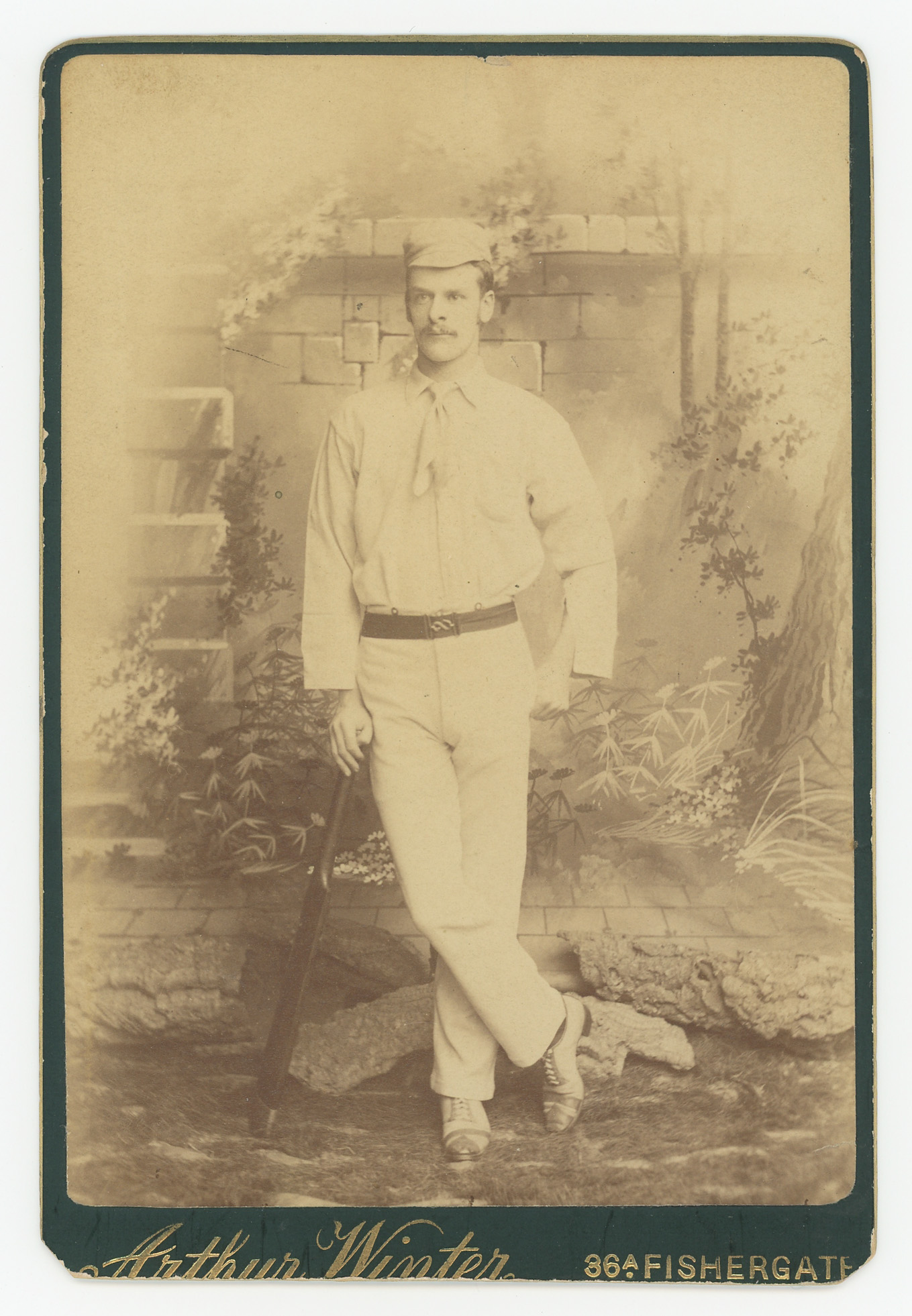 Circa 1880s cabinet card featuring an unidentified individual in a full-length pose. While there is no identification displaying a name, team, or affiliation for this individual, we believe it represents a cricket player as evidenced by the shape of the bat he is leaning against. In this formal studio photograph, the individual appears in full uniform, which could be consistent with very early baseball teams of the day, but the shoes he is wearing suggest that he is not a baseball player. The studio setting has been created to resemble an outdoor scene, complete with grass on the floor and an ornate backdrop. The photographer's credit "Arthur Winter, 36A Fishergate," is along the base of the cabinet. The reverse is blank. The cabinet presents exceptionally well, with superb photo contrast and clarity. A strip of adhesive residue and paper loss on the reverse would cause this to grade modestly, but it presents as Very Good overall. This is a beautiful 1880s cabinet photograph!