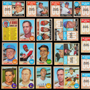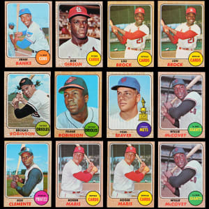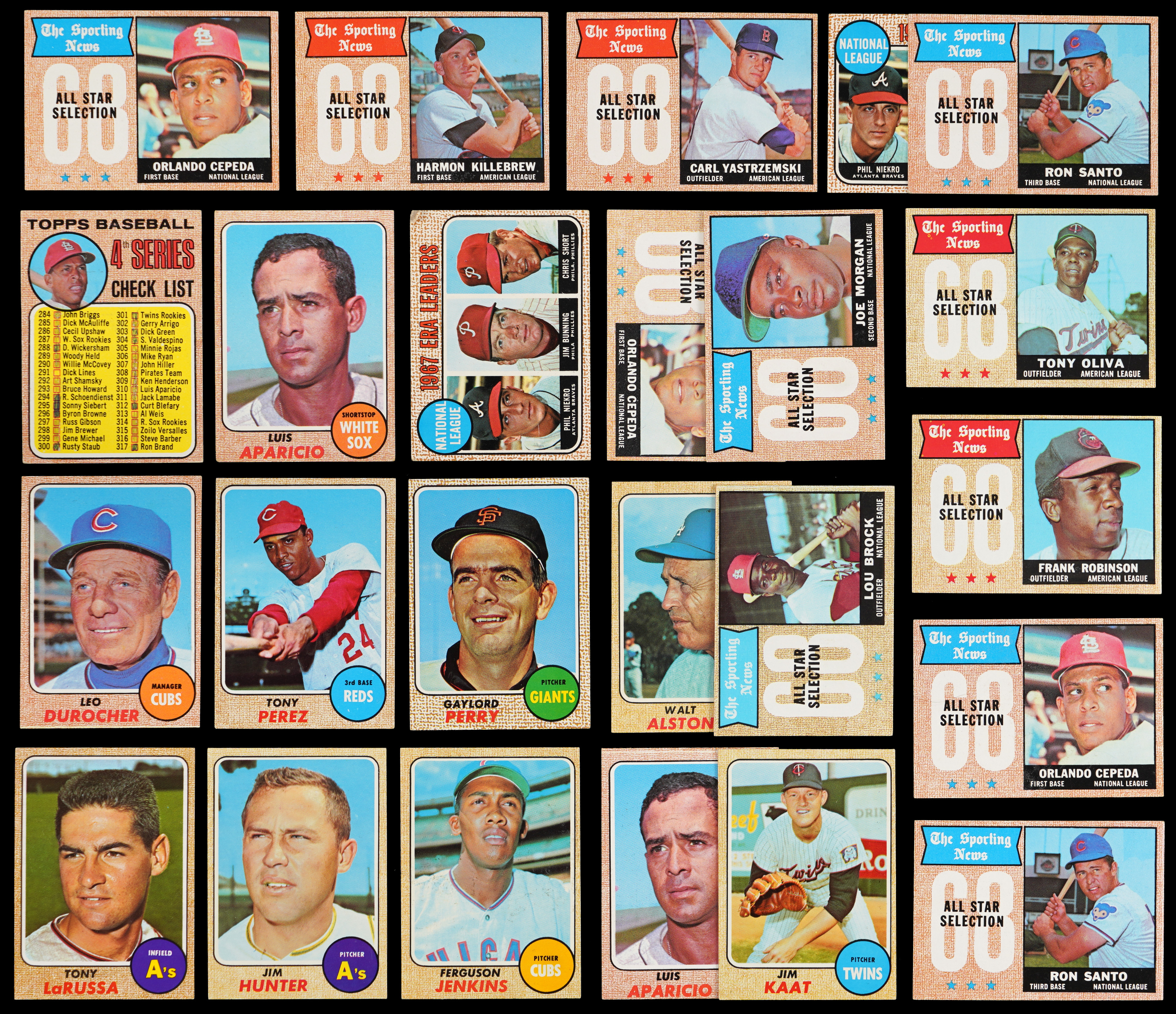 Featured is a 1968 Topps collection of (313) cards with (28) Hall of Famers. This burlap bordered assembly generally presents in the (EX to EX-MT) range with some centering variances found within. A smattering of Milton Bradley parallels are scattered throughout. Highlights include: #20 B. Robinson (VG), #45 Seaver (VG-EX), #100 Gibson (EX-MT), #150 Clemente (VG-EX), (2) #290 McCovey (both EX), (2) #330 Maris (EX, GD), #355 Banks (VG-EX), #500 F. Robinson (VG-EX) and (2) #520 Brock (VG-EX, VG).