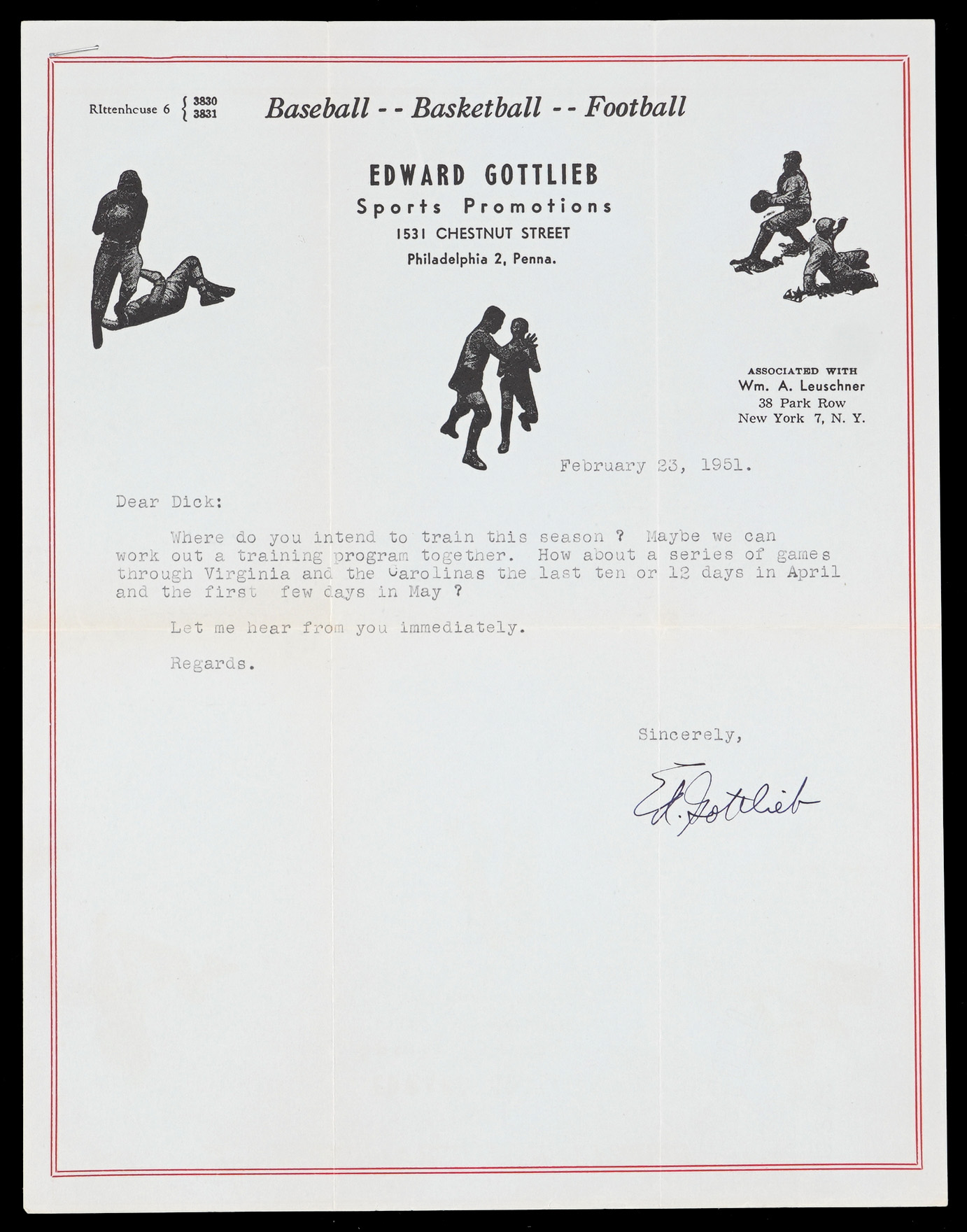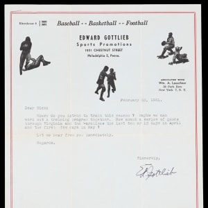 Sports promoter and National Basketball Hall of Fame inductee Edward Gottlieb sought to correspond with Negro League executive Richard Powell on the offered typed letter signed (TLS) single-page artifact. The dated 2/23/51 correspondence piece complete with athletic letterhead requests "a series of game through Virginia and the Carolinas" during the spring. The bold signature presents a sold ("9") and is accompanied by a staple attached branded envelope sent to Mr. Powell. Auction LOA from James Spence/JSA. Note: This piece arrives from the Richard Powell collection. Mr. Powell was an instrumental figure in Negro League history and responsible for moving the Elite Giants franchise from Nashville to Baltimore prior to the 1938 season. He later served as the team's general manager, and under his tutelage, fielded a lineup of legends including Roy Campanella, Junior Gilliam and Joe Black.