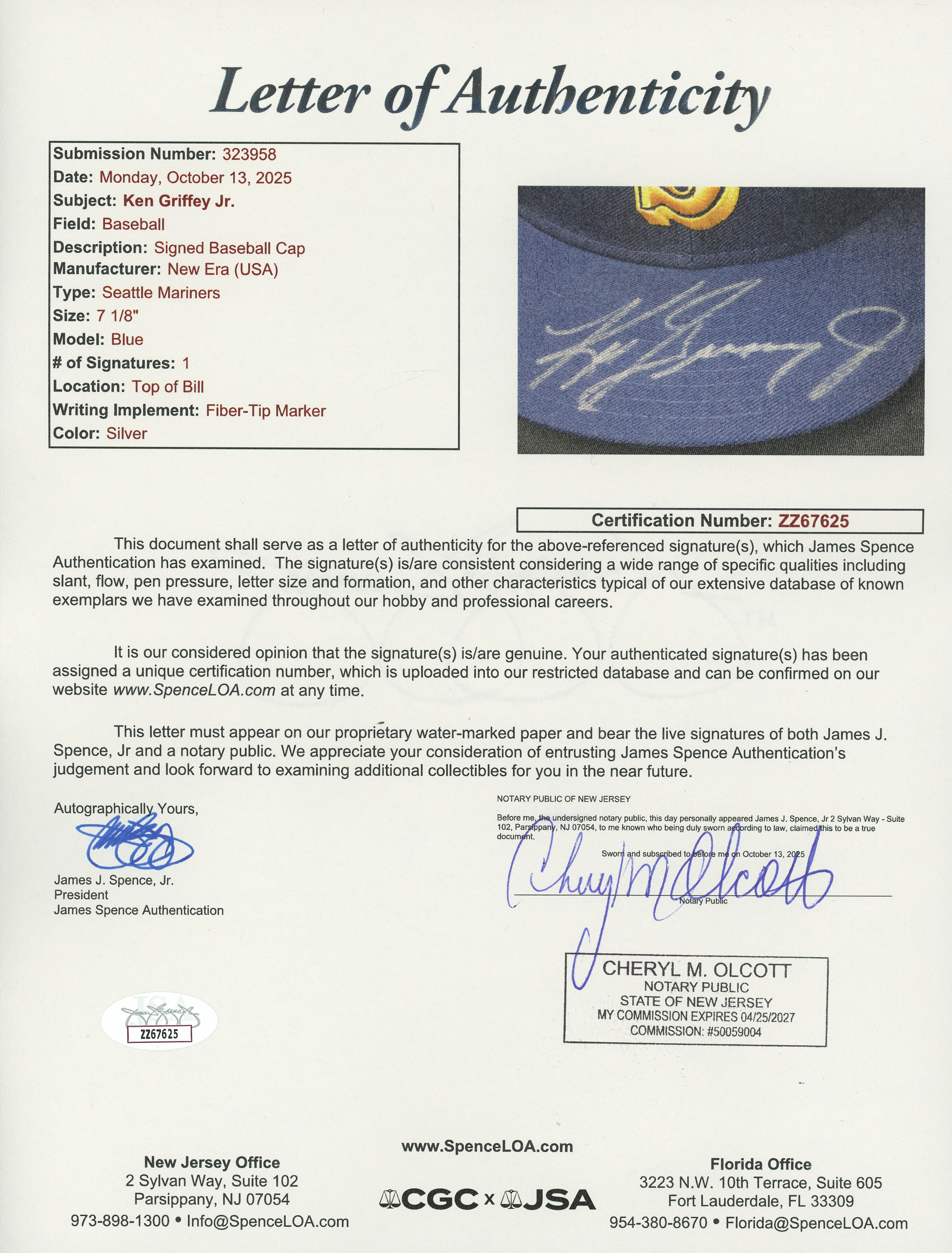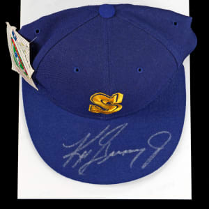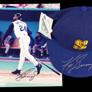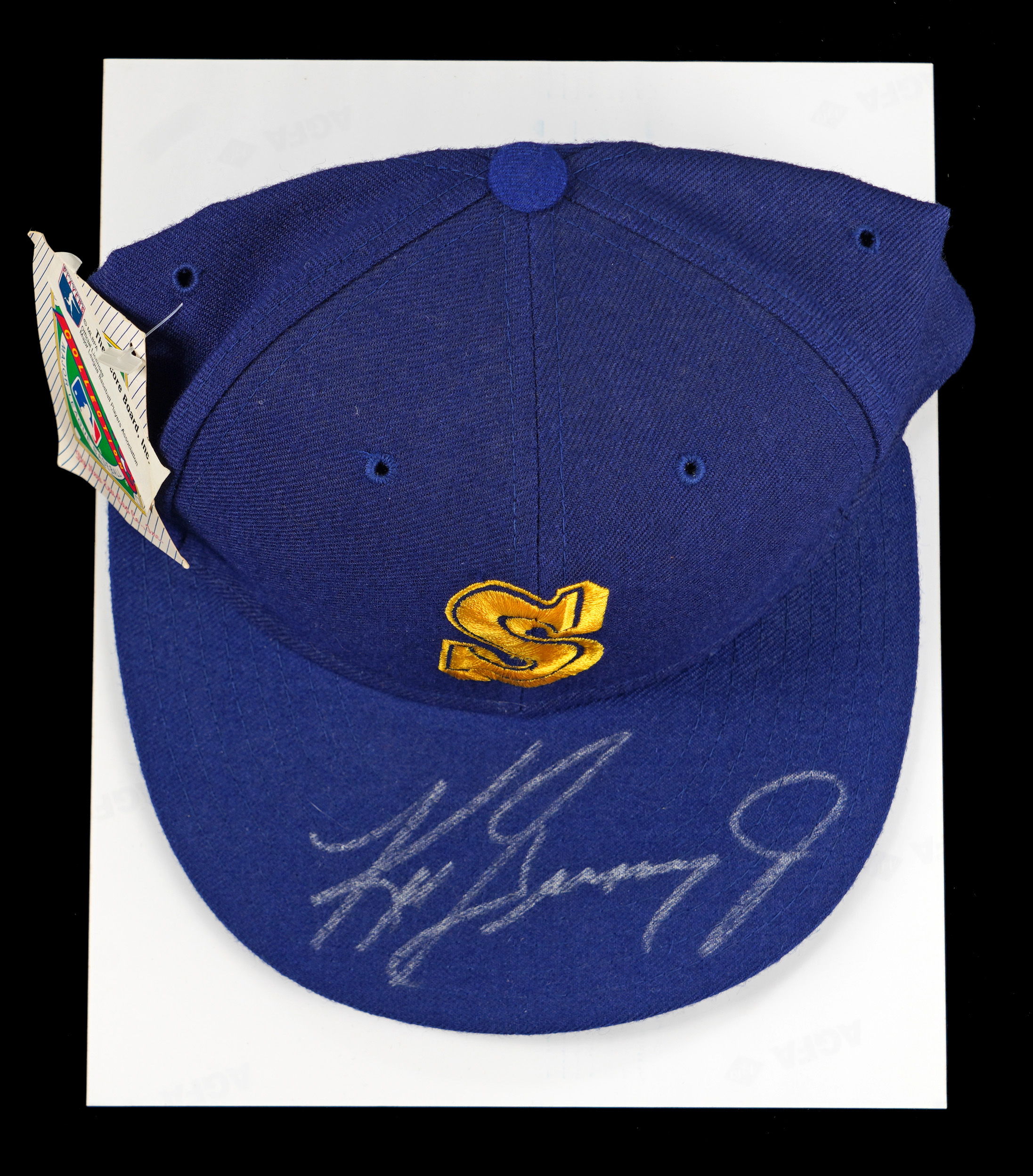 Also included is a size 7 1/8 New Era Seattle Mariners cap signed on the brim in silver (“7-8”) by the second-generation slugger.