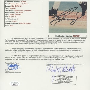 Ken Griffey Jr. hit 630 home runs, seventh most in MLB history. Included here is a Near Mint 8x10 photo of Griffey dropping his bat and watching one of his home runs leave the ballpark. It is signed in the dirt below his feet in black marker (“9”).