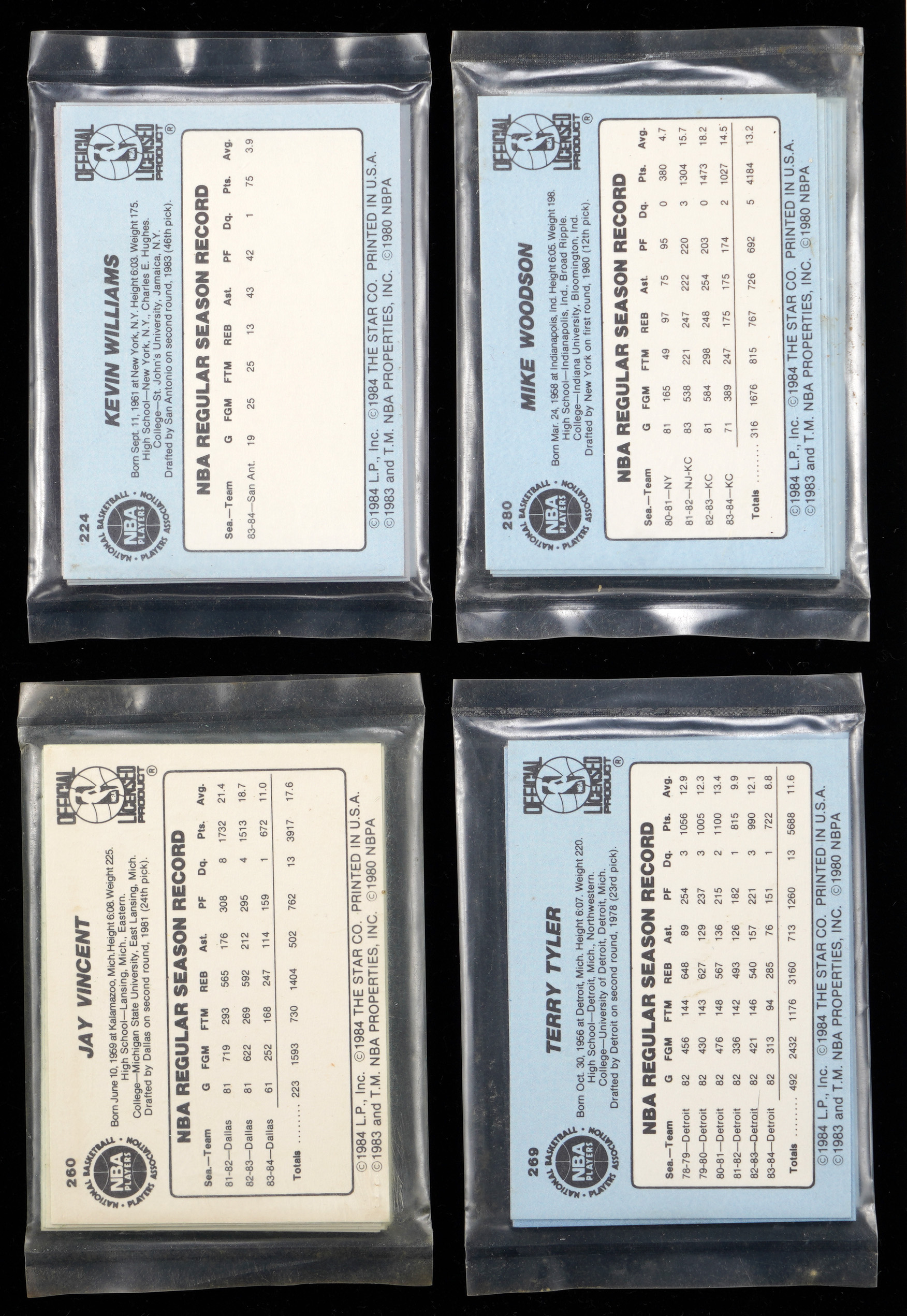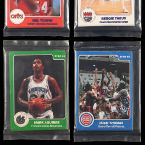 Very limited group of four 1984-1985 Star Basketball bagged team sets. Unless noted, each team set is tightly sealed. Includes: Cleveland Cavaliers #213-224, Dallas Mavericks #250-260, Detroit Pistons #261-269 with #261 I. Thomas and Kansas City Kings #270-280 (partially sealed, but unopened).