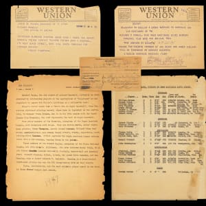Historically significant archival group of seven 1946-1951 Negro League official ephemera items, the majority of which relates to the Baltimore Elite Giants franchise. Includes: 1946 & 1948 Baltimore Elite Giants facts and figures sheets (with Joe Black), 1947 Bob Feller's All-Stars two-page press release (details Satchel Paige), (2) 1951 Western Union telegrams with one relating to the contractual status of Joe Black and James Gilliam (plus receipt). While the pages are quite fragile with varying degrees of storage wear (including paper separation and tape repair), they are intact, readable and an extremely valuable and interesting resource for Negro League historians. Note: This lot arrives from the Richard Powell collection. Mr. Powell was an instrumental figure in Negro League history and responsible for moving the Elite Giants franchise from Nashville to Baltimore prior to the 1938 season. He later served as the team's general manager, and under his tutelage, fielded a lineup of legends including Roy Campanella, Junior Gilliam and Joe Black.