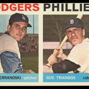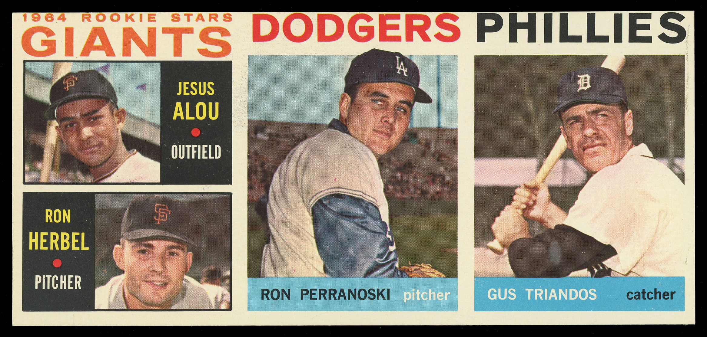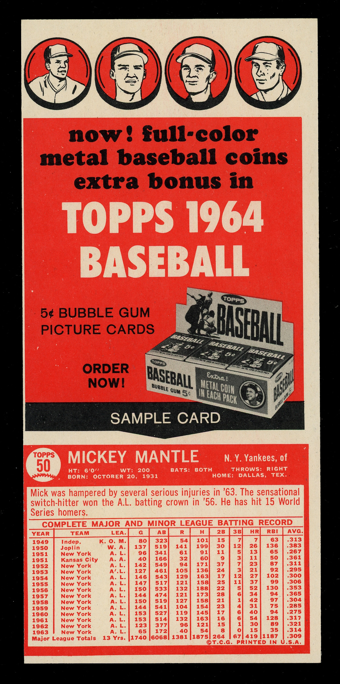 No advanced "Mick" collection can be considered truly complete without the offered 1964 Topps 3-card Saleman Sample Panel. This high-grade trifecta features the fronts of #30 Perranoski, #47 Giants Rookies and #83 Triandos. The burnt orange reverse includes the statistics of #50 Mickey Mantle along with an ad for the "full-color metal baseball coins" insert in the flagship product.