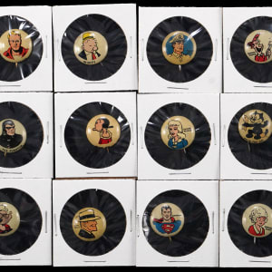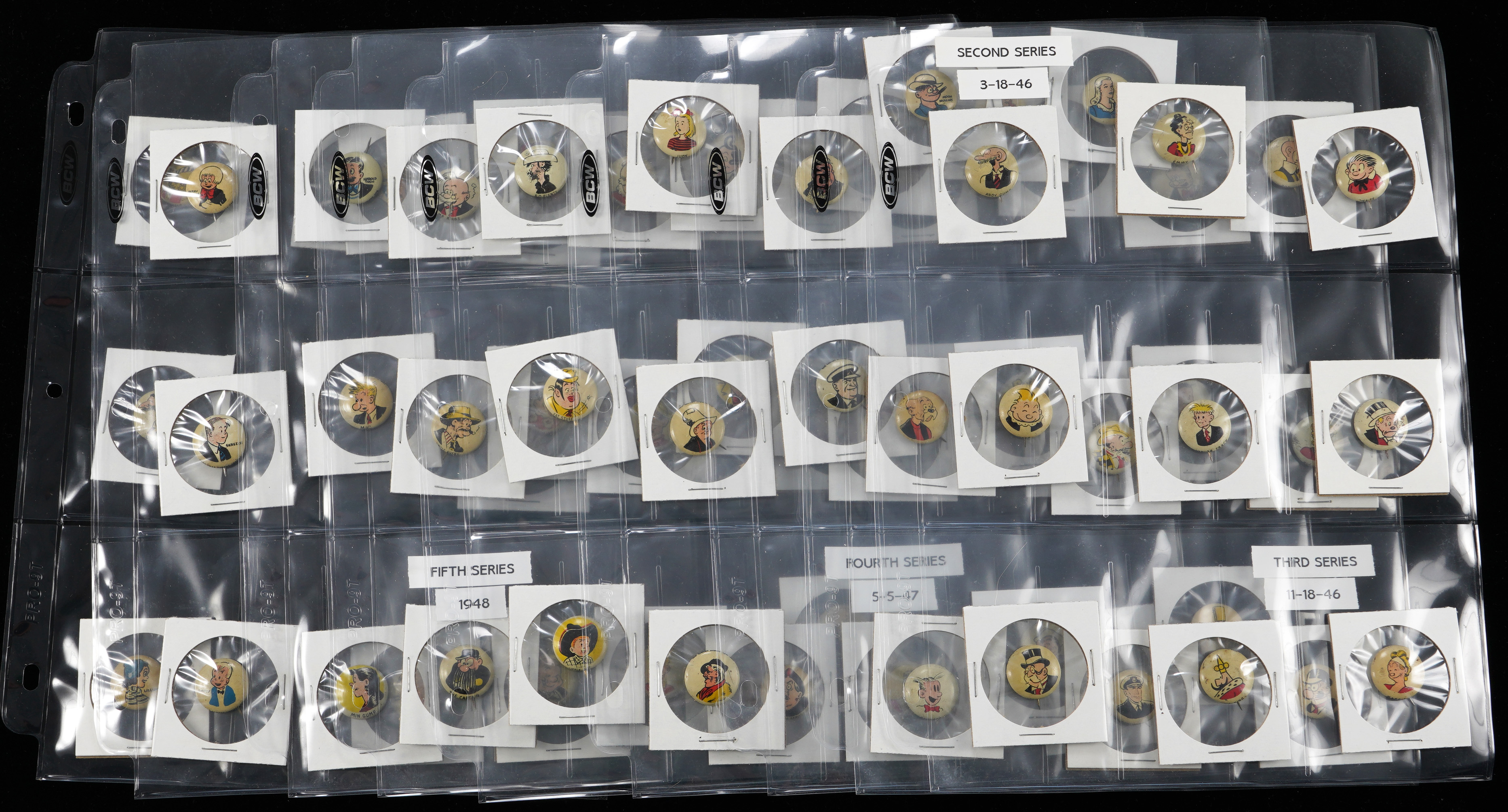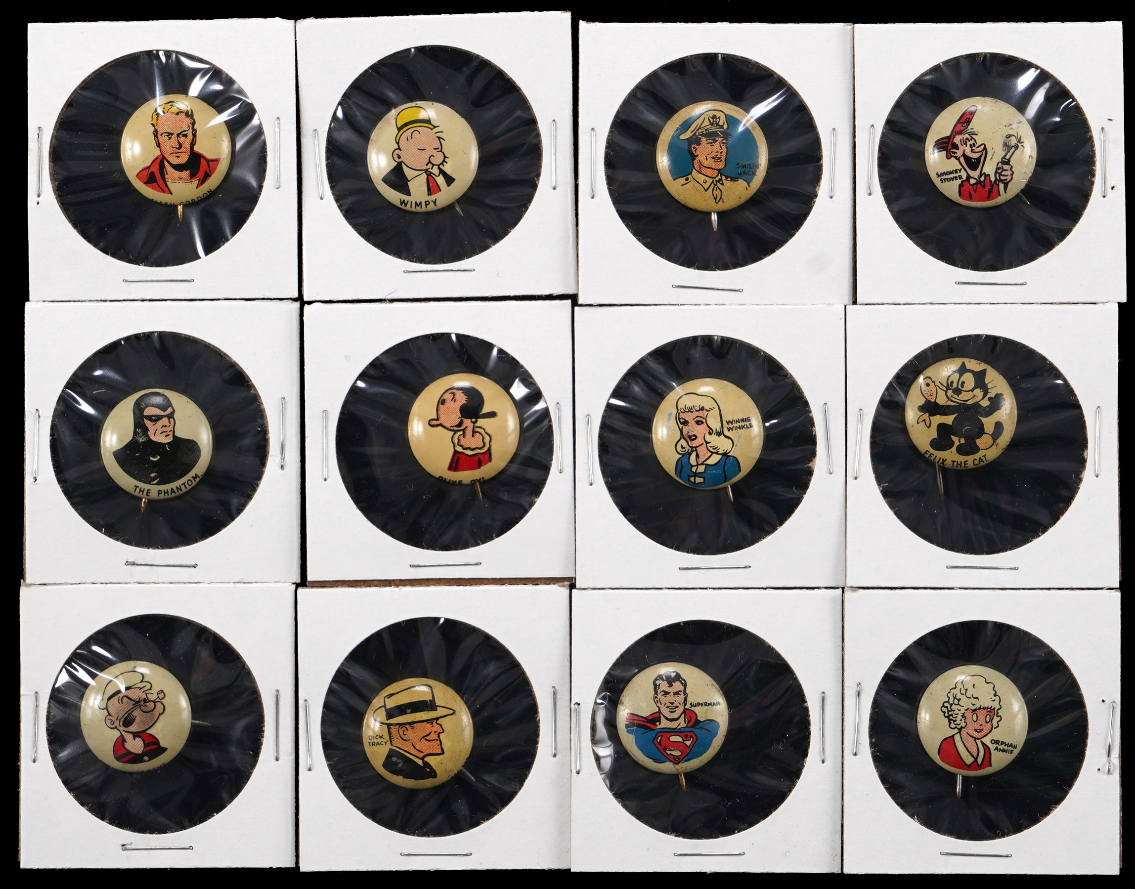 Hilarious comic strip heroes laugh their way through the offered 1945-1947 PF6 Kellogg’s Pep Pins Comics complete set of (86) pins. Distributed one-per-box in specially marked cereals, these colorful prizes were undoubtedly treasured by their youthful recipients and seldom offered as a complete set. Averages (EX to EX-MT) condition with key pinbacks including: Dick Tracy (EX-MT), Felix the Cat (VG-EX), Flash Gordon (EX-MT), Olive Oyl (EX), Orphan Annie (EX-MT), The Phantom (EX-MT), Popeye (VG-EX) and Superman (EX).
