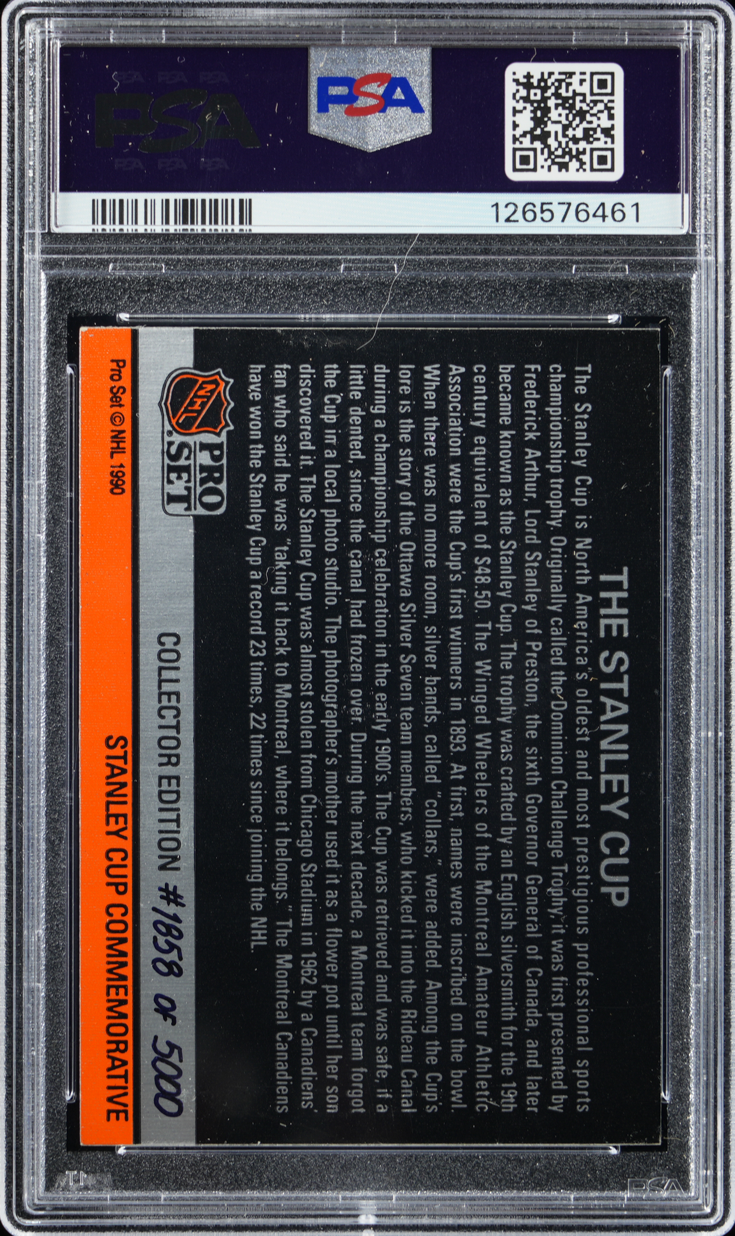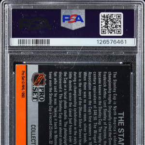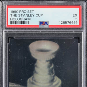 Graded EX 5 by PSA. Serially numbered #1858/5000. One of the most coveted prizes of the early modern insert era is available with the offered 1990-1991 Pro Set Hockey "The Stanley Cup" hologram. While 5,000 copies of a card isn't exactly rare, considering that in the early "90s card production went into maximum overdrive, such an insert is decidedly scarce!