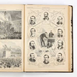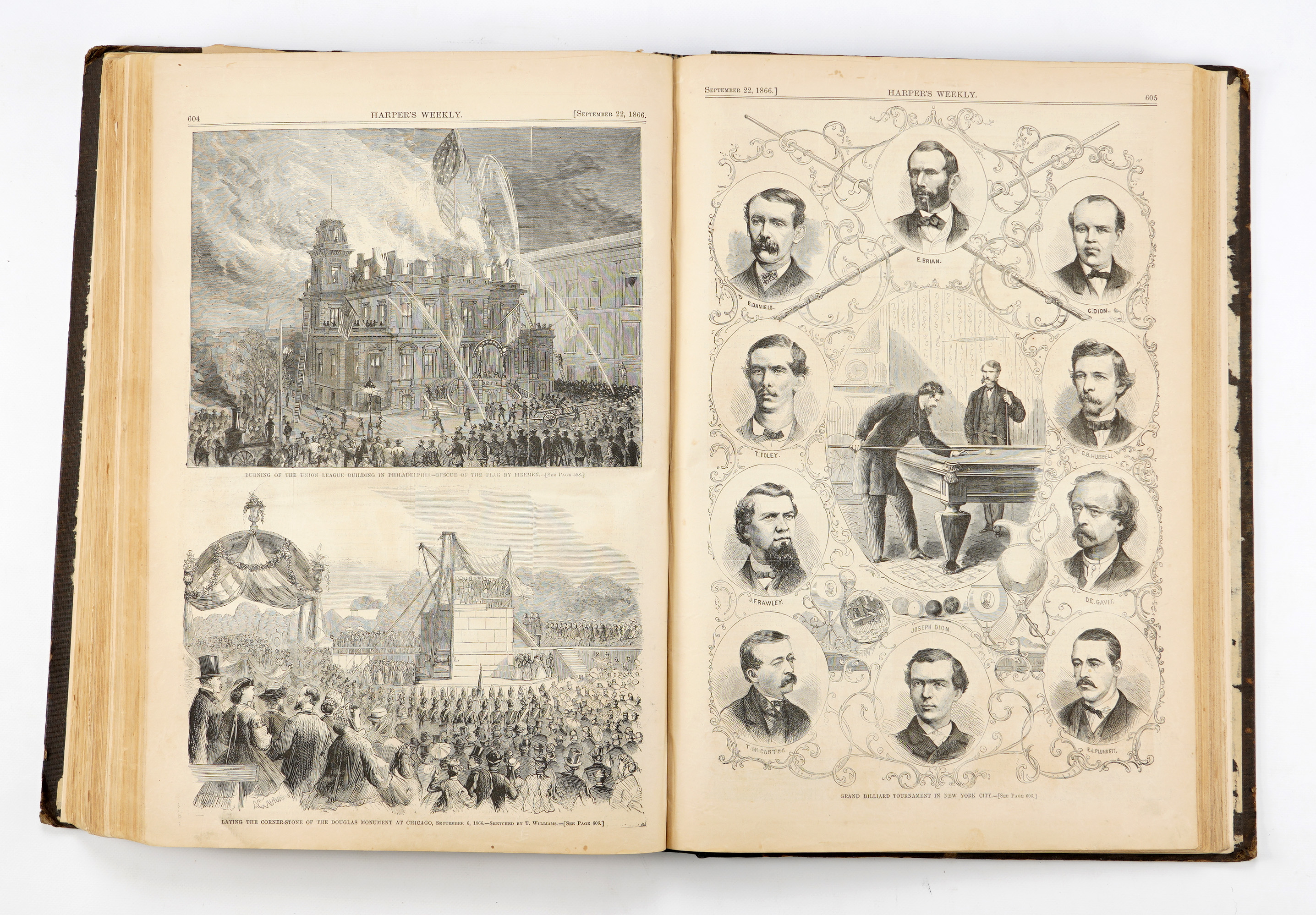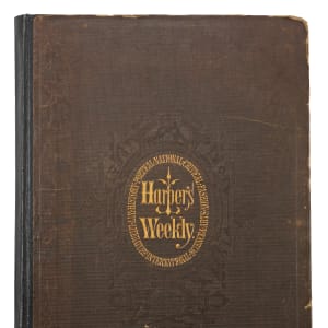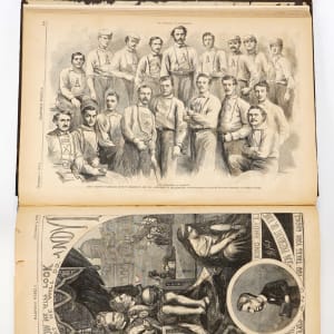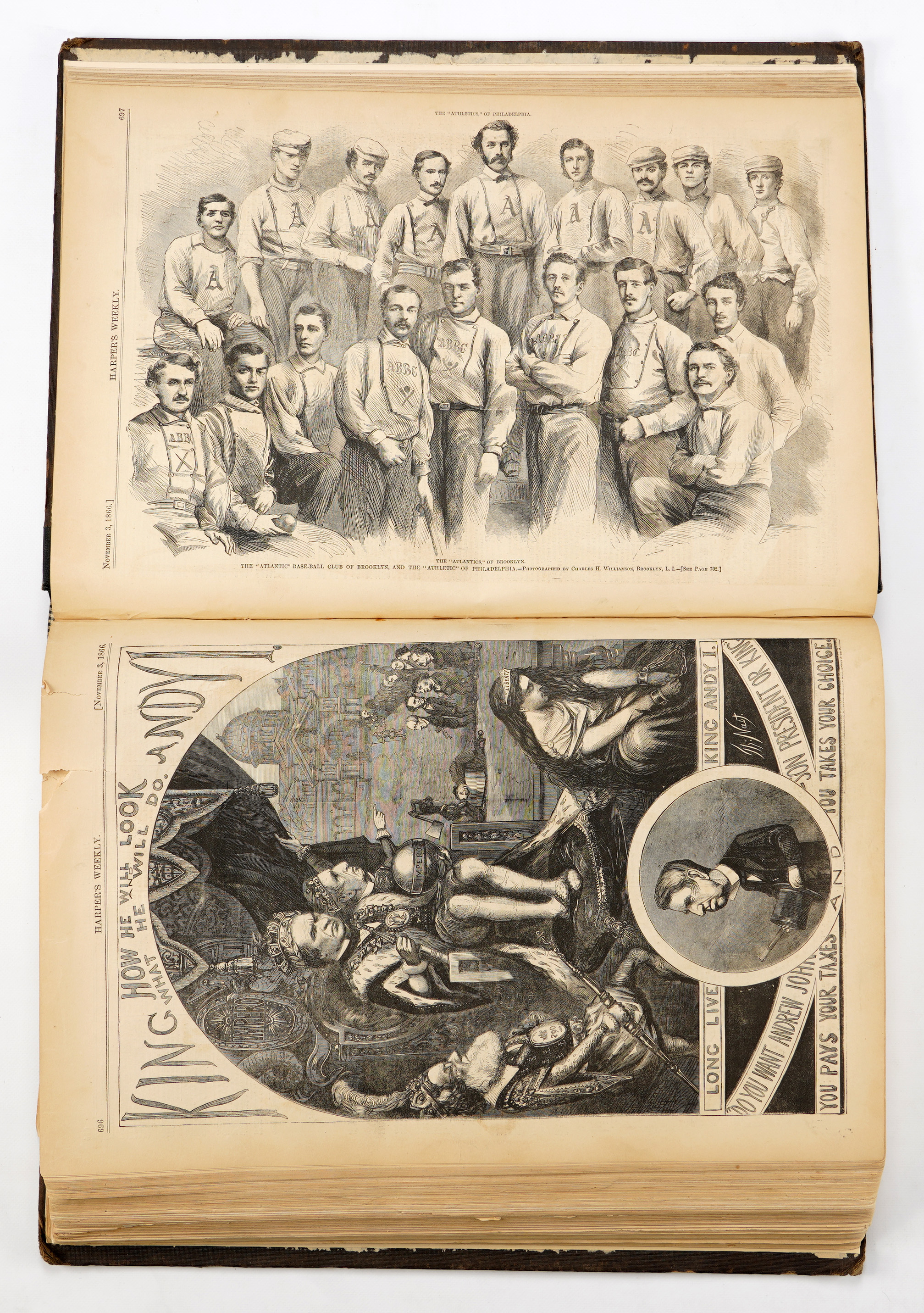 A complete year of 52 issues of 1866 Harper's Weekly have been bound in a 12x17 leather album that’s almost 3-inches thick. Harper's Weekly was the “USA TODAY” of the Civil War era. It is where people got their news, politics, fashion, science and arts. It was sold throughout the nation. The engravings and lithographs in each issue were state-of-the-art. This bound volume includes full-page woodcut engravings of the Brooklyn and Philadelphia baseball teams. There are a few loose interior pages, but most are still solidly bound. Most of the pages retain some whiteness. The album itself is in Very Good condition with wear around the edges as it was obviously perused often. Harper's Weekly’s pages are often sold separately and there is tremendous break-up value in this 160-year-old tome.