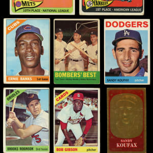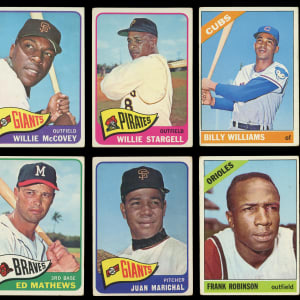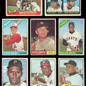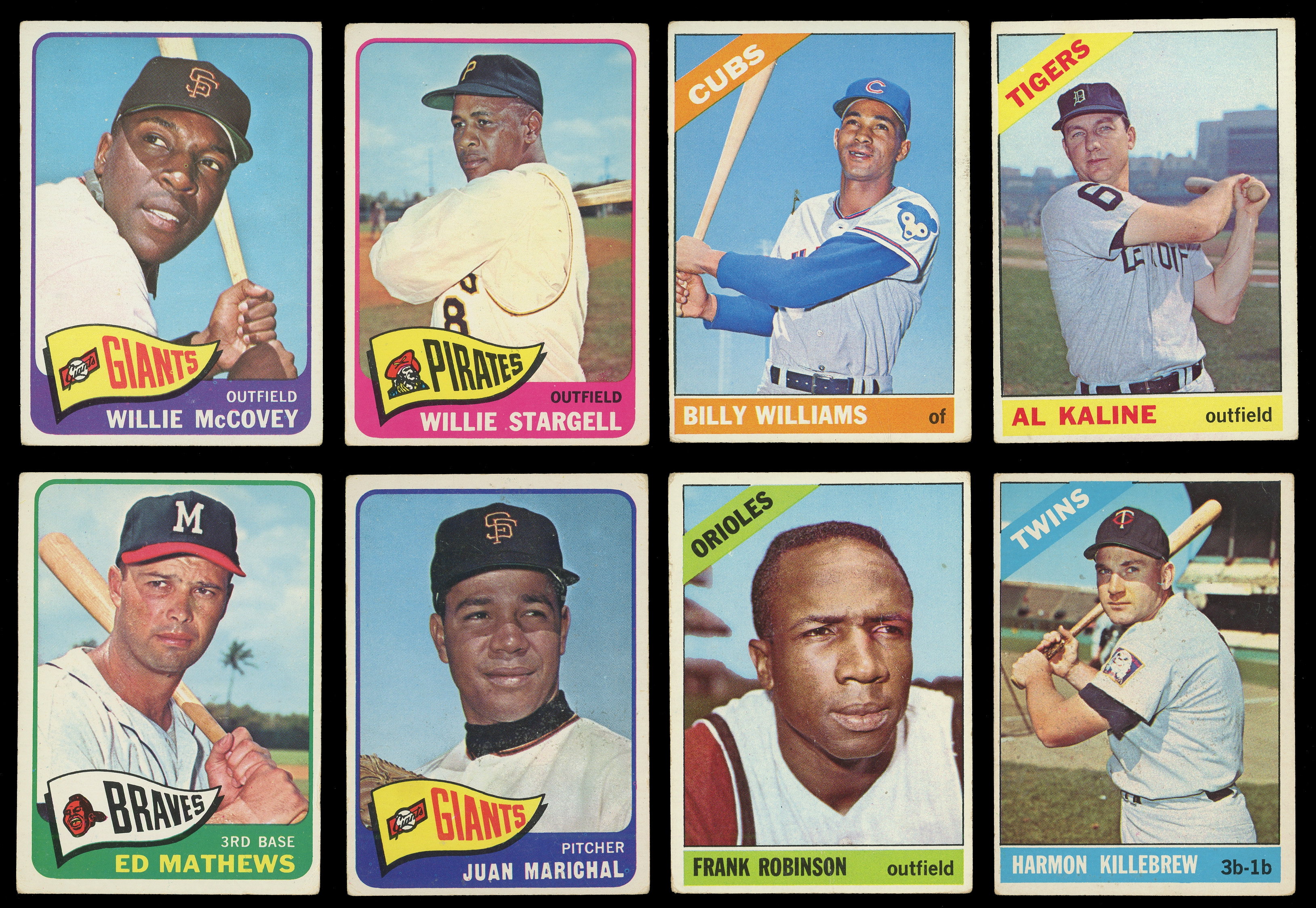 1965 Topps: (133 cards, average GD) with #50 Marichal (GD), #134 Mantle WS (FR), #160 Clemente (VG), #170 Aaron (GD), #176 McCovey (GD), #250 Mays (GD), #377 Stargell (GD), #477 Carlton RC (GD), #500 Mathews (GD), #513 Yankees Team (FR), #551 Mets Team (GD);