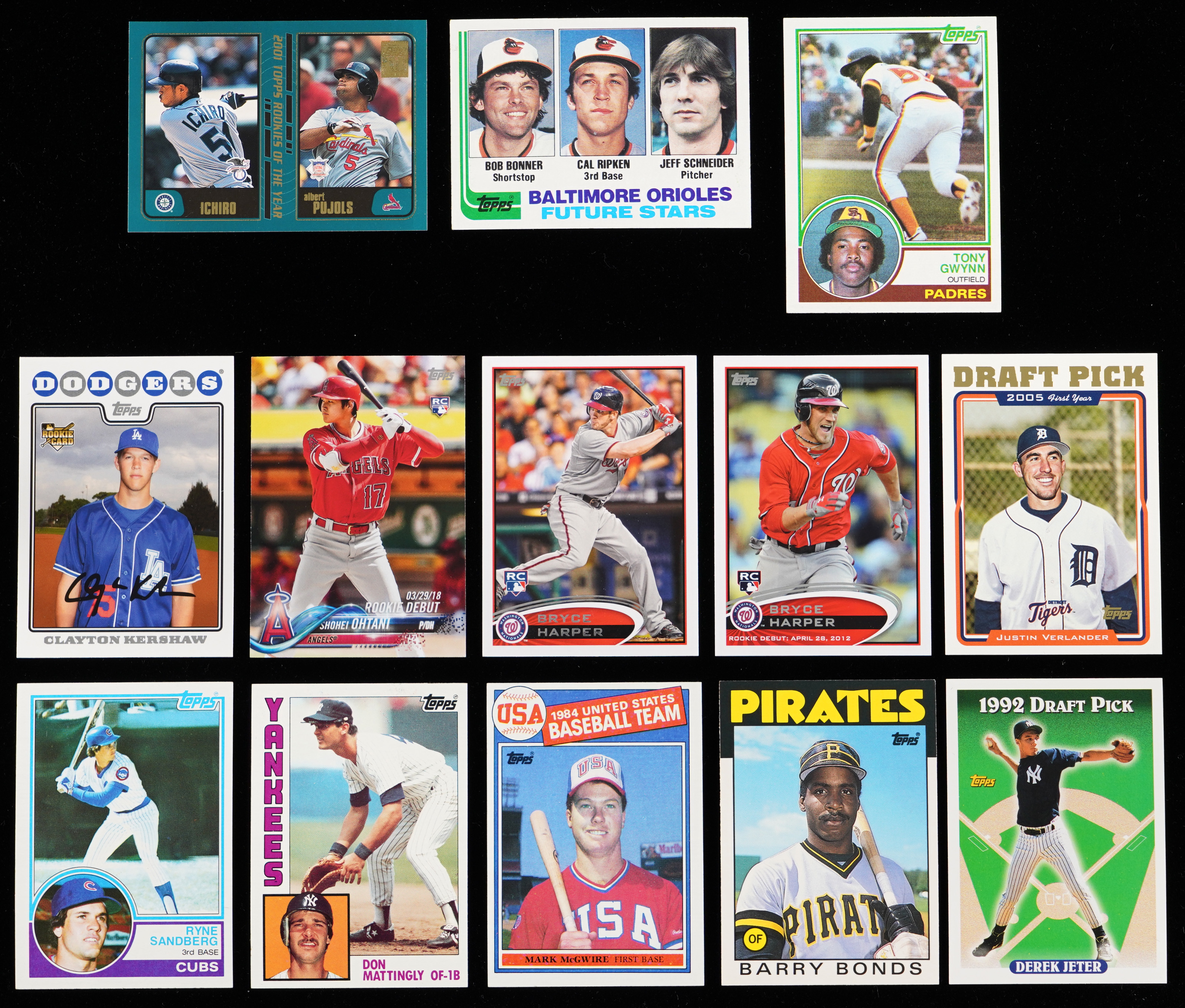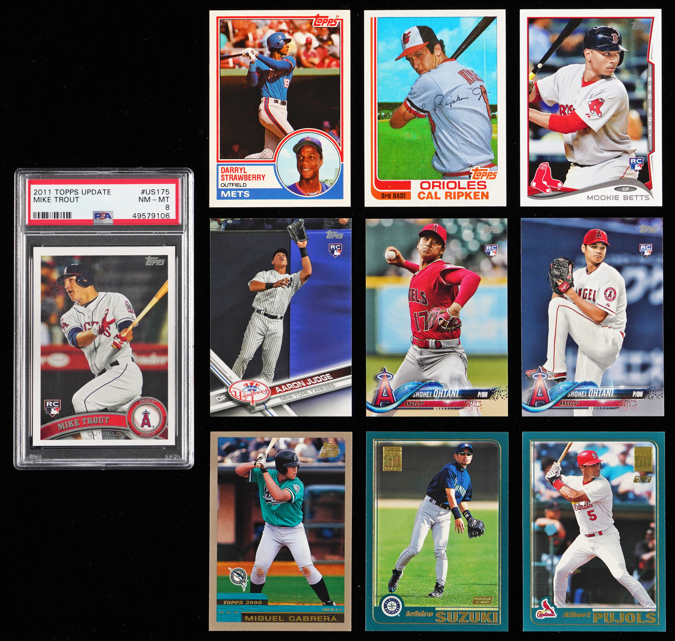 1982 Topps #21 Ripken RC, 1982 Topps Traded #98T Ripken RC, 1983 Topps: #83 Sandberg RC, #482 Gwynn RC, #498 Boggs RC; 1983 Topps Traded #108T Strawberry RC, 1984 Topps #8 Mattingly RC, 1985 Topps #401 McGwire RC (EX-MT), 1986 Topps Traded #11T Bonds RC, 1993 Topps #98 Jeter RC, 2000 Topps Traded #T40 M. Cabrera RC, 2001 Topps #726 I. Suzuki RC, 2001 Topps Traded: #T99 I. Suzuki/Pujols RC, #T247 Pujols RC; 2005 Topps #677 Verlander RC, 2008 Topps Update #UH240 Kershaw RC, 2011 Topps Update #US175 Trout RC (PSA NM-MT 8), 2012 Topps #661 Harper RC, 2012 Topps Update #US183 Harper RC, 2014 Topps Update #US-126 Betts RC, 2017 Topps #287 Judge RC, 2018 Topps #700 Ohtani RC, 2018 Topps Update: #US1 Ohtani RC and #US285 Ohtani RC.