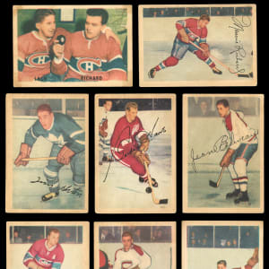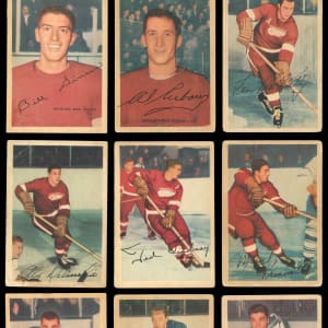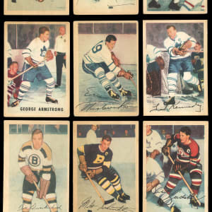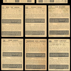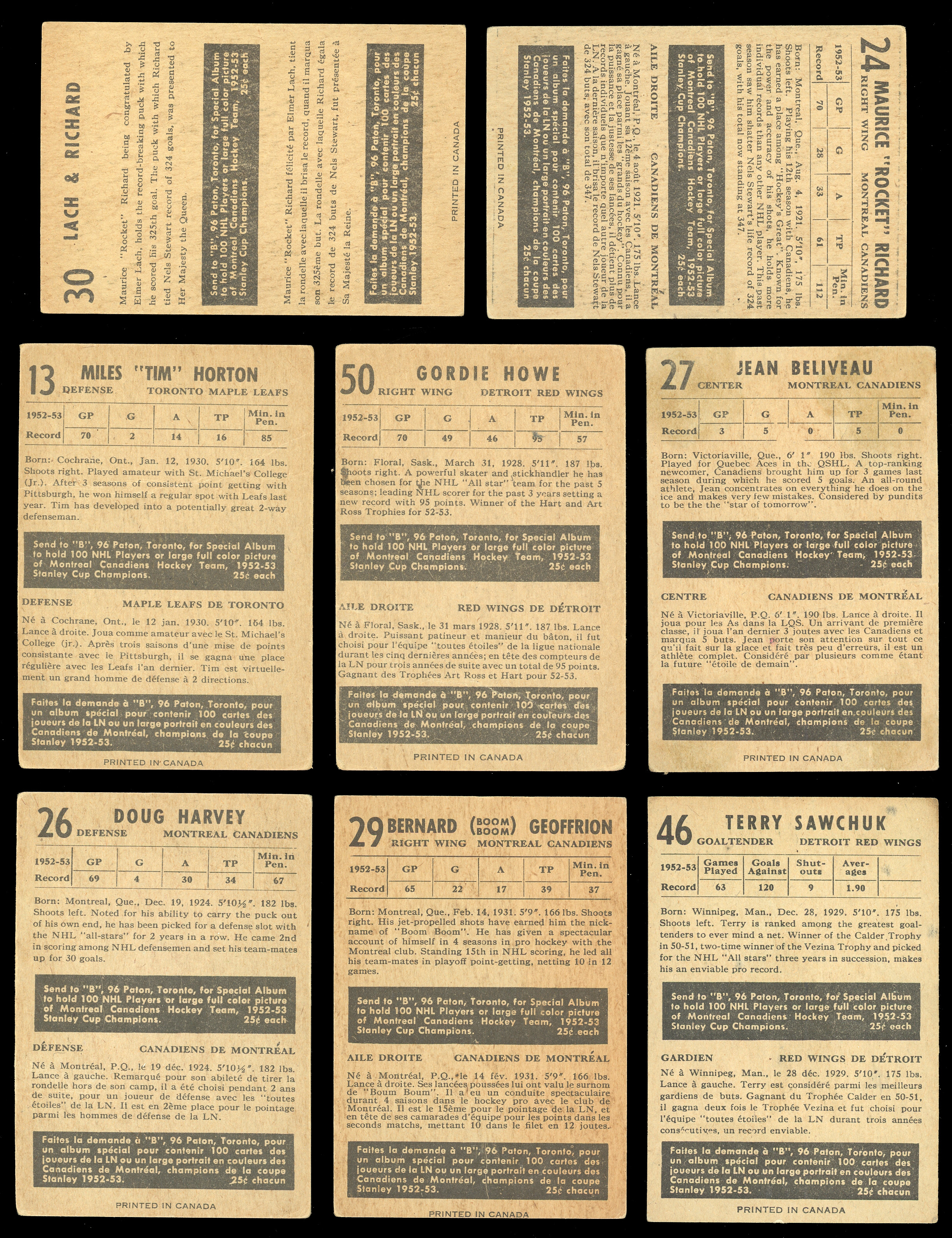 Goal! Score with the offered 1953-1954 Parkhurst Hockey complete set of (100) cards. The overall approximate condition breakdown is as follows: 30% (VG or better), 50% (GD) and 20% (FR or lesser) with approximately 10% displaying reverse paper loss/residue and/or writing. Featured are: #1 Lumley (PR, reverse writing), #7 Kennedy (GD), #10 Nesterenko RC (GD), #11 Armstrong (FR), #13 Horton (GD), #24 M. Richard (GD), #25 McNeil (FR, reverse residue), #26 Harvey (GD), #27 Beliveau RC (GD), #28 D. Moore (FR), #29 Geoffrion (VG), #30 Lach/Richard (FR, tape residue), #31 Lach (GD), #37 Arbour RC (GD), #38 Dineen RC (GD), #40 R. Kelly (GD), #41 Pronovost (GD), #46 Sawchuk (VG), #47 Delvecchio (FR), #50 Howe (GD), #52 Lindsay (FR), #53 Worlsey RC (PR, reverse writing), #56 Bathgate RC (GD), #57 Howell RC (GD), #76 Gadsby (GD, stain), #92 Schmidt (PR, reverse residue) and #100 Quackenbush (GD).