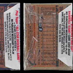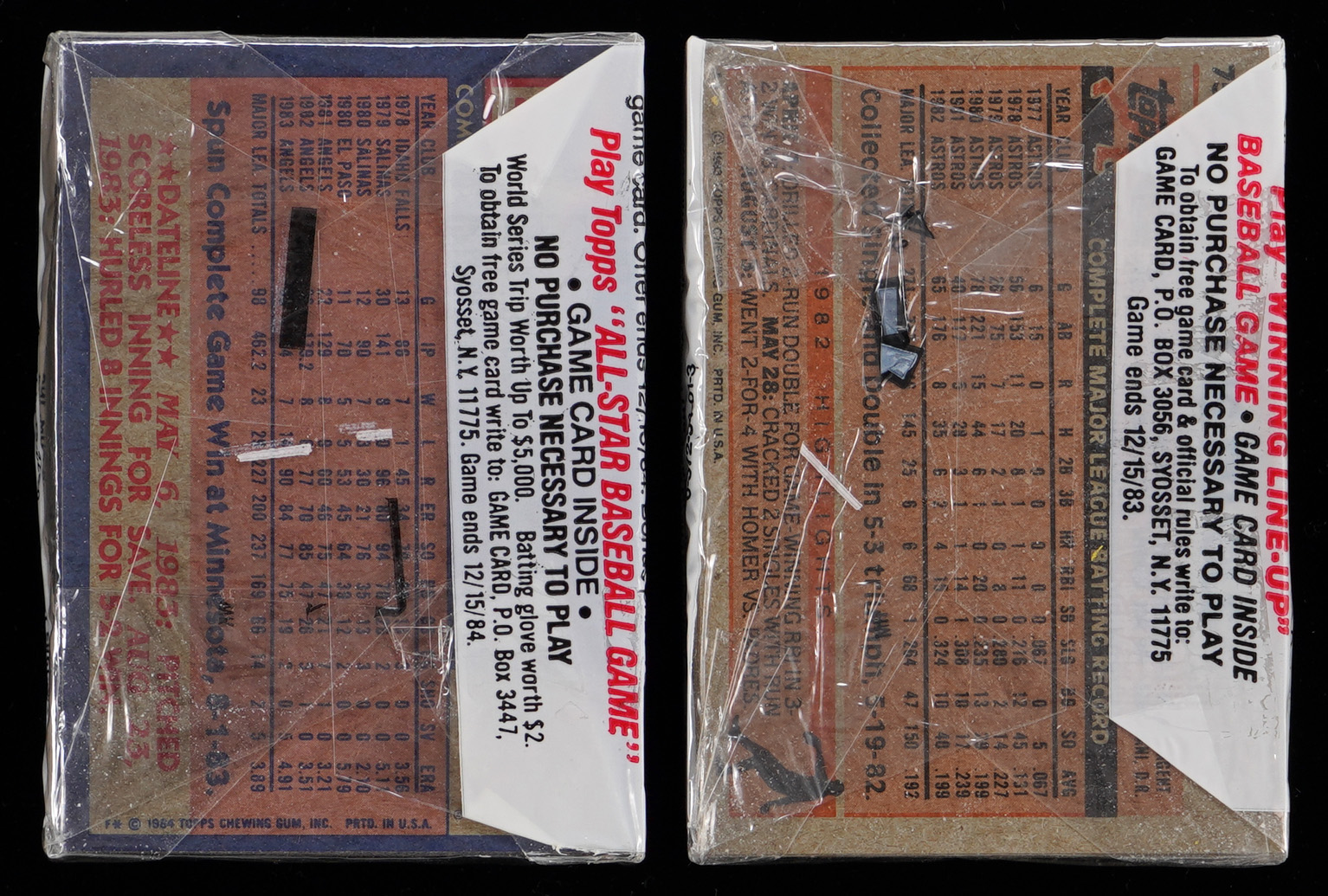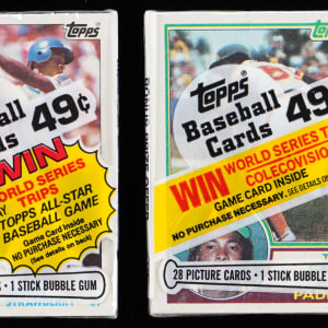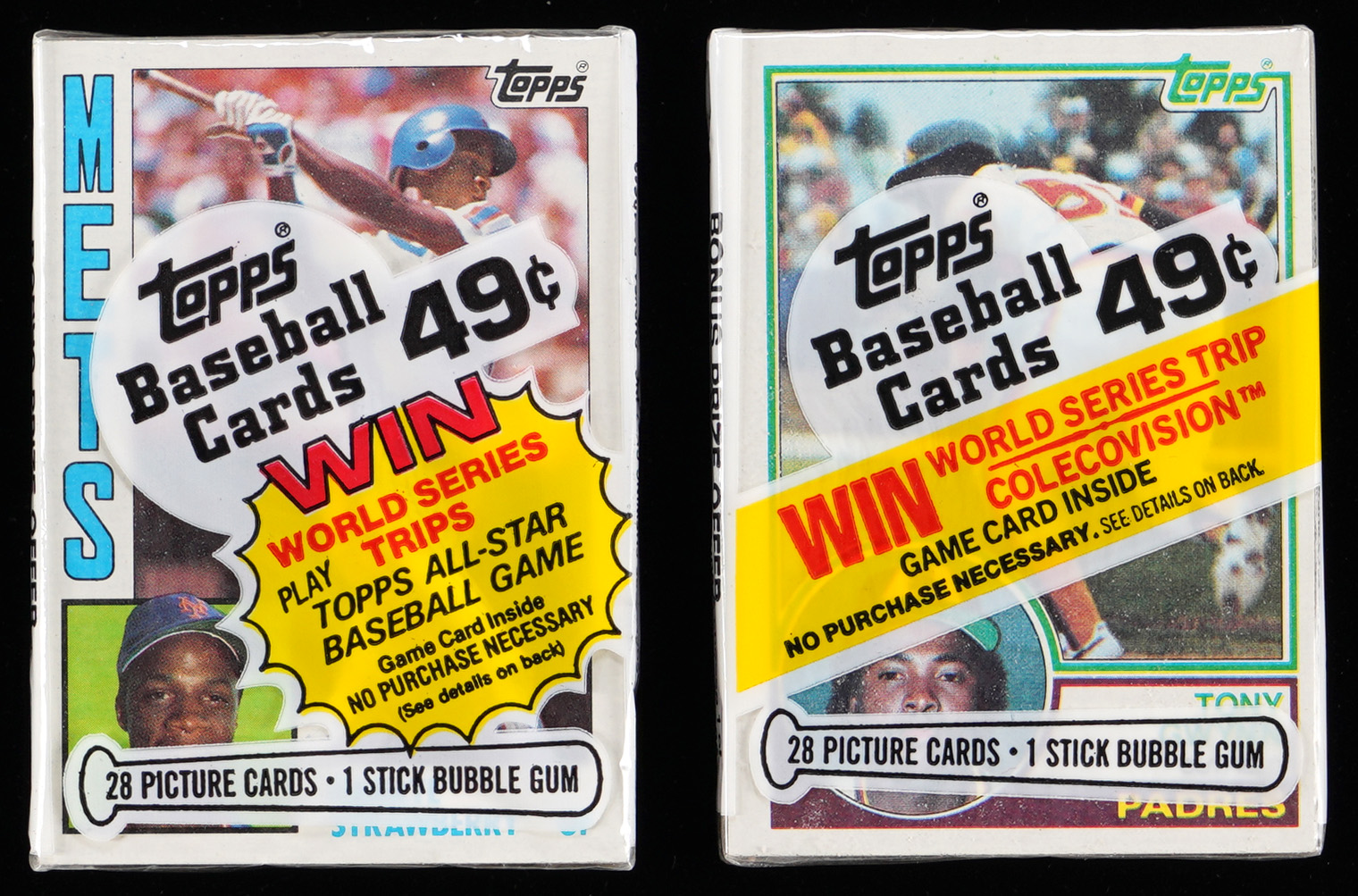 National League stars crown the offered pair of 1983 and 1984 Topps unopened cello packs. Each unopened pack includes 28 cards plus a stick of bubble gum per. Includes: 1.) 1983 Topps cello pack (Tony Gwynn RC front) and 2.) 1984 Topps cello pack (Darryl Strawberry RC front). Steve Hart of the Baseball Card Exchange (the leading authority on unopened material) has personally reviewed these packs, and in his opinion, they are original and unopened.