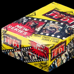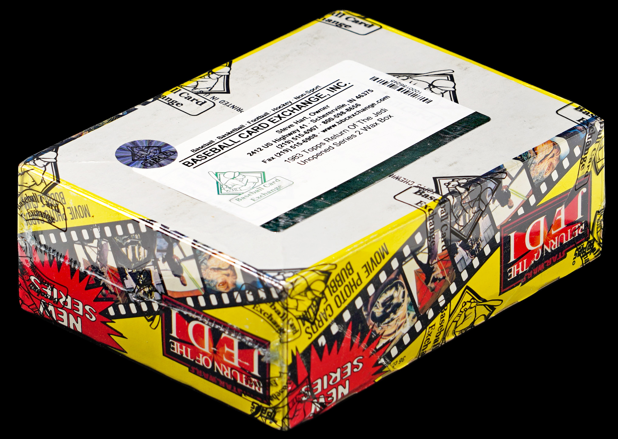 Whip out your lightsabers and battle for the offered 1983 Topps Return of the Jedi unopened wax box. This third installment of the Star Wars series delivers (36) 10-card packs plus a sticker and stick of bubble gum per. Seize a complete 132-card set and other high-grade singles! The entire box comes shrink-wrapped by Baseball Card Exchange (owned by Steve Hart, the foremost expert on unopened material).