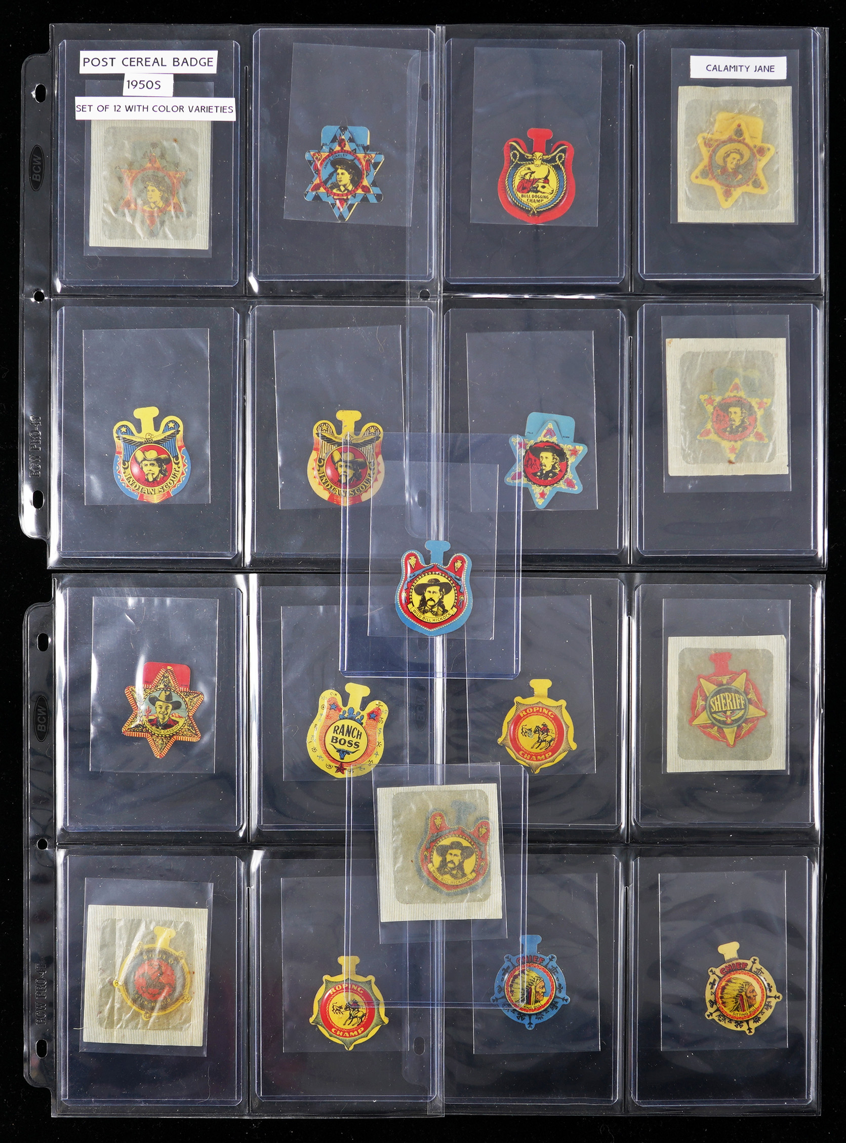 Round-up the offered 1950s Post Cereal Raisin Bran Western Badges complete set of (12) prizes (with color variations) plus six sealed/unopened examples. This rootin' tootin' tin-based badge compilation has survived the decades in fantastic high-grade condition. Includes: (2) Annie Oakley (one unopened), (2) Buffalo Bill (different color variations), Bull Dogging Champ, Calamity Jane (unopened), (2) George Custer (one unopened), Hopalong Cassidy, Ranch Boss, Rodeo Trick Rider (unopened), (2) Roping Champ, Sherriff, (2) Sitting Bull (different color variations) and (2) Wild Bill Hickock (one unopened).