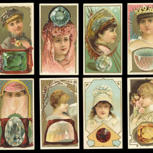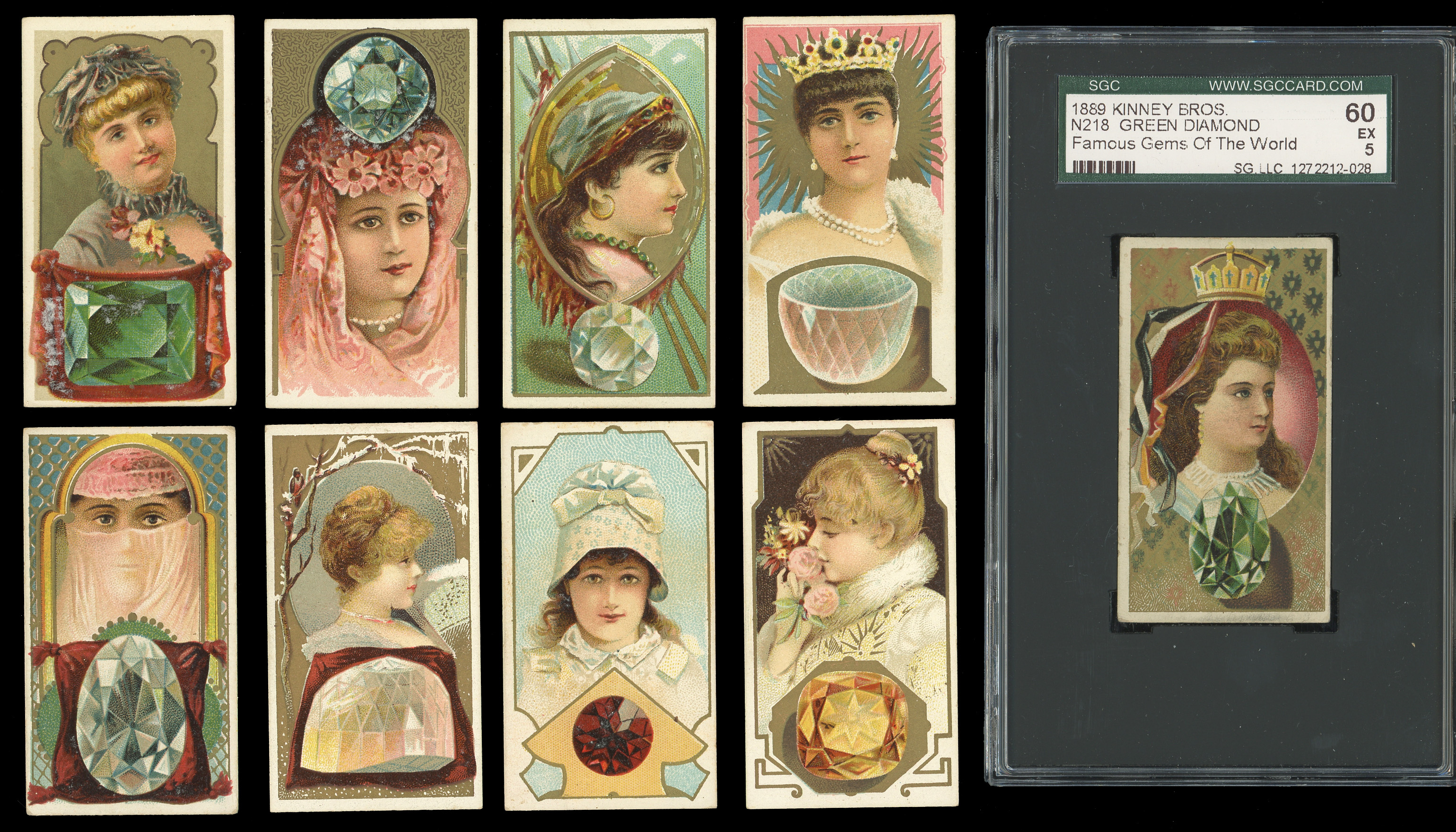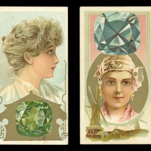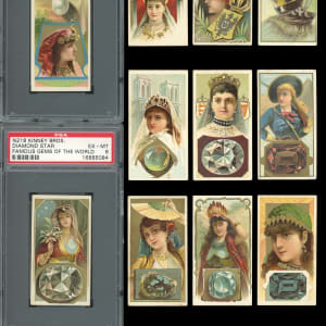 Precious 1889 N218 Kinney Brothers Famous Gems of the World near complete set of (24/25) cards with three graded examples. These high-class 136-year-old tobacco cards generally present in the (VG-EX to EX) range with some better or lesser. Only a pair of cards display reverse residue or a pencil checked back. Graded cards include: "Diamond Star" (PSA EX-MT 6), "Green Diamond" (SGC EX 5) and "White Pearl" (PSA EX-MT+ 6.5). Missing only "Rock Crystal of Japan" for completion.