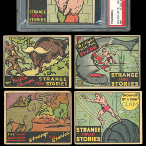 Truth is often stranger than fiction and these five cards from the extremely difficult 1936 R144 Wolverine Gum Strange True Stories set are proof positive of that fact! Includes: #2 "The Buffalo Charges" (VG-EX), #3 "The Fight with the Shark" (VG), #6 "The Price of a Sheep" (PSA Authentic), #9 "Drowned By a Giant Clam" (VG) and #13 "The Mad Elephant" (FR).