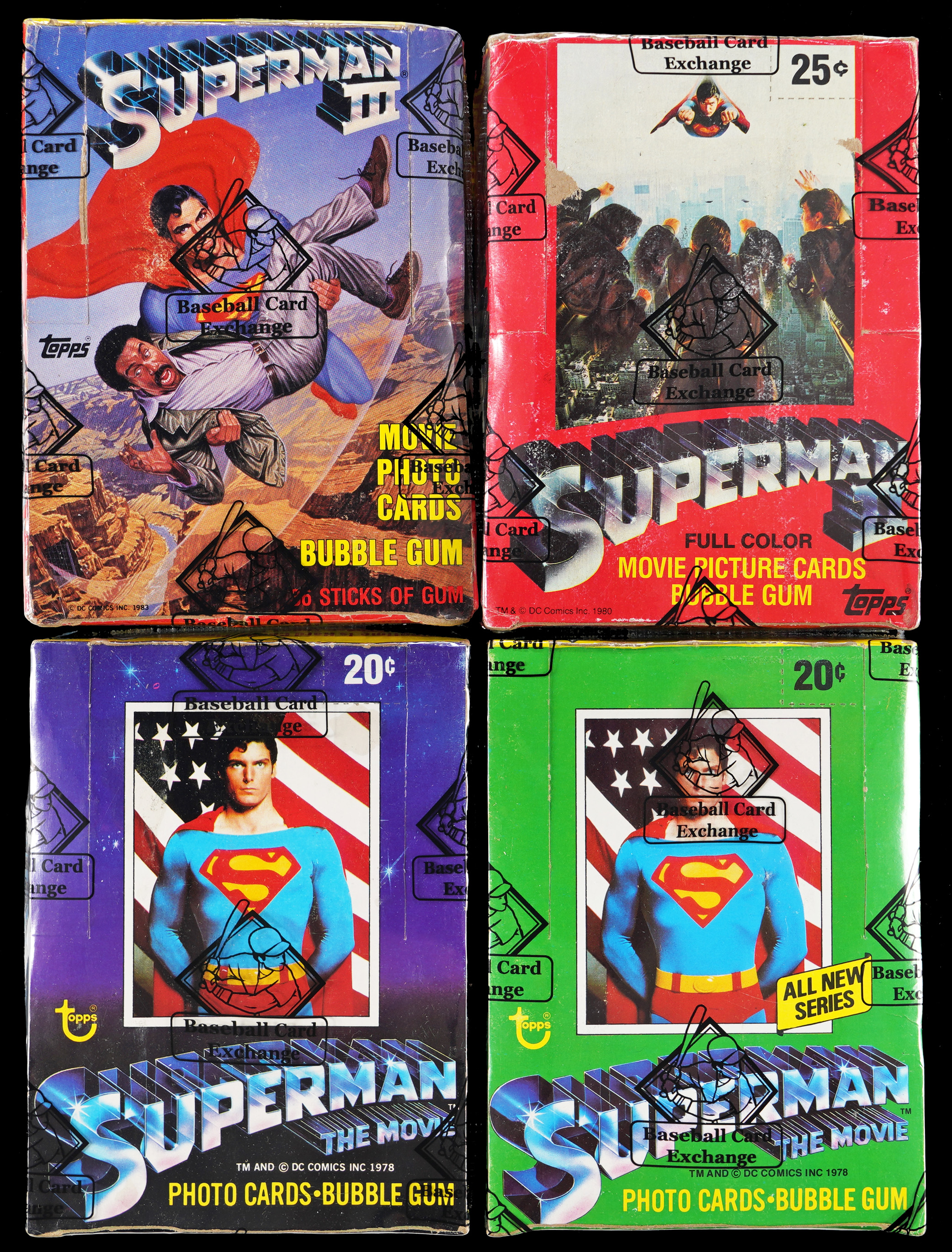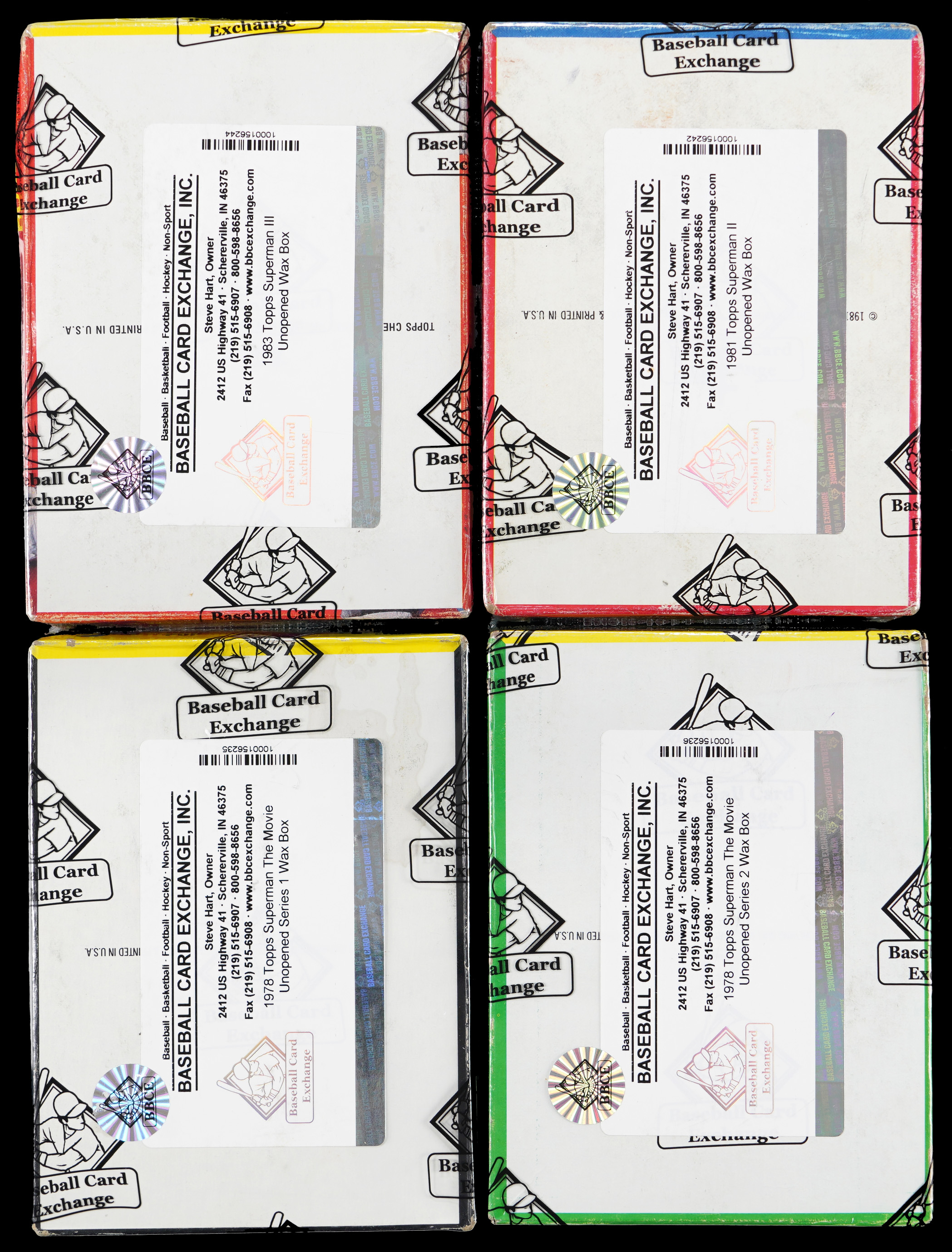 "The Man of Steel" battles for "truth, justice, and the American way" with the offered run of 1978-1983 Topps Superman unopened wax boxes. These 36-pack containers could deliver multiple complete sets. Includes: 1.) 1978 Topps Superman Series 1; 2.) 1978 Topps Superman Series 2; 3.) 1981 Topps Superman II and 4.) 1983 Topps Superman III. Each box comes shrink-wrapped by Baseball Card Exchange (owned by Steve Hart, the foremost expert on unopened material).