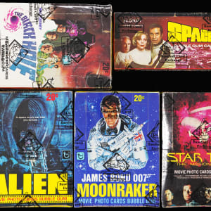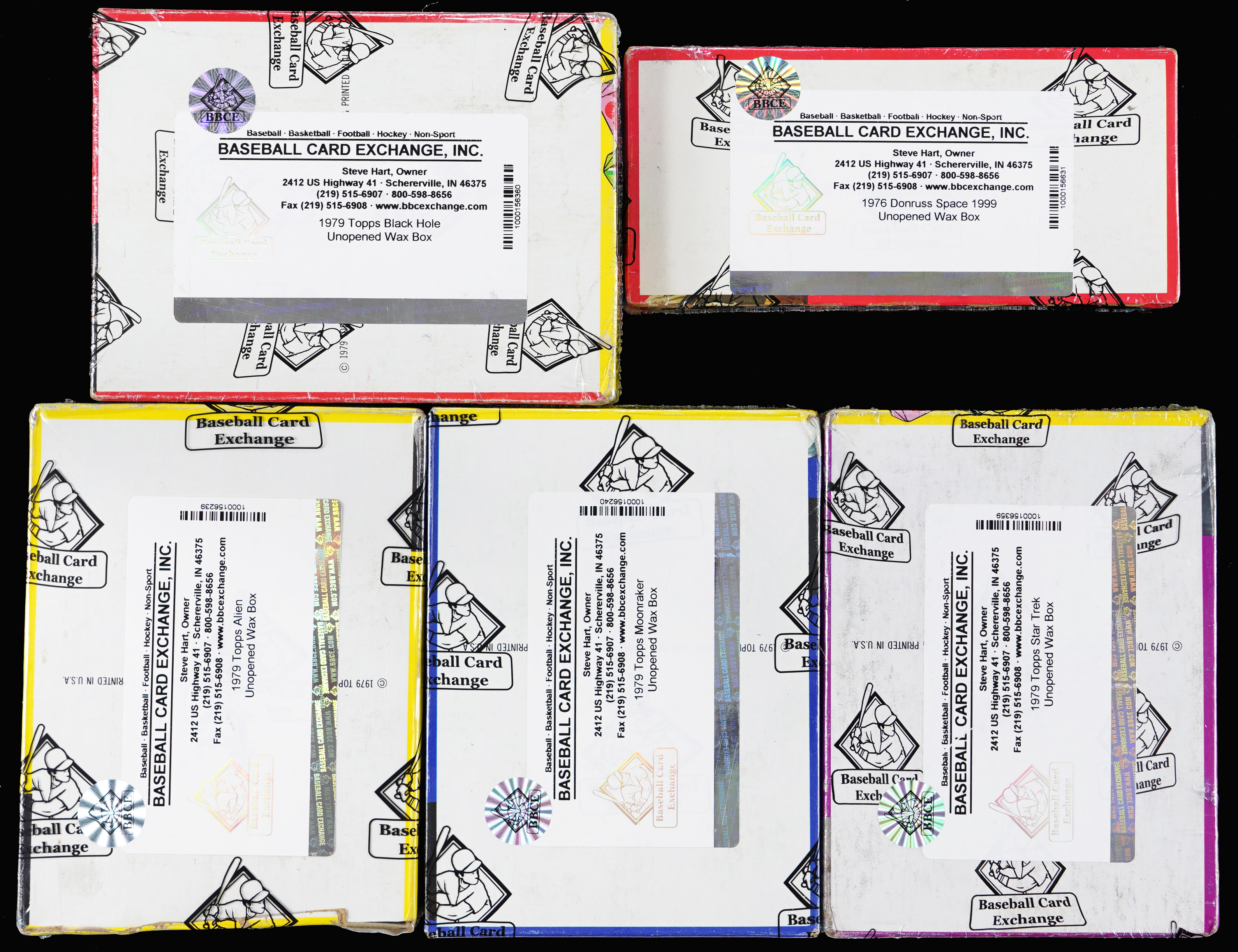 Blast into "the final frontier" with these five 1976-1979 Topps and Donruss space themed unopened wax boxes. Includes: 1976 Donruss Space: 1999, 1979 Topps Alien, 1979 Topps The Black Hole, 1979 Topps Moonraker and 1979 Topps Star Trek. Each box comes shrink-wrapped by Baseball Card Exchange (owned by Steve Hart, the foremost expert on unopened material).