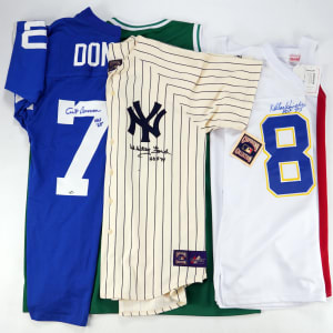 Two of the greatest basketball forwards of all time, two Football Hall of Famers, and one Baseball Hall of Famer are featured in this group of signed throwback/replica jerseys. The jerseys are in great shape, and the signatures are top quality, averaging (“9-10”).