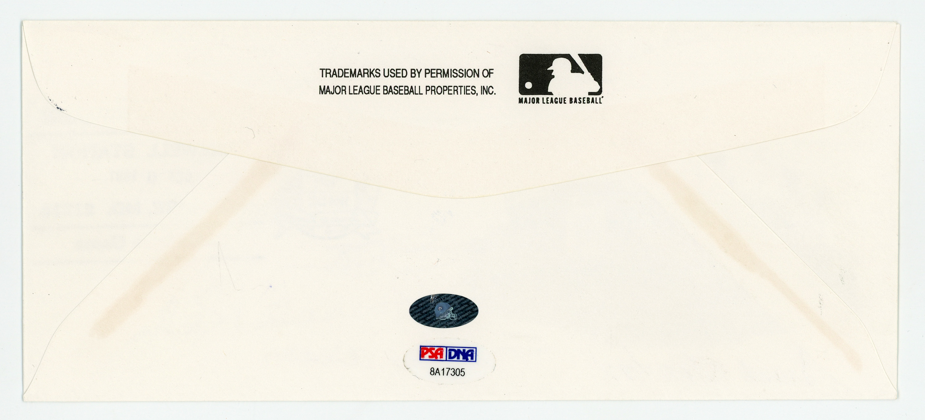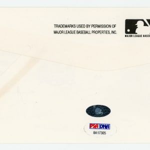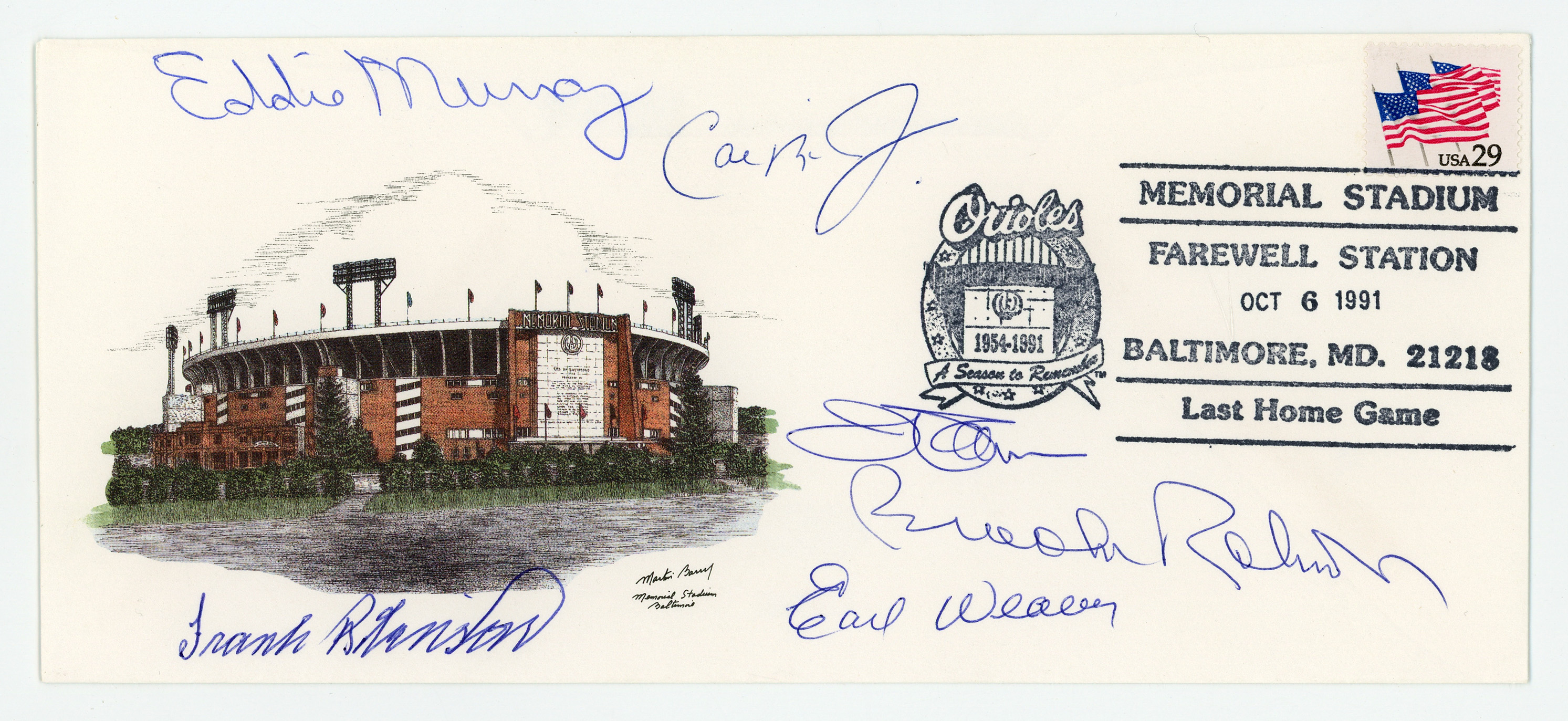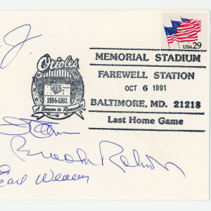 To date, six Baltimore Orioles greats have been enshrined in the Hall of Fame, and the same six are commemorated with bronze statues in the Orioles Legends Park, at their current home, Oriole Park at Camden Yards. All six of these legends are present and accounted for in the signing of this of this Memorial Stadium Farewell Station cachet. Stamp dated 10/6/91 by the USPS, this envelope is adorned with an Orioles commemorative logo, an illustration of venerable Memorial Stadium, and (6) prized Hall of Famer signatures, with: Eddie Murray, Cal Ripken Jr., Frank Robinson, Jim Palmer, Brooks Robinson, and Earl Weaver. The signatures are firm, the envelope is crisp and clean, and the memories are glorious.