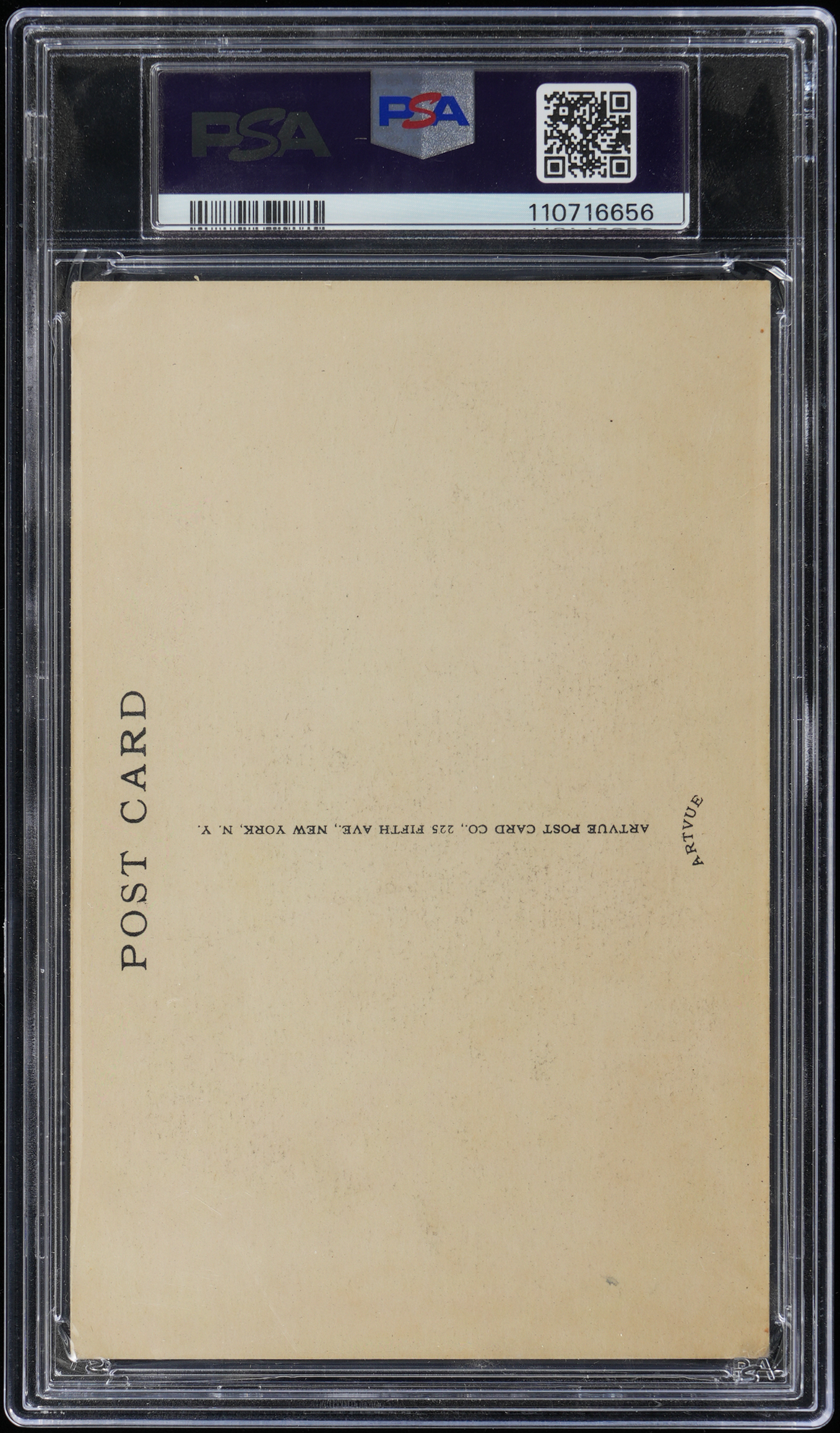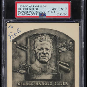 Signature judged Authentic by PSA/DNA and encapsulated by the service. Presented is a 1953-1955 Artvue Hall of Fame Plaque Postcard Type 1 George Sisler autograph. The St. Louis Browns Hall of Famer penned the lower boundary of the (EX-MT) card in blue ink with the endorsement registering a ("9") in both strength and quality. Personalized "To Bob" on the upper left corner.