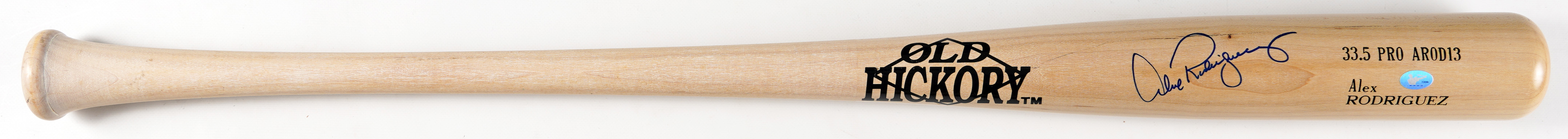The long flowing signature (“9”) by Alex Rodriguez stands out dramatically against the white of this Old Hickory TM Alex Rodriguez model bat. A pretty piece for your ARod collection.